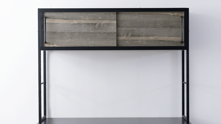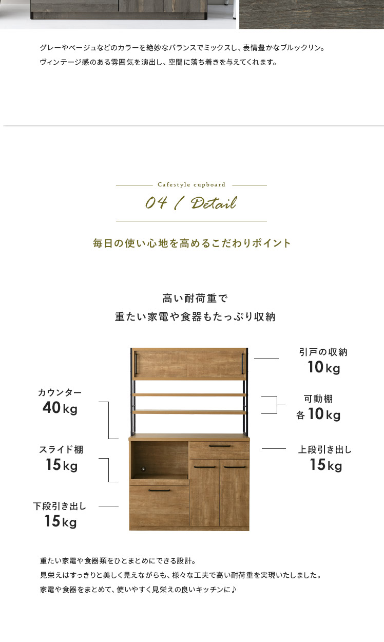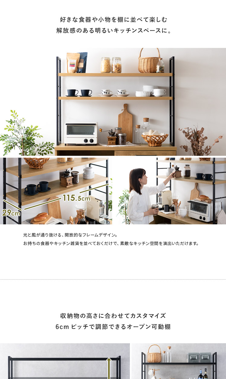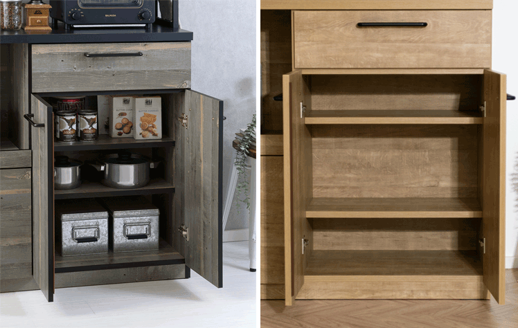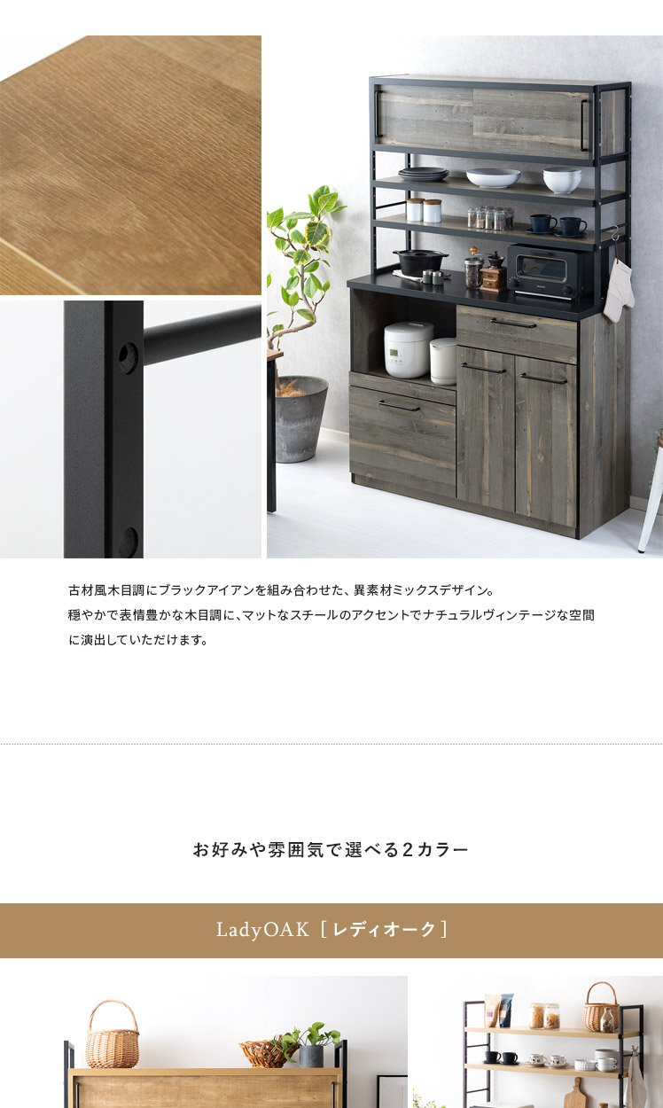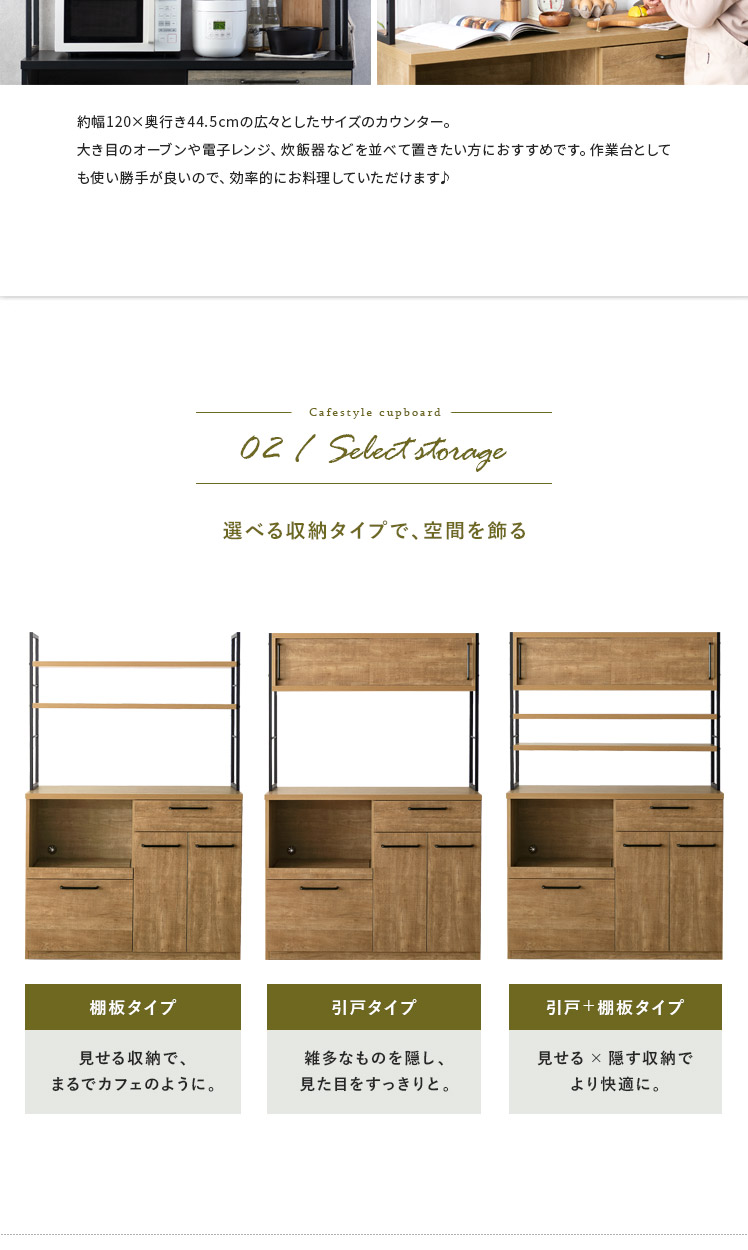 アイアンフレーム食器棚 Markus〔マルクス〕 幅120cm 引戸+棚板タイプ/家電、食器、食品、雑貨などのキッチン用品をこれ一台にまとめながら、映えるキッチンを演出する″Markus(マルクス)″全タイプにフタ付き家電が使えるスライド棚と、カトラリーやキッチン雑貨などの小物から2Lボトルまで入る引き出し&扉収納を備えました。上段の収納は、棚板・引戸・引戸+棚板の3タイプをご用意しました。どのタイプも6cm間隔で可動できるので、使いやすい位置に自由に設置し、より快適にお使いいただけます。