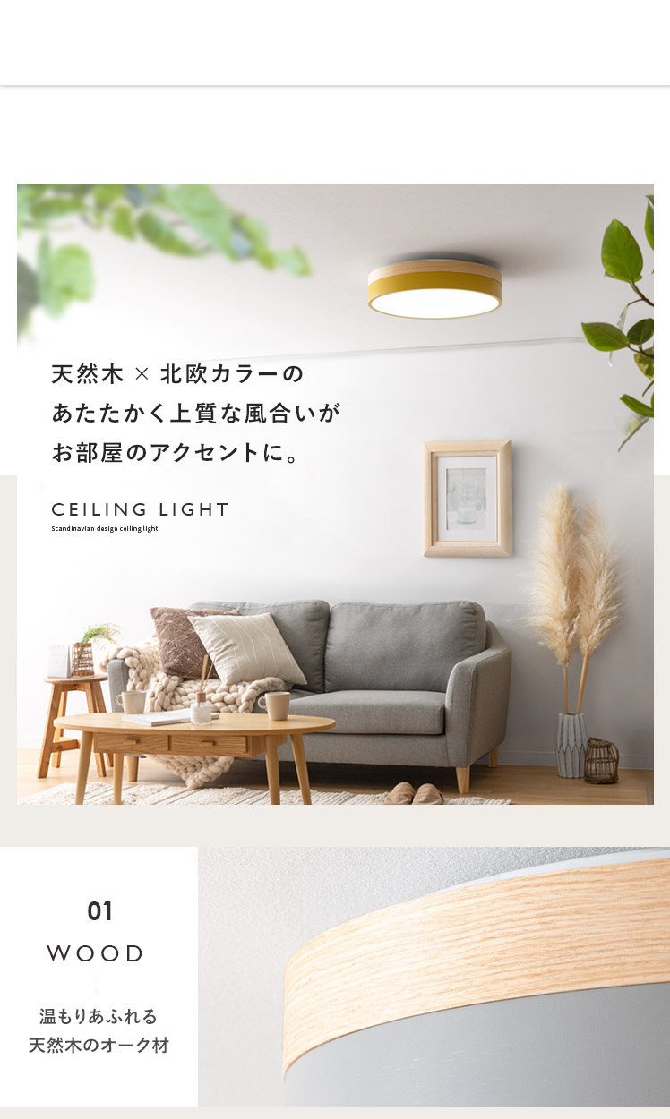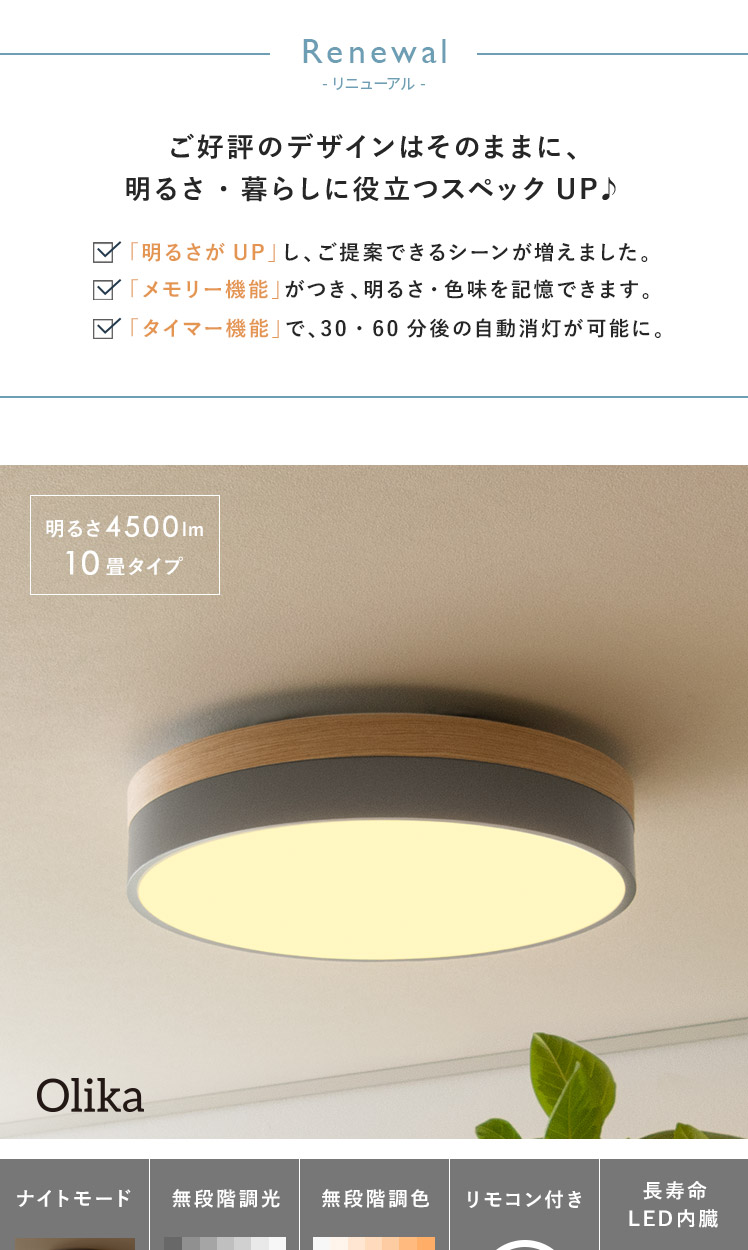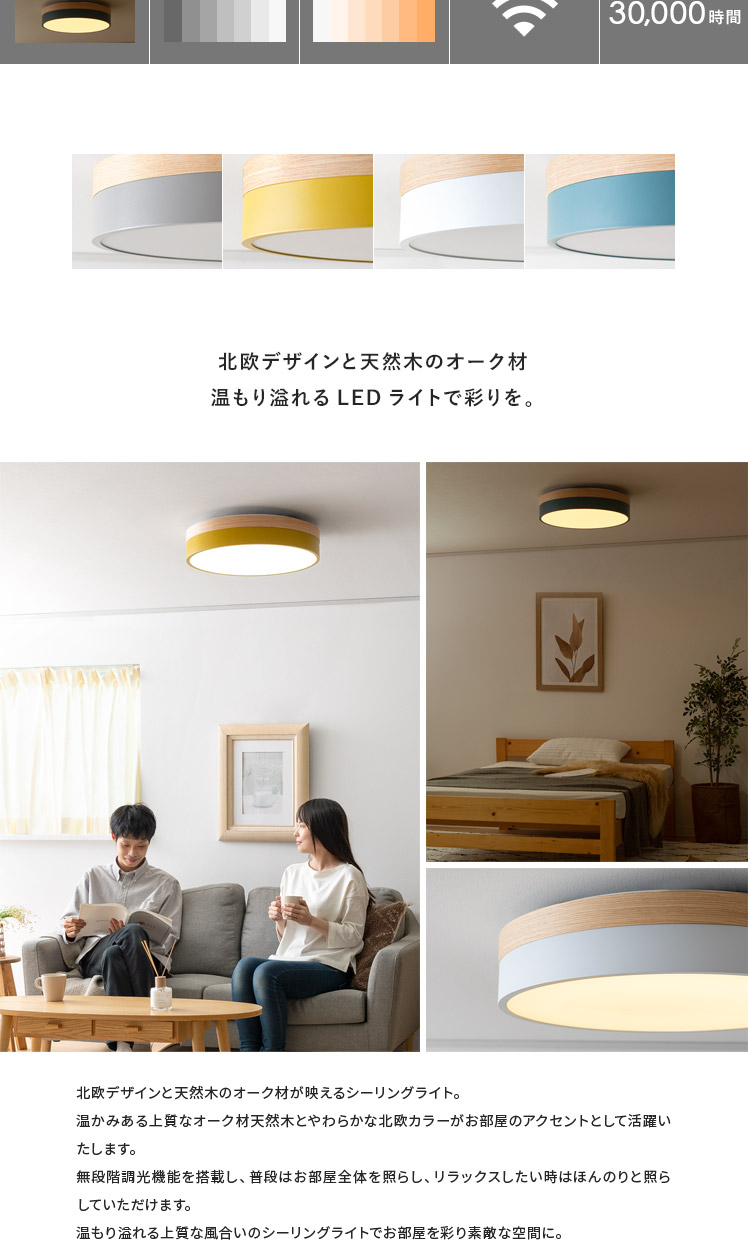 LEDシーリングライト OLIKA〔オリカ〕/北欧デザインと天然木のオーク材が映えるシーリングライト。温かみある上質なオーク材天然木と、やわらかな北欧カラーがお部屋のアクセントとして活躍いたします。無段階調光機能を搭載し、普段はお部屋全体を照らし、リラックスしたい時はほんのりと照らしていただけます。温もり溢れる上質な風合いのシーリングライトでお部屋を彩り素敵な空間に。