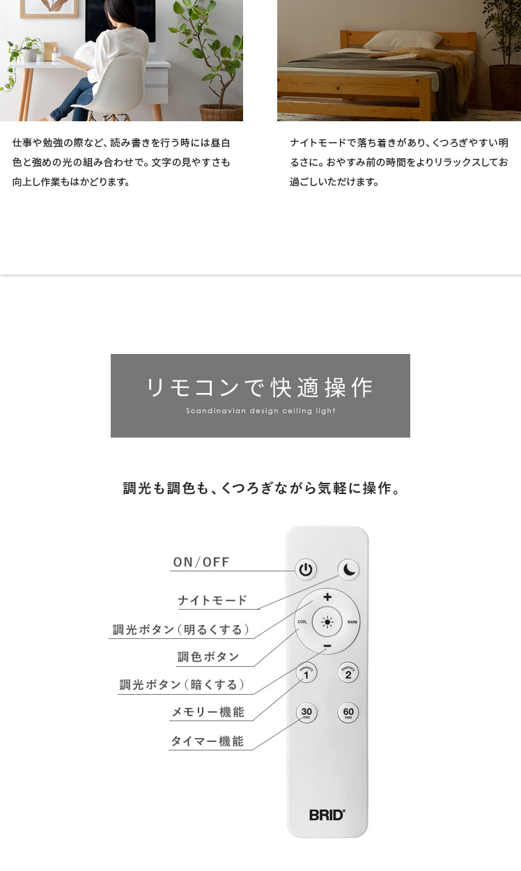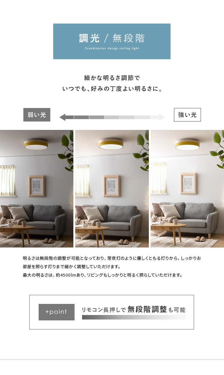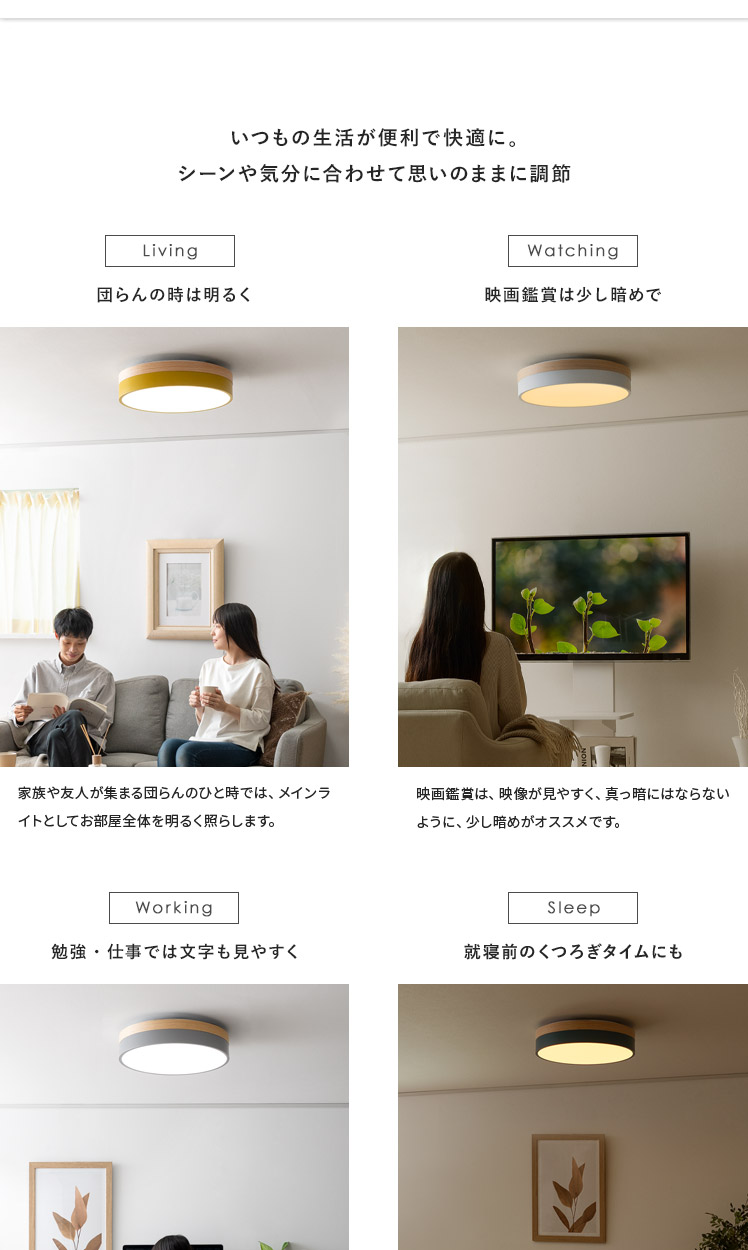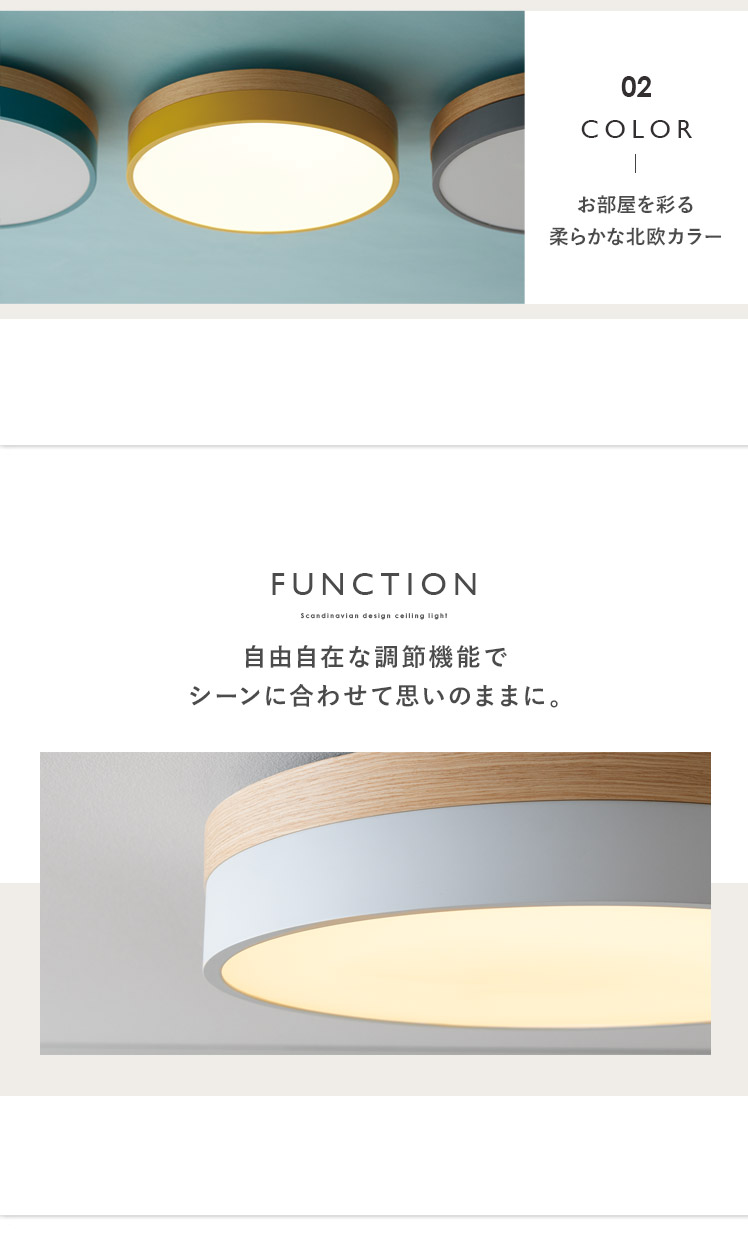 LEDシーリングライト OLIKA〔オリカ〕/北欧デザインと天然木のオーク材が映えるシーリングライト。温かみある上質なオーク材天然木と、やわらかな北欧カラーがお部屋のアクセントとして活躍いたします。無段階調光機能を搭載し、普段はお部屋全体を照らし、リラックスしたい時はほんのりと照らしていただけます。温もり溢れる上質な風合いのシーリングライトでお部屋を彩り素敵な空間に。