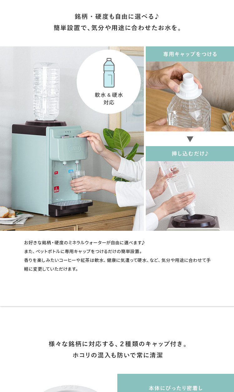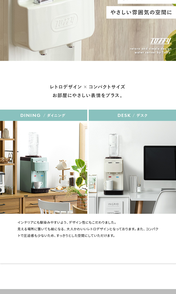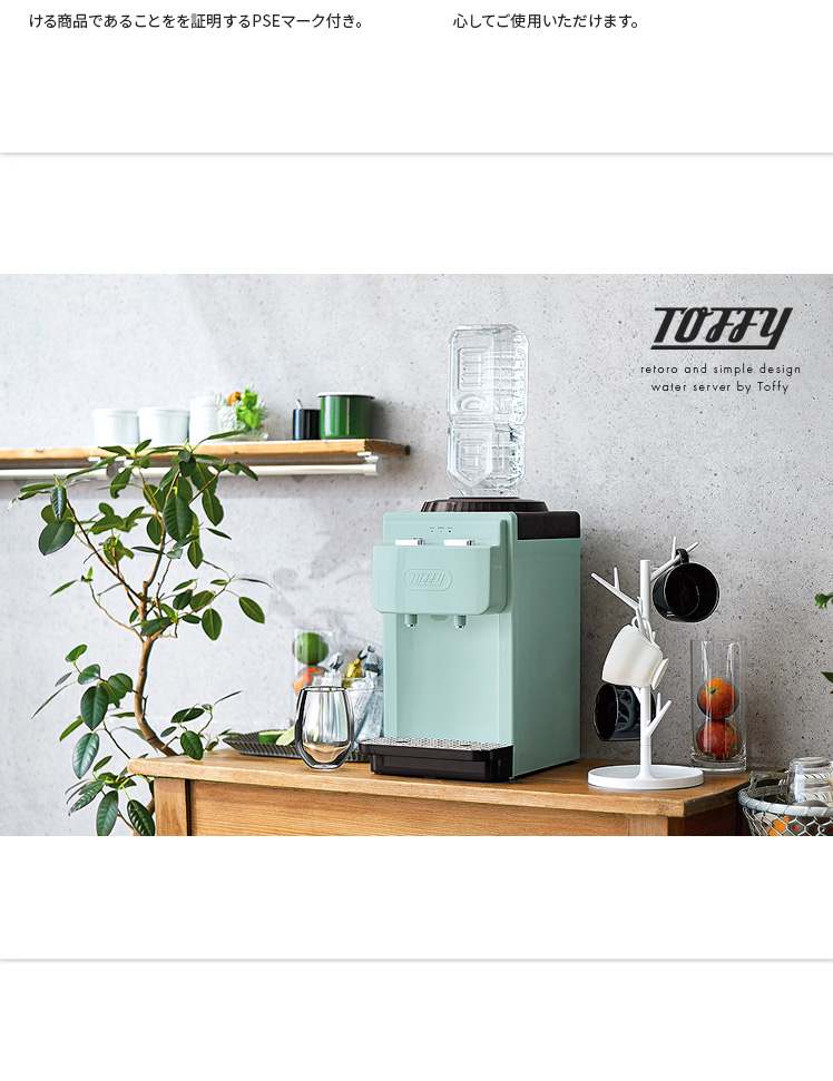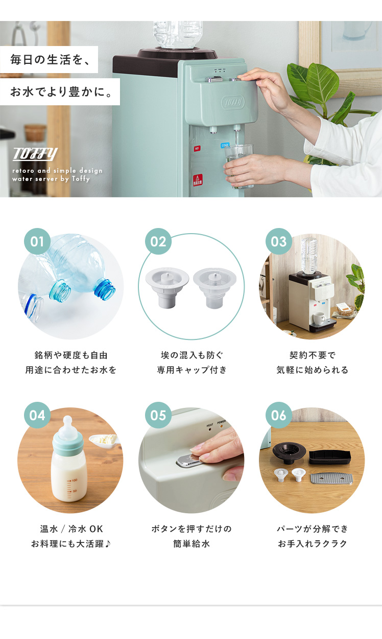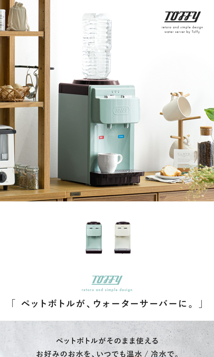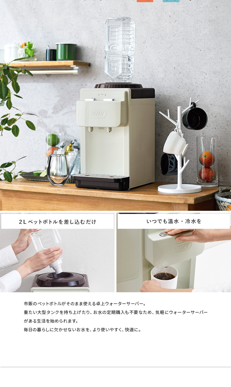 ウォーターサーバー Toffy(トフィー) 卓上型温冷両用タイプ/市販のペットボトルがそのまま使える卓上ウォーターサーバー。重たい大型タンクを持ち上げたり、お水の定期購入も不要なため、気軽にウォーターサーバーがある生活を始められます。毎日の暮らしに欠かせないお水を、より使いやすく、快適に。
