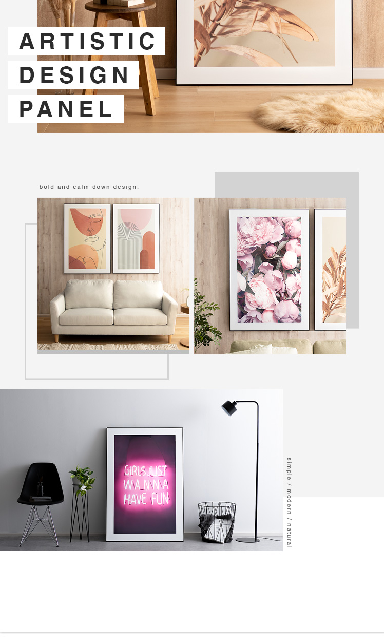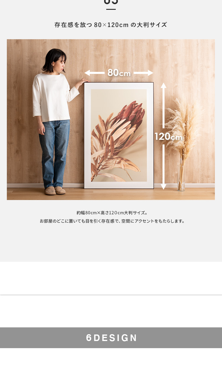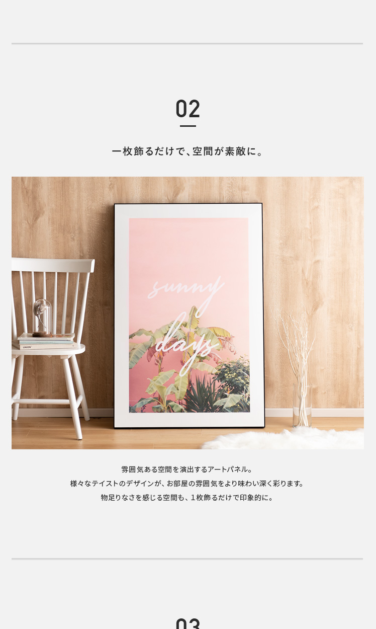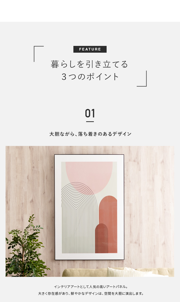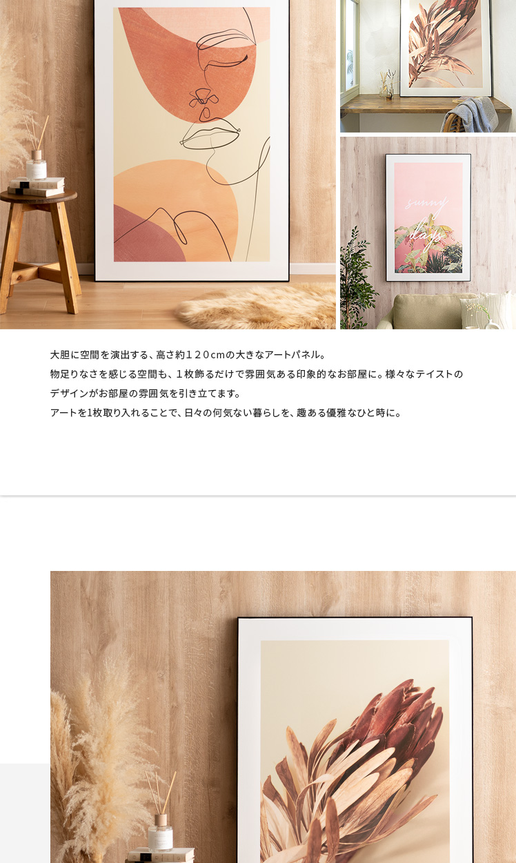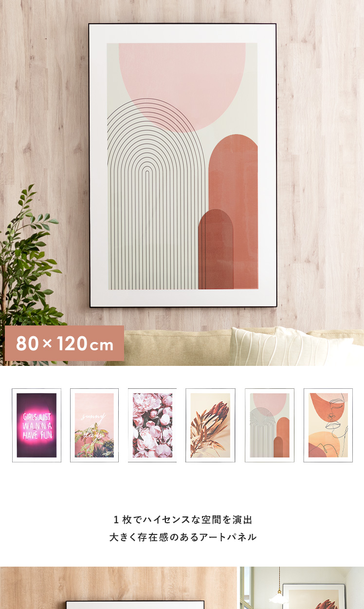アートパネル 80×120cmサイズ/大胆に空間を演出する、高さ約90cmの大きなアートパネル。物足りなさを感じる空間も、1枚飾るだけで雰囲気ある印象的なお部屋に。様々なテイストのデザインがお部屋の雰囲気を引き立てます。アートを1枚取り入れることで、日々の何気ない暮らしを、趣ある優雅なひと時に。