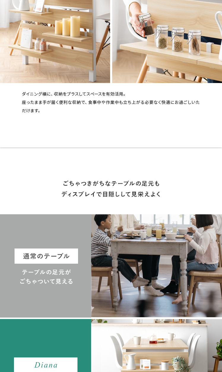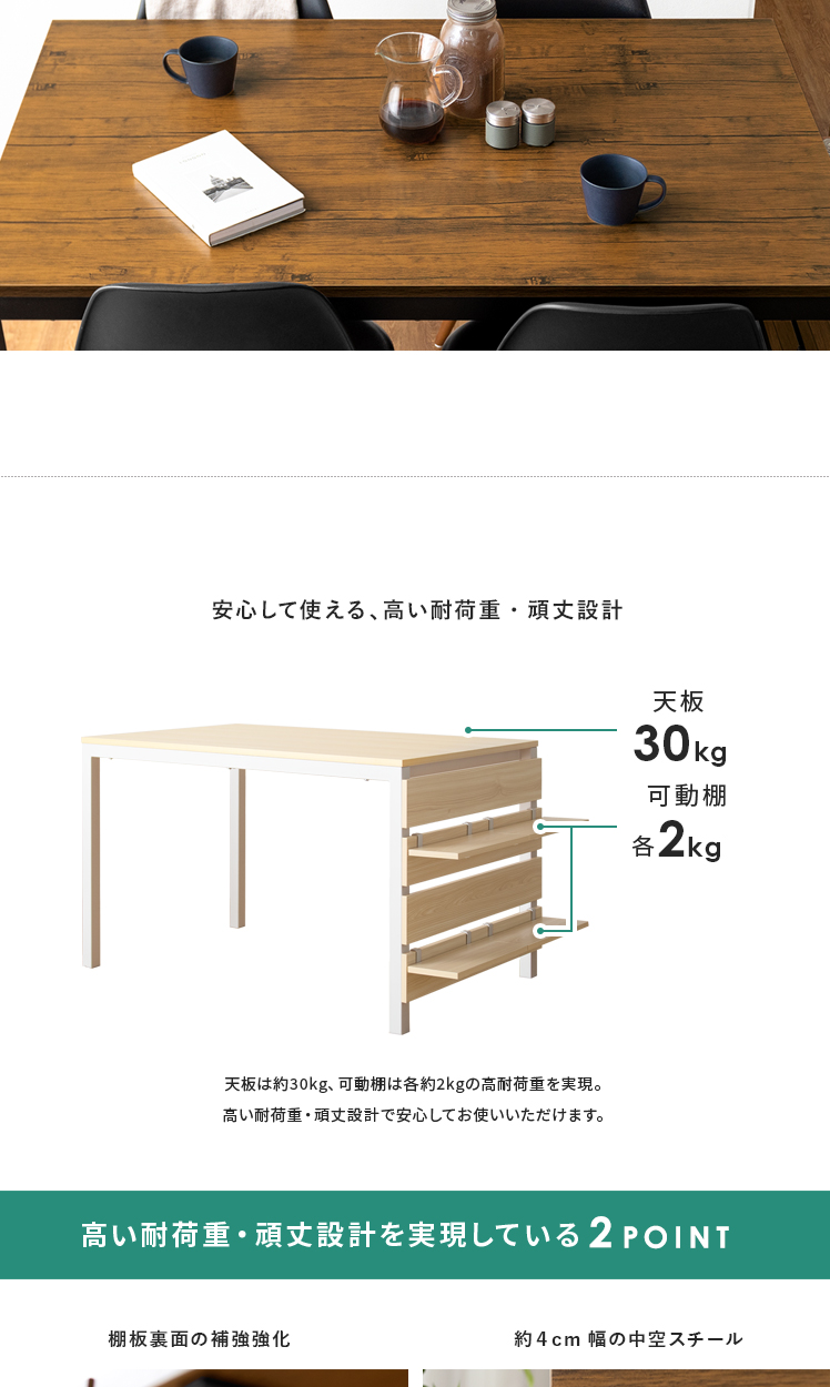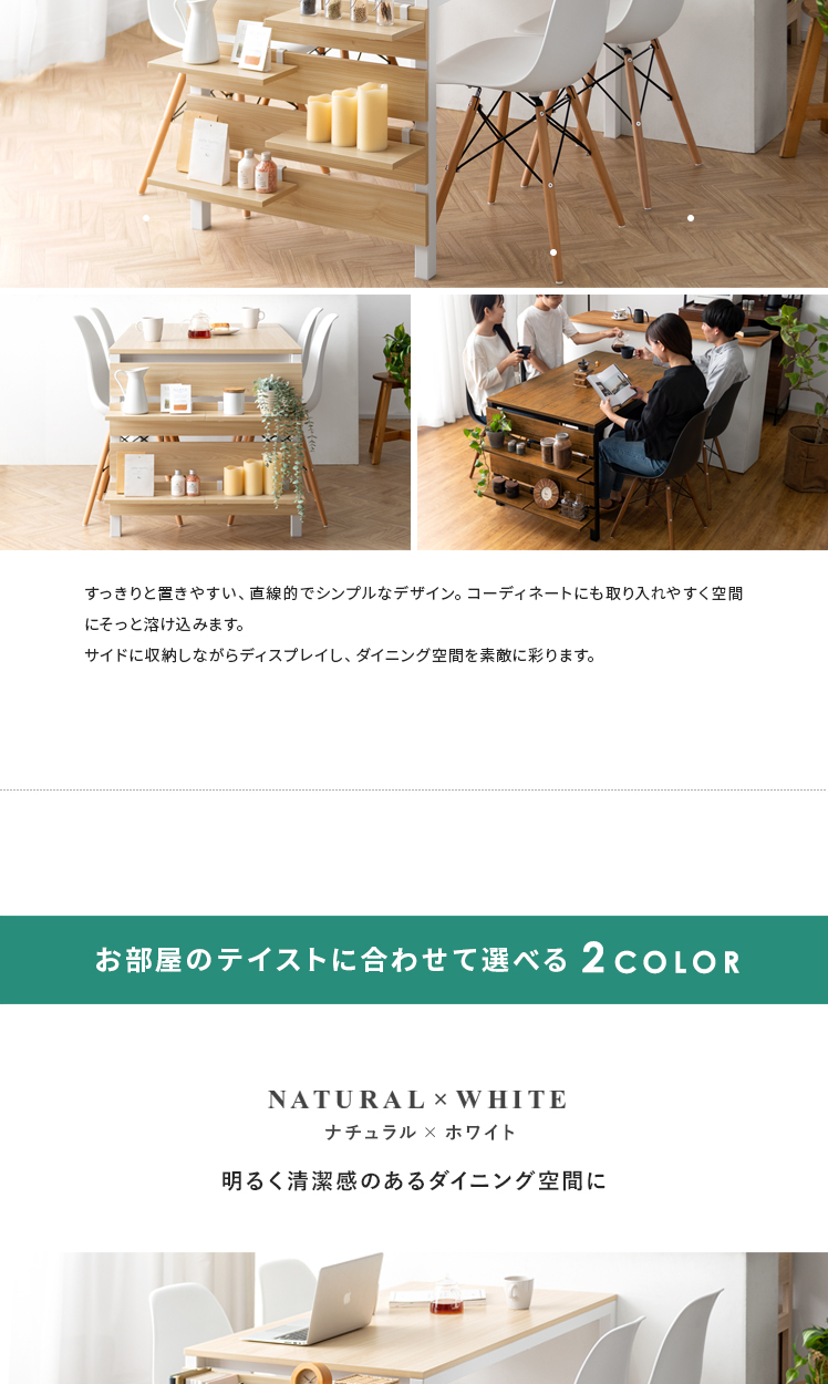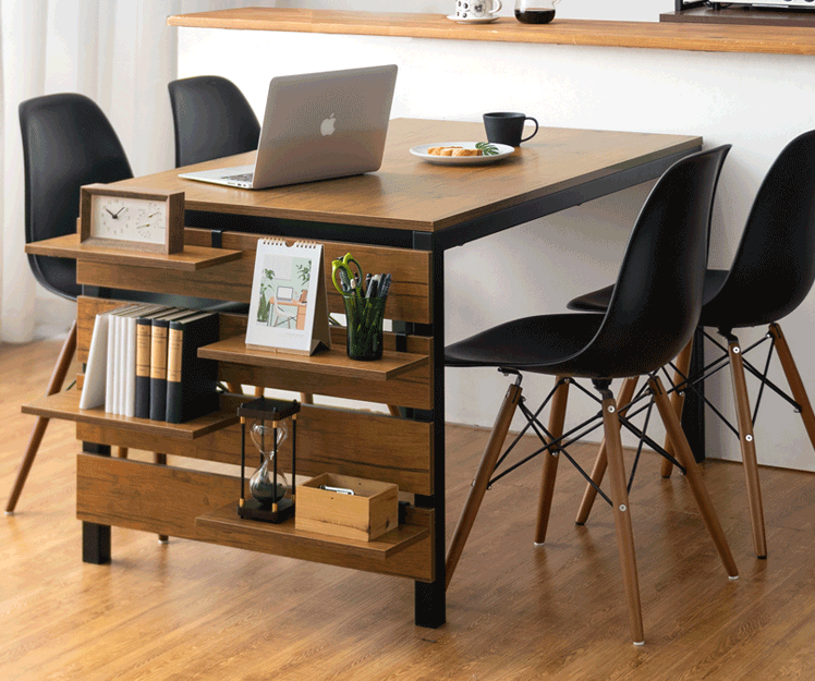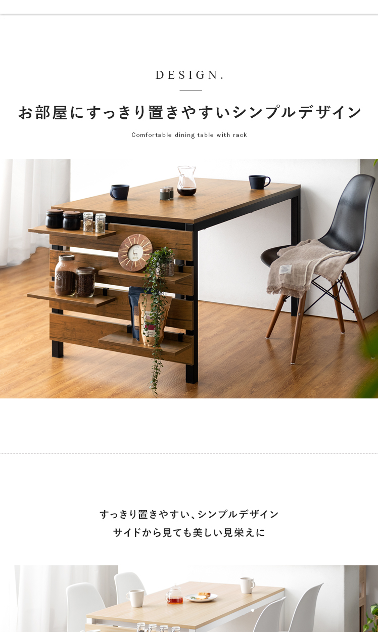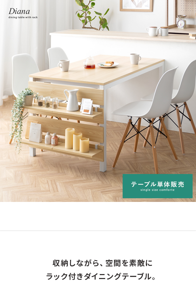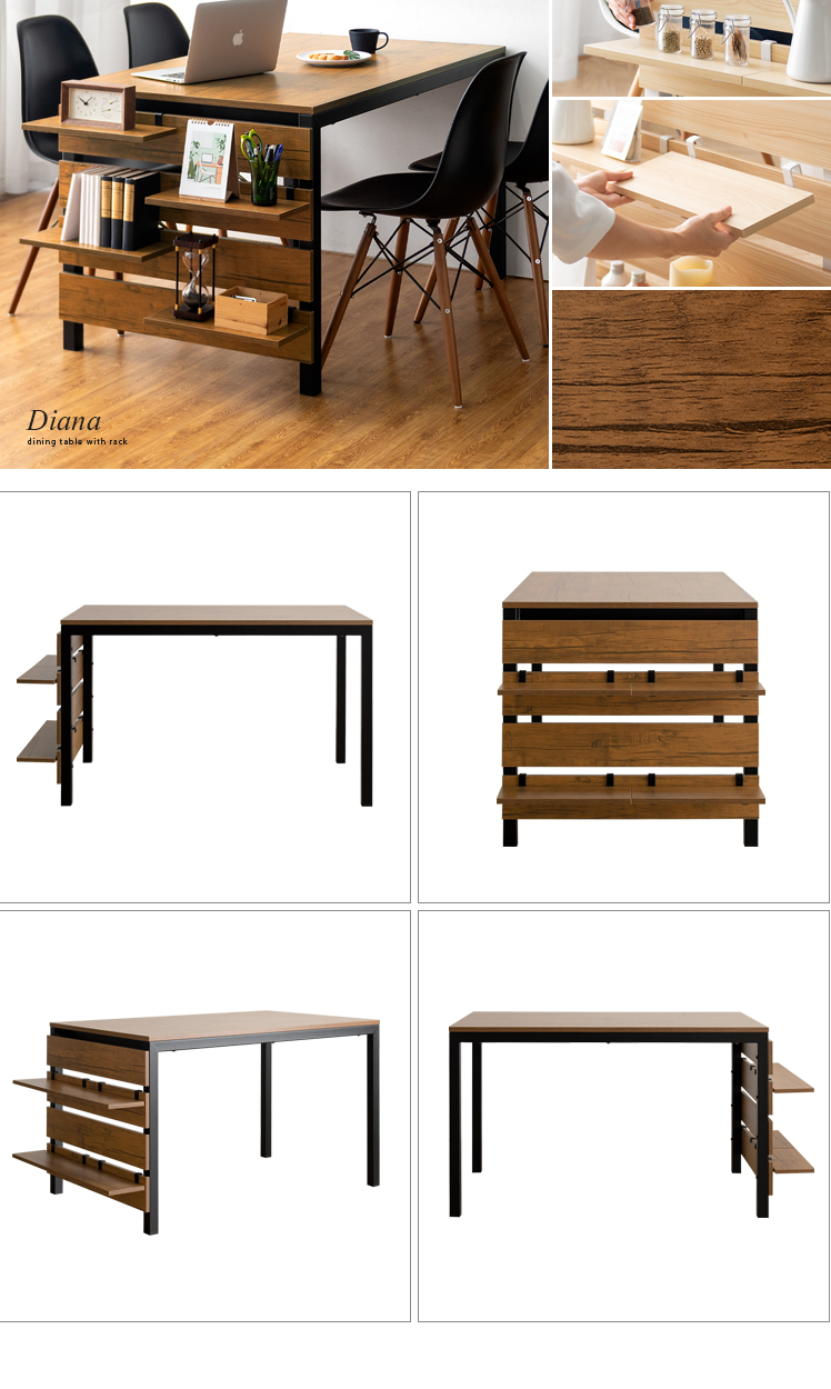 ラック付きダイニングテーブル Diana〔ディアナ〕 テーブル単体販売/収納しながら、空間を飾る可動棚式のラック付きの4人掛けダイニングテーブル“Diana(ディアナ)”お食事やデスク作業中にサッと手が届く便利な収納や、食卓をおしゃれ見せるディスプレイ、足下の目隠しとしても。シンプルで機能的なテーブルで、暮らしを彩り、快適に。