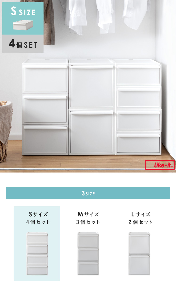 like it〔ライクイット〕クローゼットシステム Sサイズ 4個セット/収納物や使う場所に合わせて、積み重ねたり並べたり。自由に組み合わせやすい収納ケースで、自分だけの収納空間をおつくりいただけます。奥行きは全サイズとも約52cm。クローゼットの中にもすっぽり収まるサイズ感で、置く場所を選びません。また中が透けない不透明な仕上がりに。生活感を隠してすっきりとしたお部屋づくりを楽しんでいただけます。