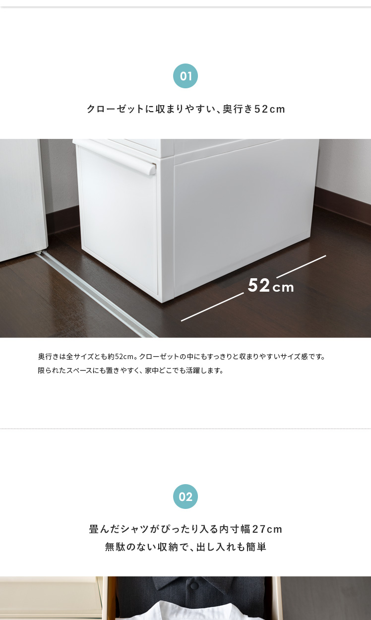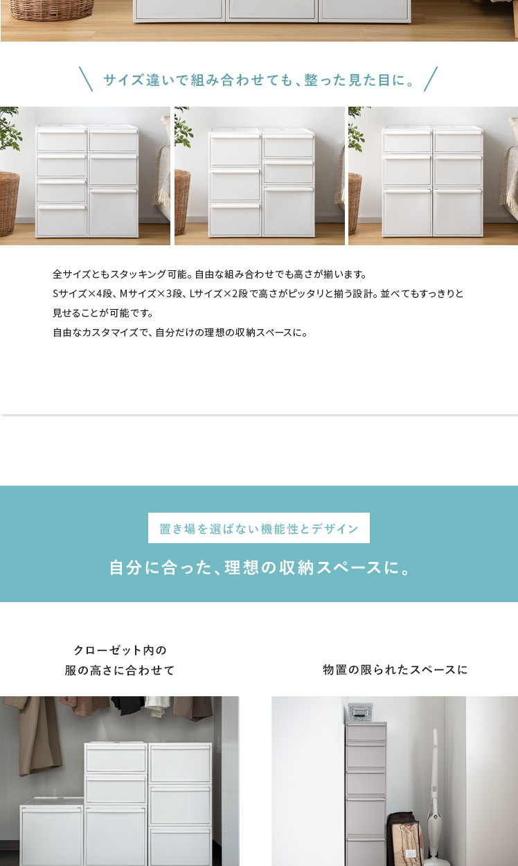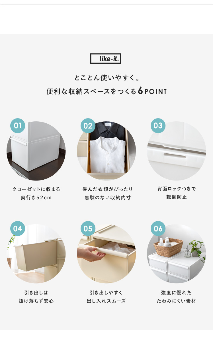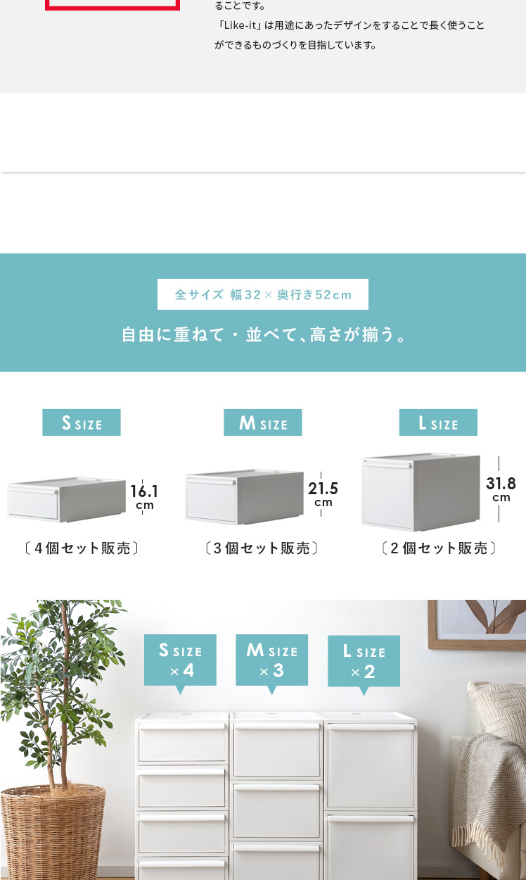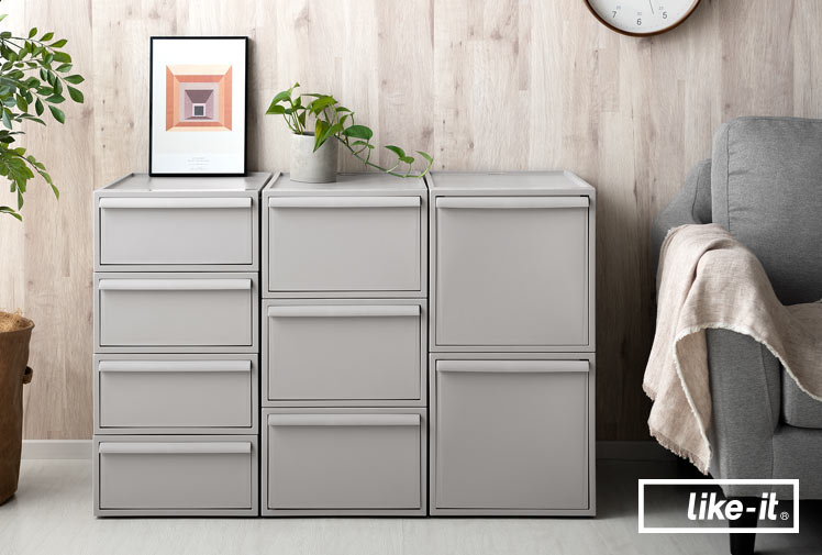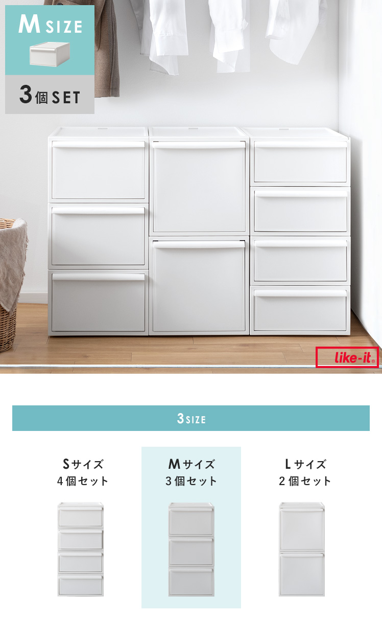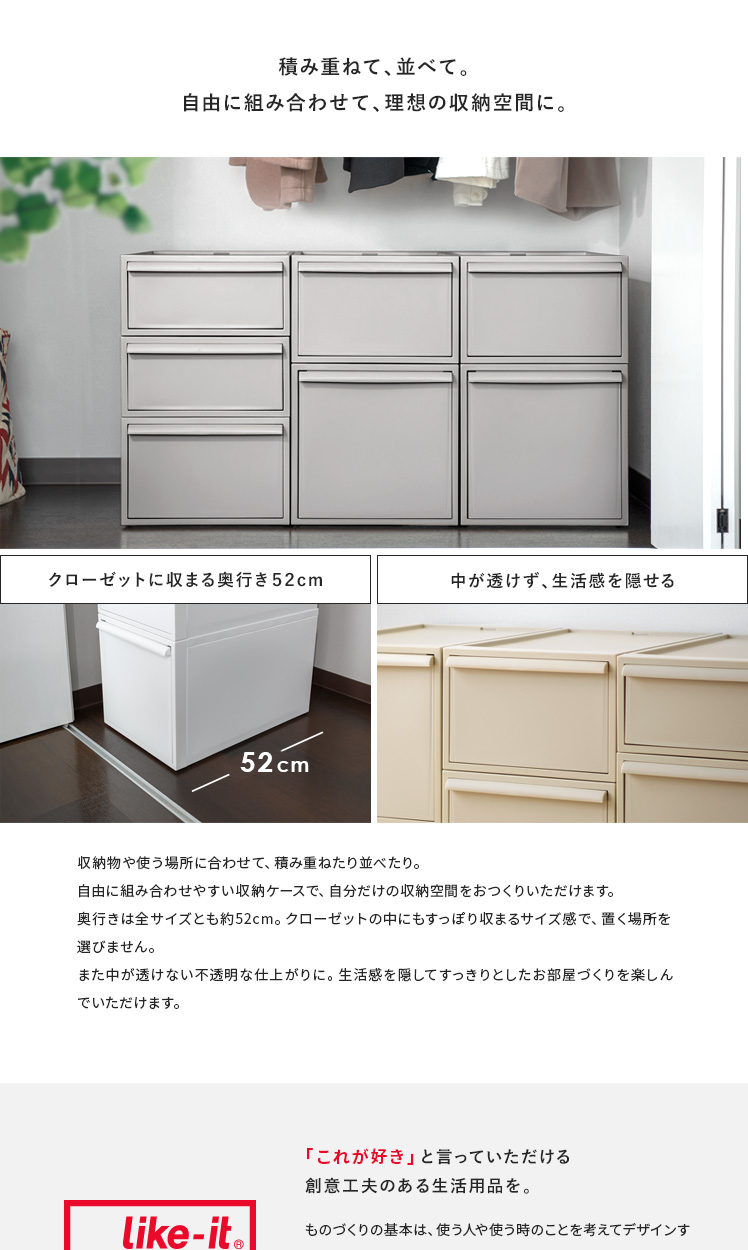 like it〔ライクイット〕クローゼットシステム Mサイズ 3個セット/収納物や使う場所に合わせて、積み重ねたり並べたり。自由に組み合わせやすい収納ケースで、自分だけの収納空間をおつくりいただけます。奥行きは全サイズとも約52cm。クローゼットの中にもすっぽり収まるサイズ感で、置く場所を選びません。また中が透けない不透明な仕上がりに。生活感を隠してすっきりとしたお部屋づくりを楽しんでいただけます。