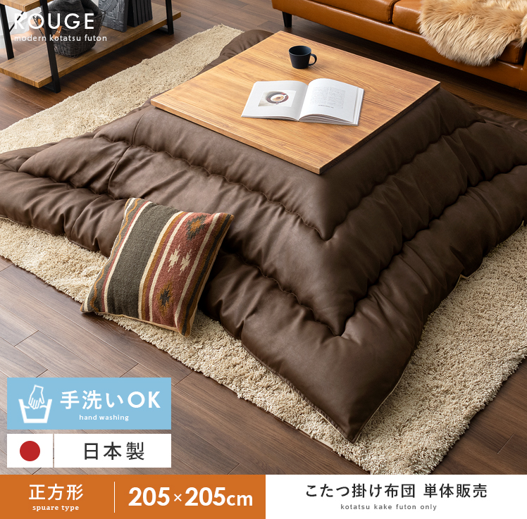 厚掛けこたつ布団 ROUGE〔ルージュ〕 正方形 205×205cm/高い保温性と、ふっくらと美しいデザイン性を備えた厚掛けこたつ布団。表地は高級感ただようレザー調生地を採用し、落ち着きのある雰囲気を演出いただけます。さらに、レザー調生地は熱が逃げにくく、保温効果も抜群♪また、中綿には軽くて保温性の高い「東レマッシュロン綿」がたっぷり詰め込まれており、ふかふかな弾力で体を優しく包みこみます。温もりが長く続く厚掛け布団で、ポカポカと冬を快適に。
