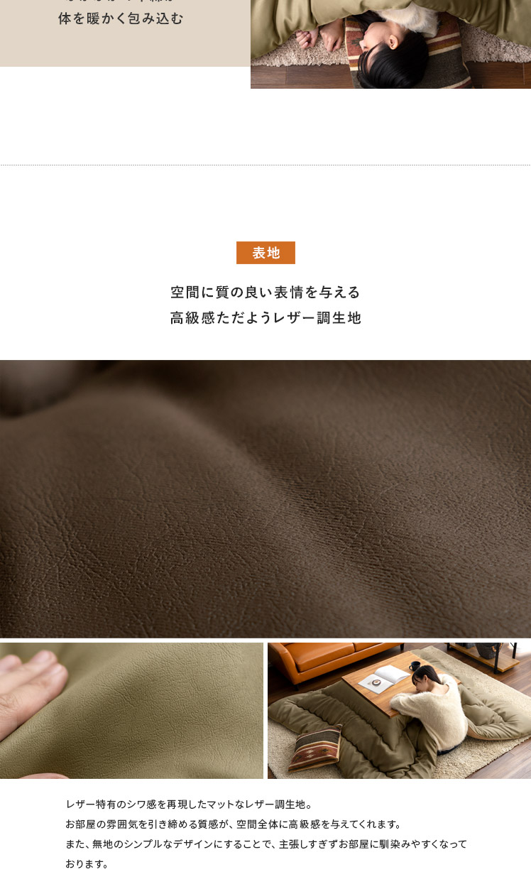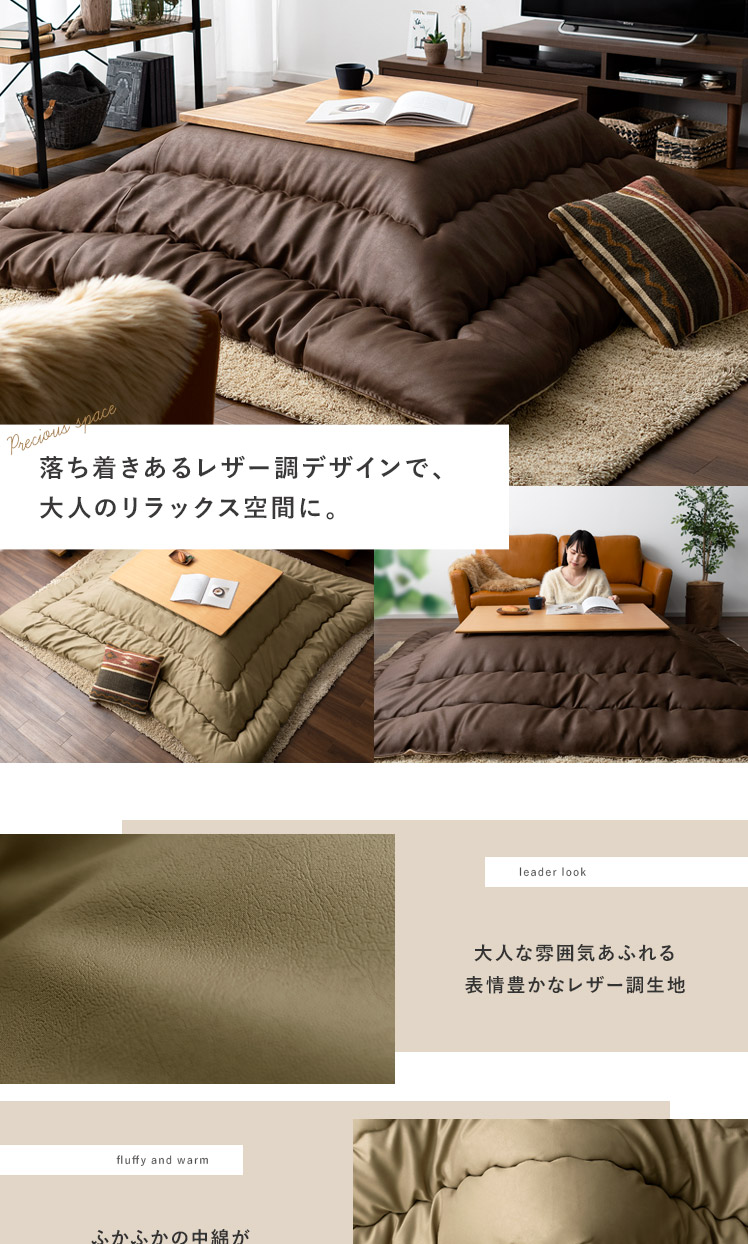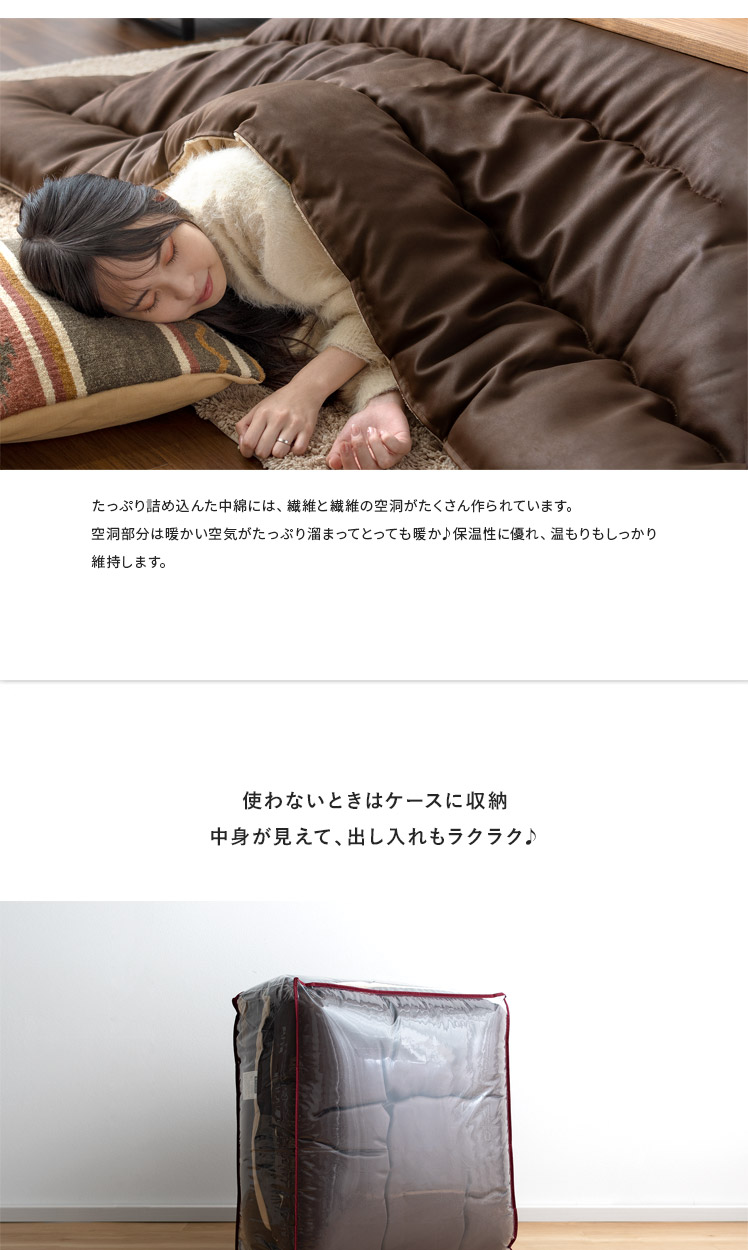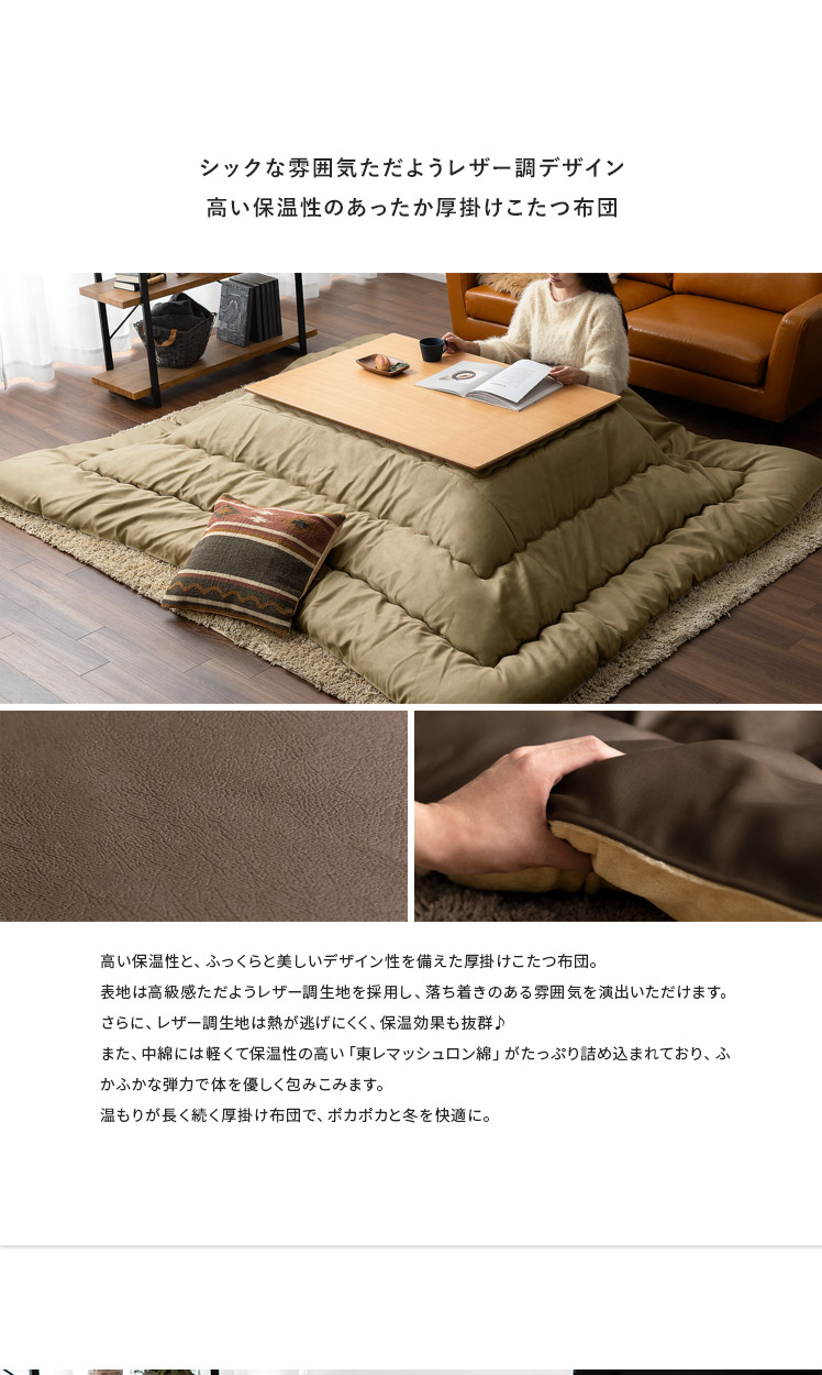 厚掛けこたつ布団 ROUGE〔ルージュ〕 長方形 205×245cm/高い保温性と、ふっくらと美しいデザイン性を備えた厚掛けこたつ布団。表地は高級感ただようレザー調生地を採用し、落ち着きのある雰囲気を演出いただけます。さらに、レザー調生地は熱が逃げにくく、保温効果も抜群♪また、中綿には軽くて保温性の高い「東レマッシュロン綿」がたっぷり詰め込まれており、ふかふかな弾力で体を優しく包みこみます。温もりが長く続く厚掛け布団で、ポカポカと冬を快適に。