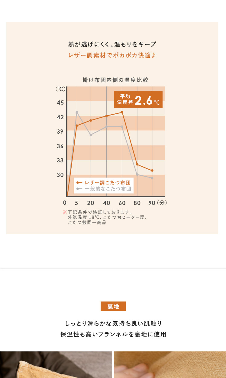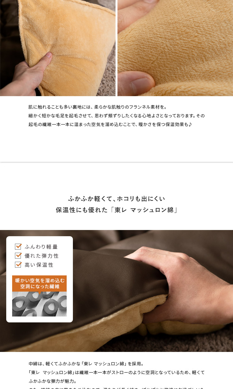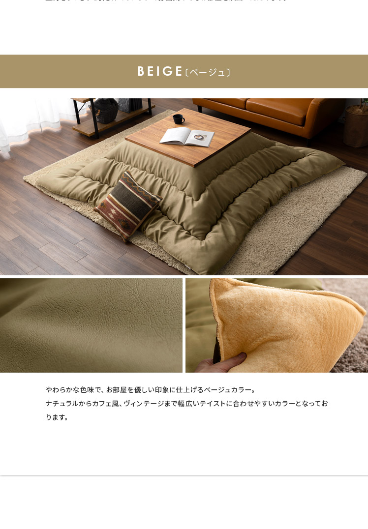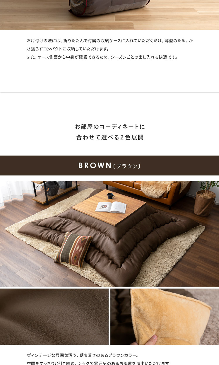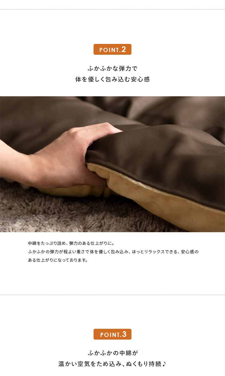 厚掛けこたつ布団 ROUGE〔ルージュ〕 長方形 205×245cm/高い保温性と、ふっくらと美しいデザイン性を備えた厚掛けこたつ布団。表地は高級感ただようレザー調生地を採用し、落ち着きのある雰囲気を演出いただけます。さらに、レザー調生地は熱が逃げにくく、保温効果も抜群♪また、中綿には軽くて保温性の高い「東レマッシュロン綿」がたっぷり詰め込まれており、ふかふかな弾力で体を優しく包みこみます。温もりが長く続く厚掛け布団で、ポカポカと冬を快適に。
