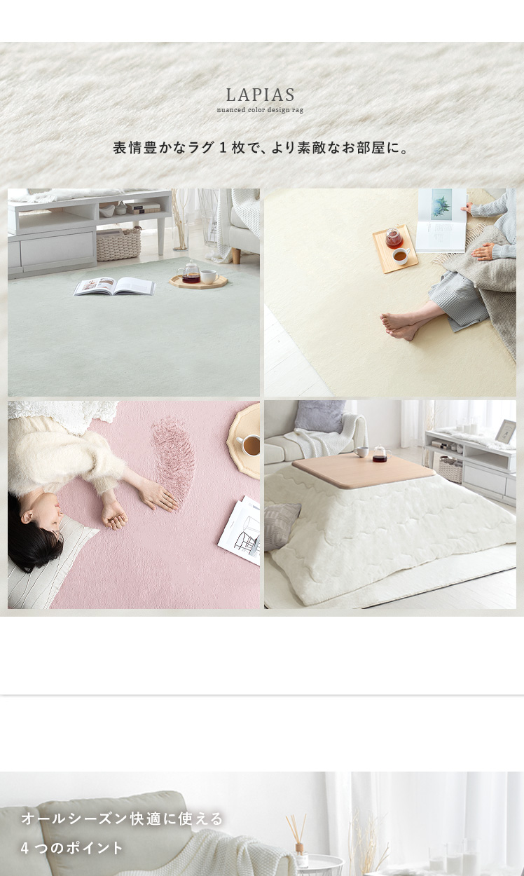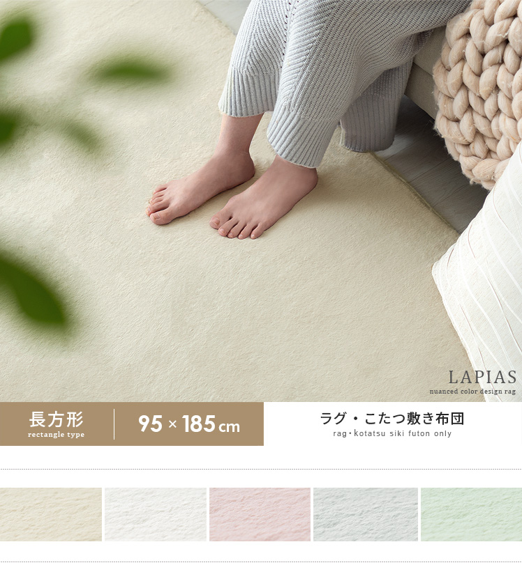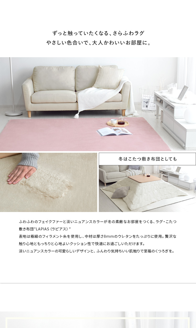 ラグ・こたつ敷き布団 LAPIAS〔ラピアス〕 長方形 95×185cm/ふわふわのフェイクファーと淡いニュアンスカラーが冬の素敵なお部屋をつくる、ラグ・こたつ敷き布団”LAPIAS(ラピアス)”表地は極細のフィラメント糸を使用し、中材は厚さ8mmのウレタンをたっぷりに使用。贅沢な触り心地ともっちりと心地よいクッション性で快適にお過ごしいただけます。淡いニュアンスカラーの可愛らしいデザインと、ふんわり気持ちいい肌触りで至福のくつろぎを。