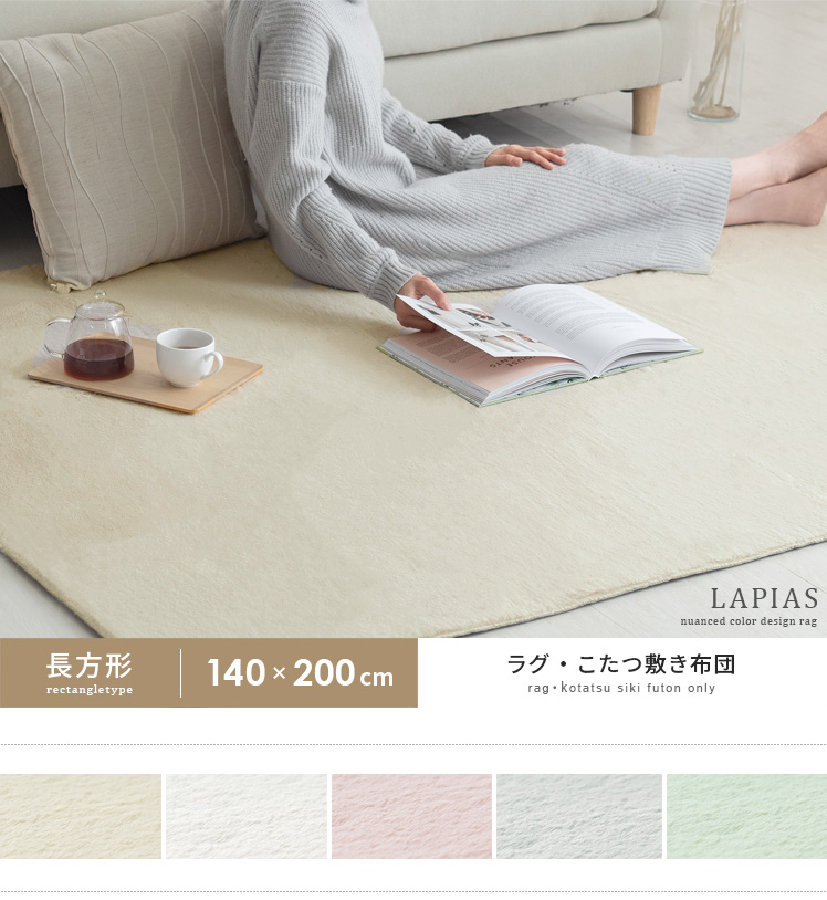 ラグ・こたつ敷き布団 LAPIAS〔ラピアス〕 長方形 140×200cm/ふわふわのフェイクファーと淡いニュアンスカラーが冬の素敵なお部屋をつくる、ラグ・こたつ敷き布団”LAPIAS(ラピアス)”表地は極細のフィラメント糸を使用し、中材は厚さ8mmのウレタンをたっぷりに使用。贅沢な触り心地ともっちりと心地よいクッション性で快適にお過ごしいただけます。淡いニュアンスカラーの可愛らしいデザインと、ふんわり気持ちいい肌触りで至福のくつろぎを。