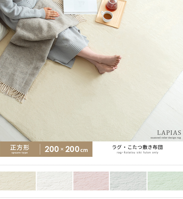 ラグ・こたつ敷き布団 LAPIAS〔ラピアス〕 正方形 200×200cm/ふわふわのフェイクファーと淡いニュアンスカラーが冬の素敵なお部屋をつくる、ラグ・こたつ敷き布団”LAPIAS(ラピアス)”表地は極細のフィラメント糸を使用し、中材は厚さ8mmのウレタンをたっぷりに使用。贅沢な触り心地ともっちりと心地よいクッション性で快適にお過ごしいただけます。淡いニュアンスカラーの可愛らしいデザインと、ふんわり気持ちいい肌触りで至福のくつろぎを。