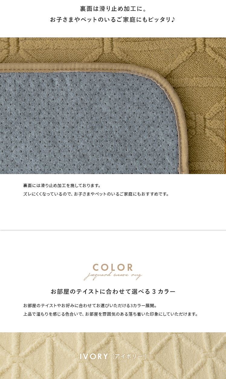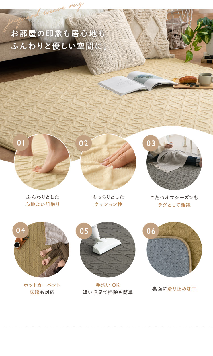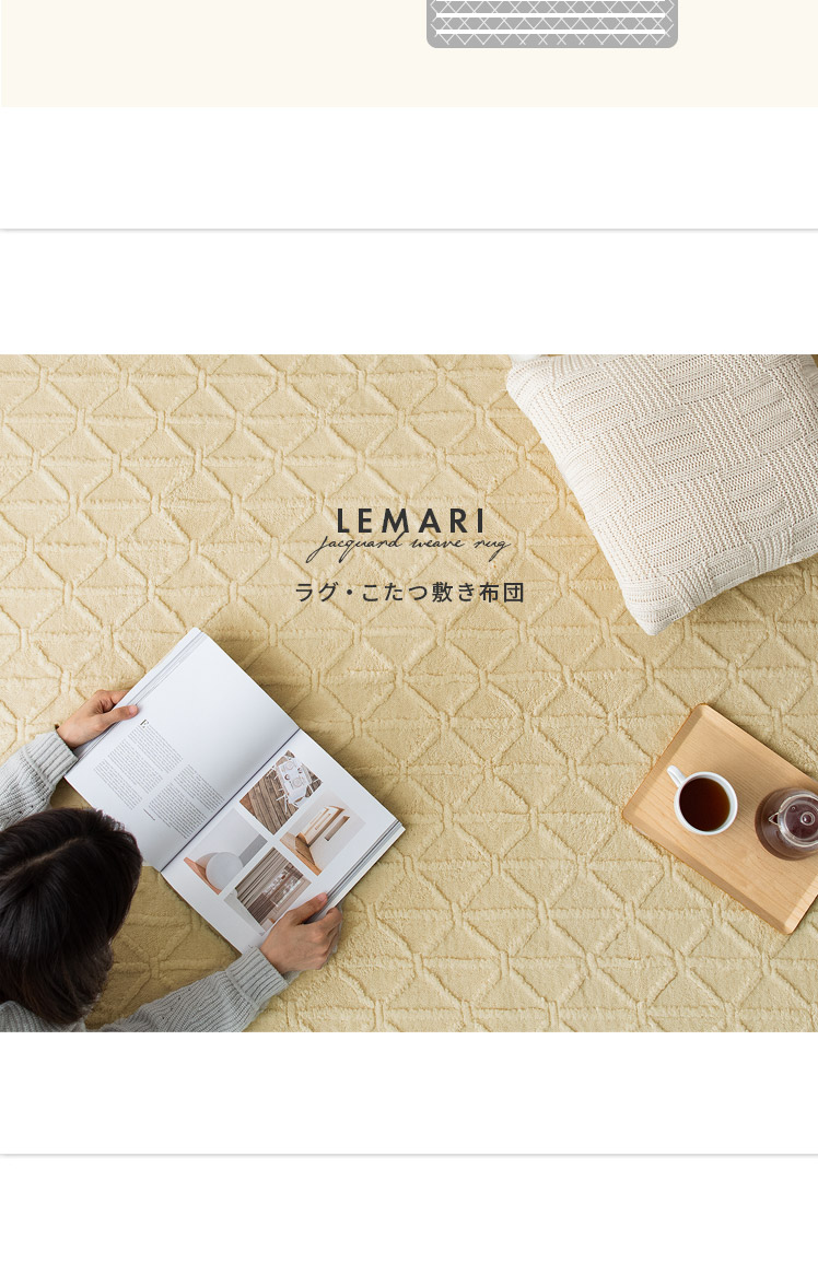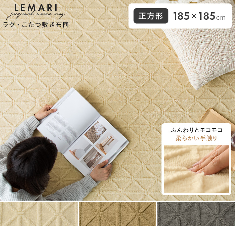 ラグ・こたつ敷き布団 LEMARI〔リマリ〕 正方形 185×185cm/表情豊かなジャガード織で、立体的なデザインに仕上げたラグ・こたつ敷き布団“LEMARI(リマリ)”シンプルでありながら風合いのある表情で、どんなテイストにも馴染みやすく、空間のアクセントにもぴったりです。また、ふわふわもこもことしたフランネル生地で、思わず頬ずりたくなるような柔らかい手触り。さらに、厚さ12mmのウレタンを使い、もっちりとしたクッション性を実現しました。デザインと心地良さを備えて、冬のお部屋をもっと快適に♪