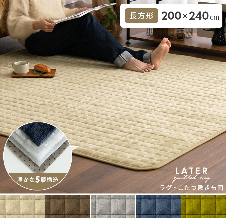 ラグ・こたつ敷き布団 LAYER〔レイヤー〕 長方形 200×240cm/保温性に優れた5層構造と、手触りが気持ちいいこたつ敷布団。生地には、サラふわな肌触りのフランネル生地を採用。蓄熱・断熱効果の高いアルミとポリエチレンシートを取り入れた5層構造で、熱を逃がしにくく、床からの冷気を防ぎます。さらに床暖やホットカーペット対応で、ぬくぬくとより快適に。思わず頬ずりたくなる滑らかな肌触りと、高い断熱性を備えたこたつ敷き布団“Layer(レイヤー)”で温もりのある空間を。