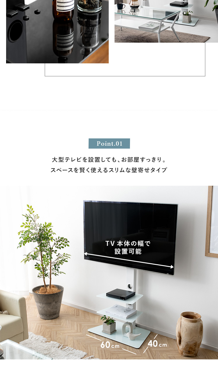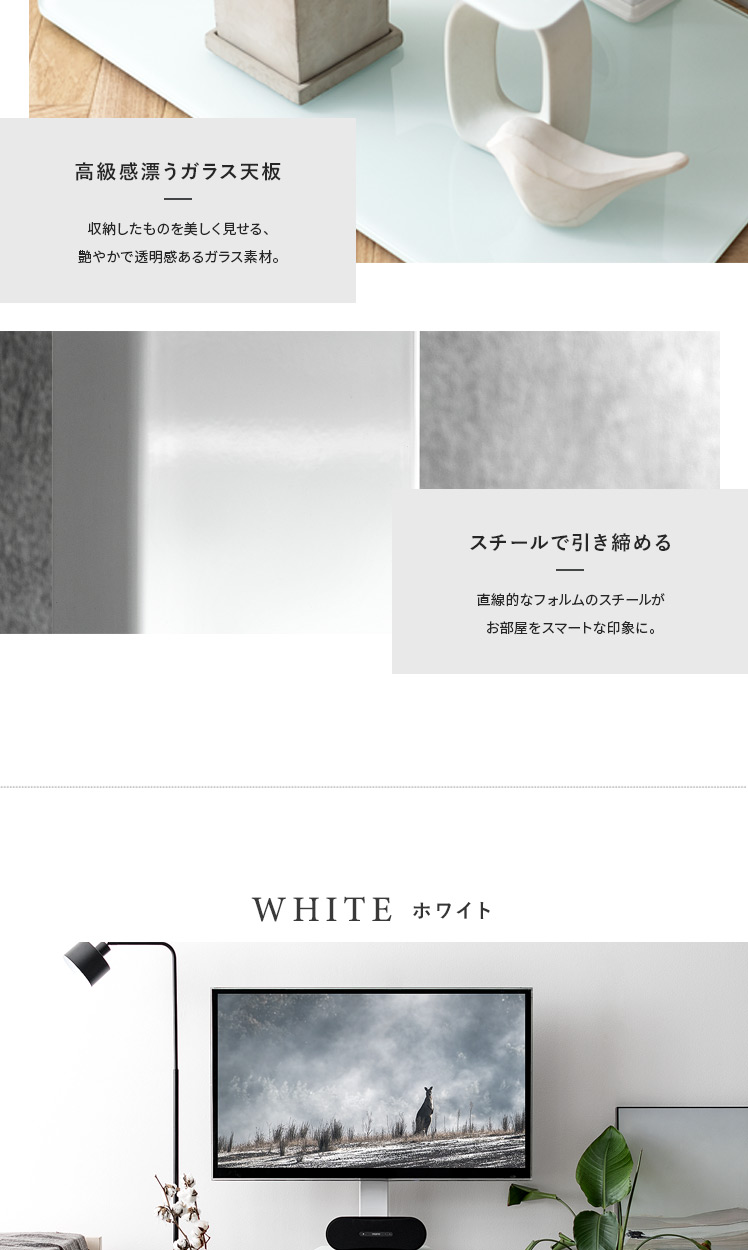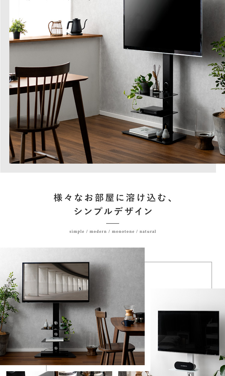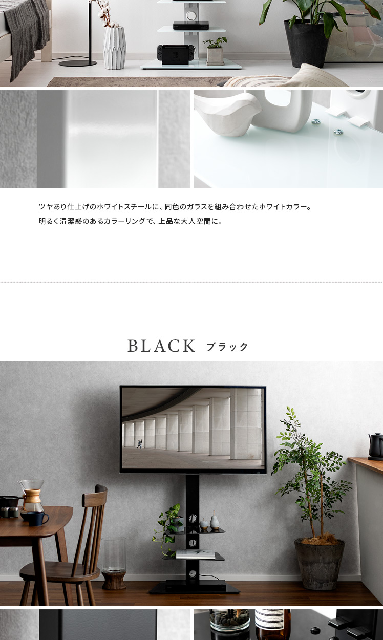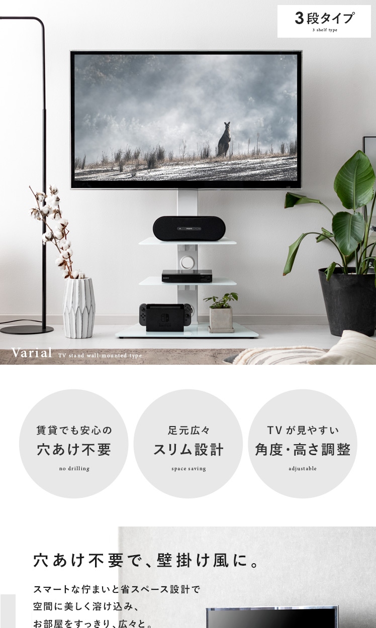 壁寄せテレビスタンド Varial〔バリアル〕 3段棚タイプ/穴あけ不要で、すっきりと美しい壁掛け風テレビのように見せてくれるスタンドテレビ台”Varial(バリアル)”スマートなフォルムに、ガラス×スチールの異素材MIXが目を惹く高いデザイン性で空間に美しく溶け込み、お部屋をすっきり広々と演出します。また、角度調整や6段階の高さ調整など日々の使いやすさにもこだわりました。省スペースに置ける壁掛け風テレビスタンドで、お部屋を美しく快適に。