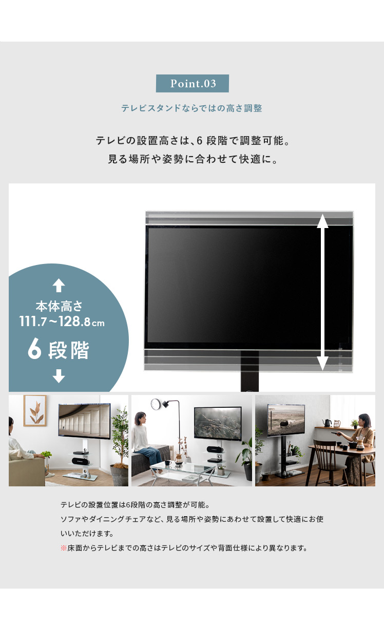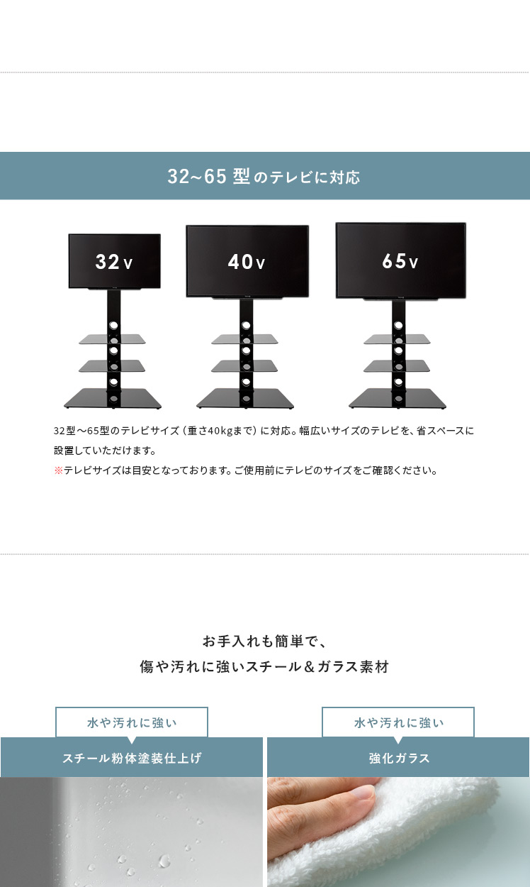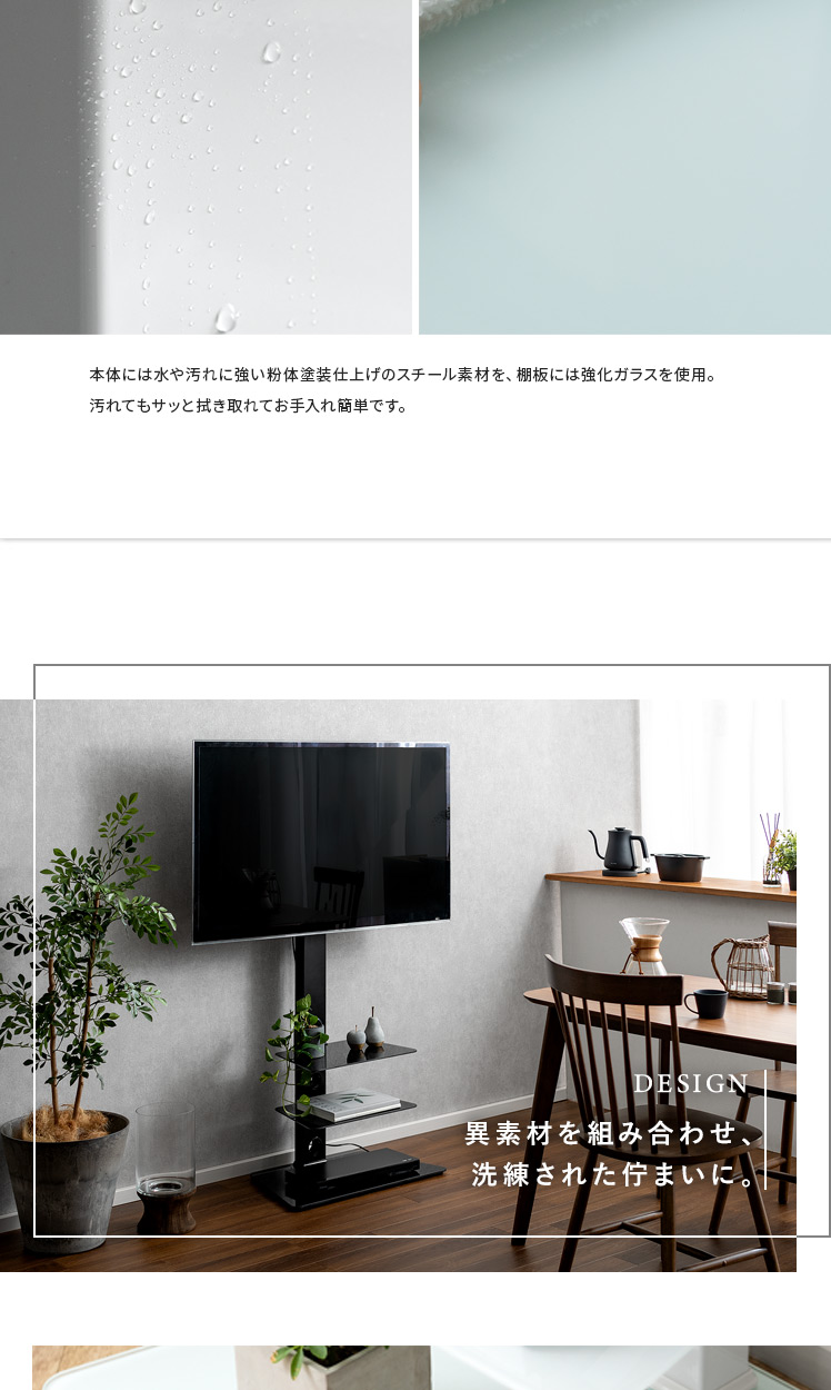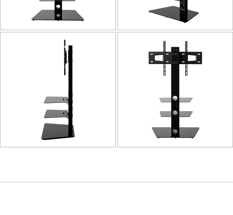 壁寄せテレビスタンド Varial〔バリアル〕 3段棚タイプ/穴あけ不要で、すっきりと美しい壁掛け風テレビのように見せてくれるスタンドテレビ台”Varial(バリアル)”スマートなフォルムに、ガラス×スチールの異素材MIXが目を惹く高いデザイン性で空間に美しく溶け込み、お部屋をすっきり広々と演出します。また、角度調整や6段階の高さ調整など日々の使いやすさにもこだわりました。省スペースに置ける壁掛け風テレビスタンドで、お部屋を美しく快適に。