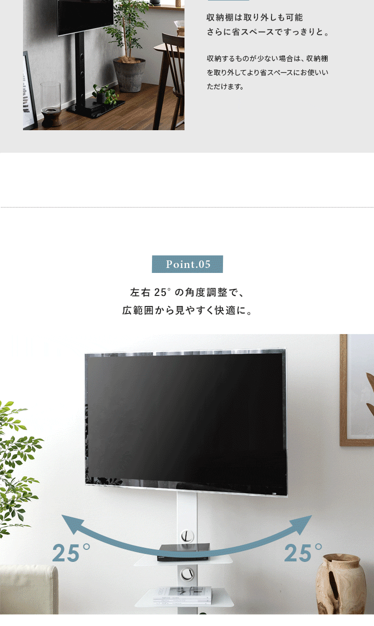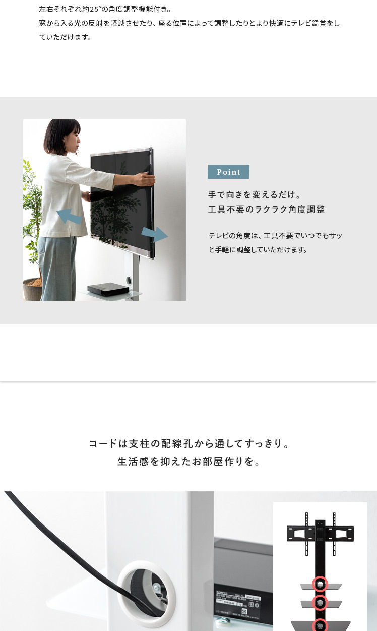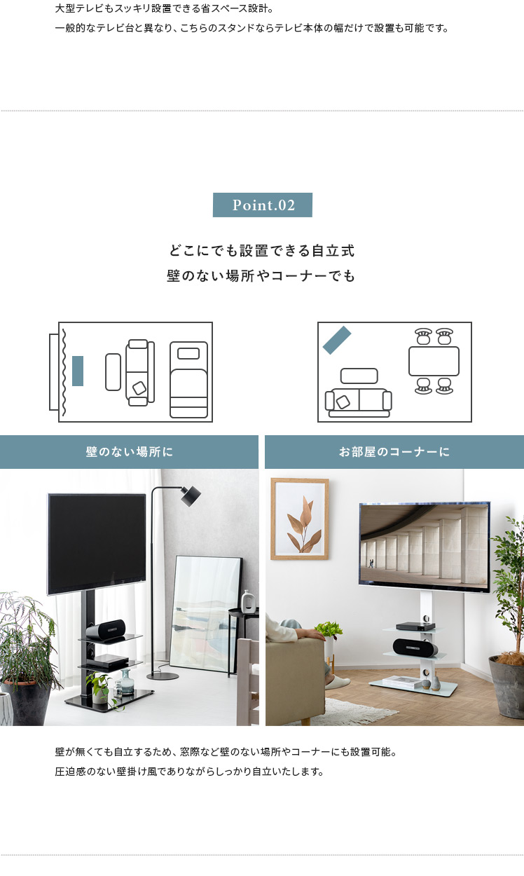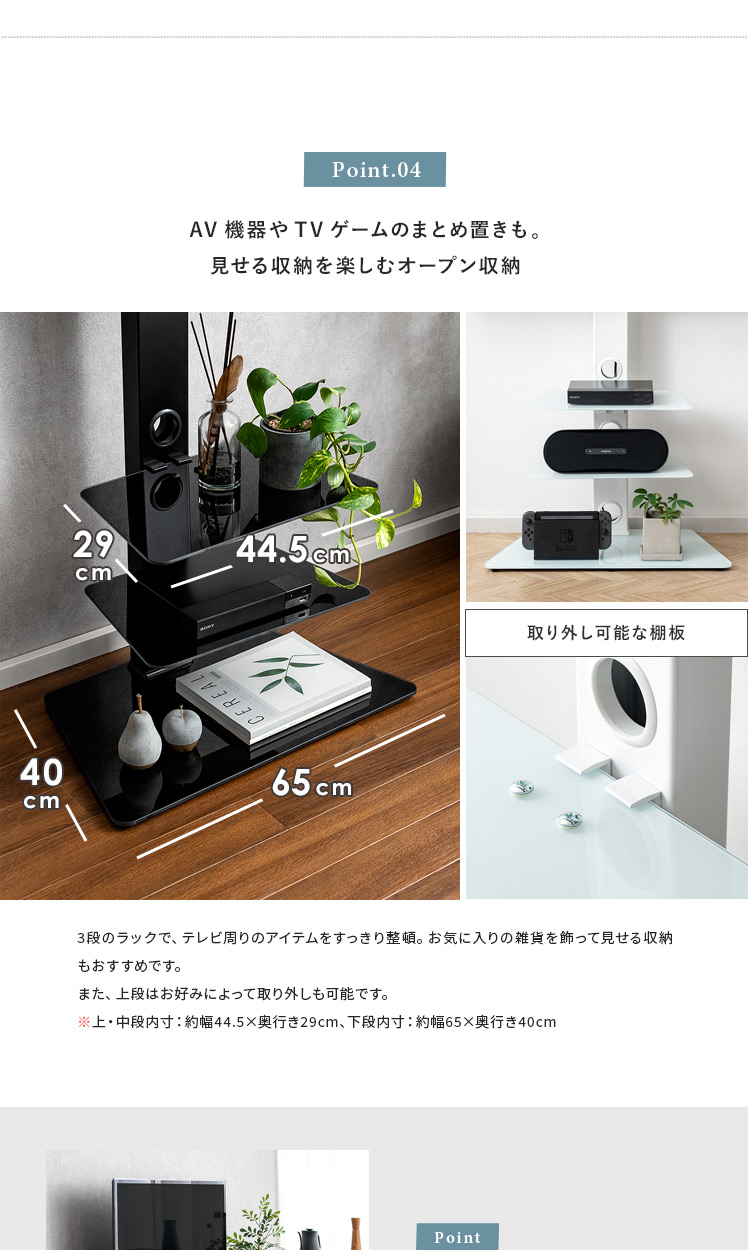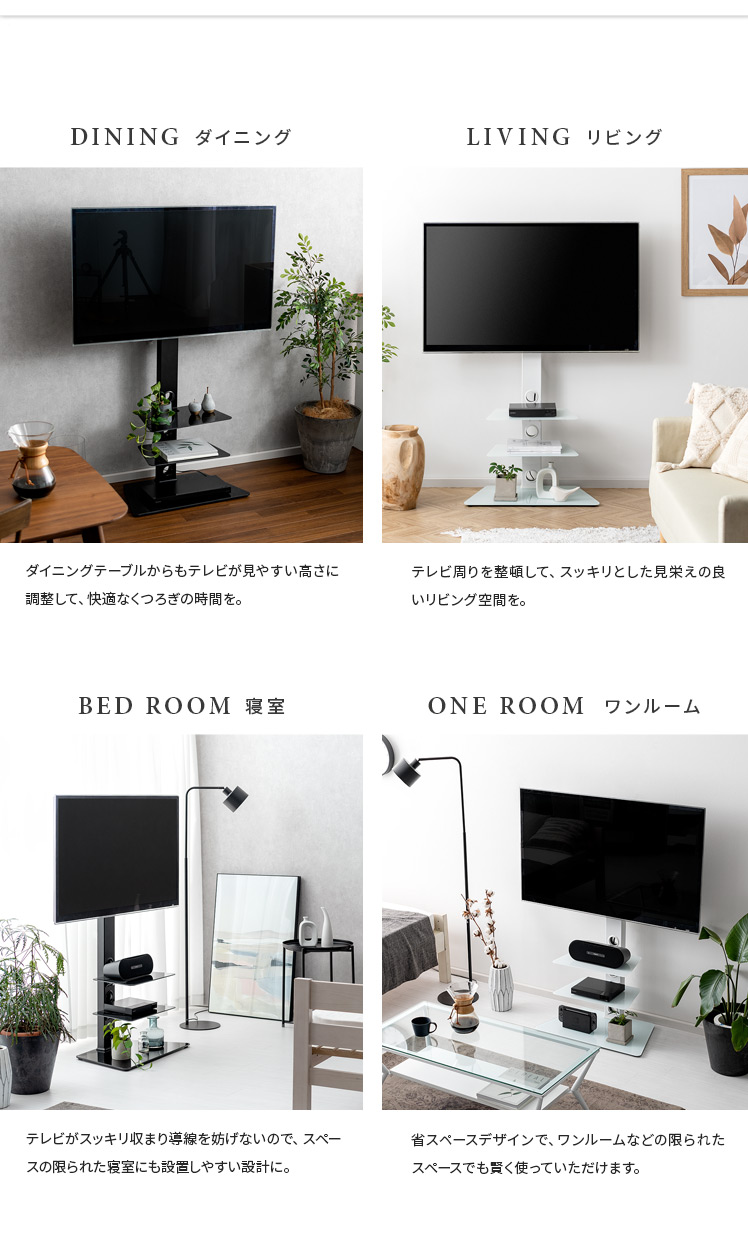 壁寄せテレビスタンド Varial〔バリアル〕 3段棚タイプ/穴あけ不要で、すっきりと美しい壁掛け風テレビのように見せてくれるスタンドテレビ台”Varial(バリアル)”スマートなフォルムに、ガラス×スチールの異素材MIXが目を惹く高いデザイン性で空間に美しく溶け込み、お部屋をすっきり広々と演出します。また、角度調整や6段階の高さ調整など日々の使いやすさにもこだわりました。省スペースに置ける壁掛け風テレビスタンドで、お部屋を美しく快適に。