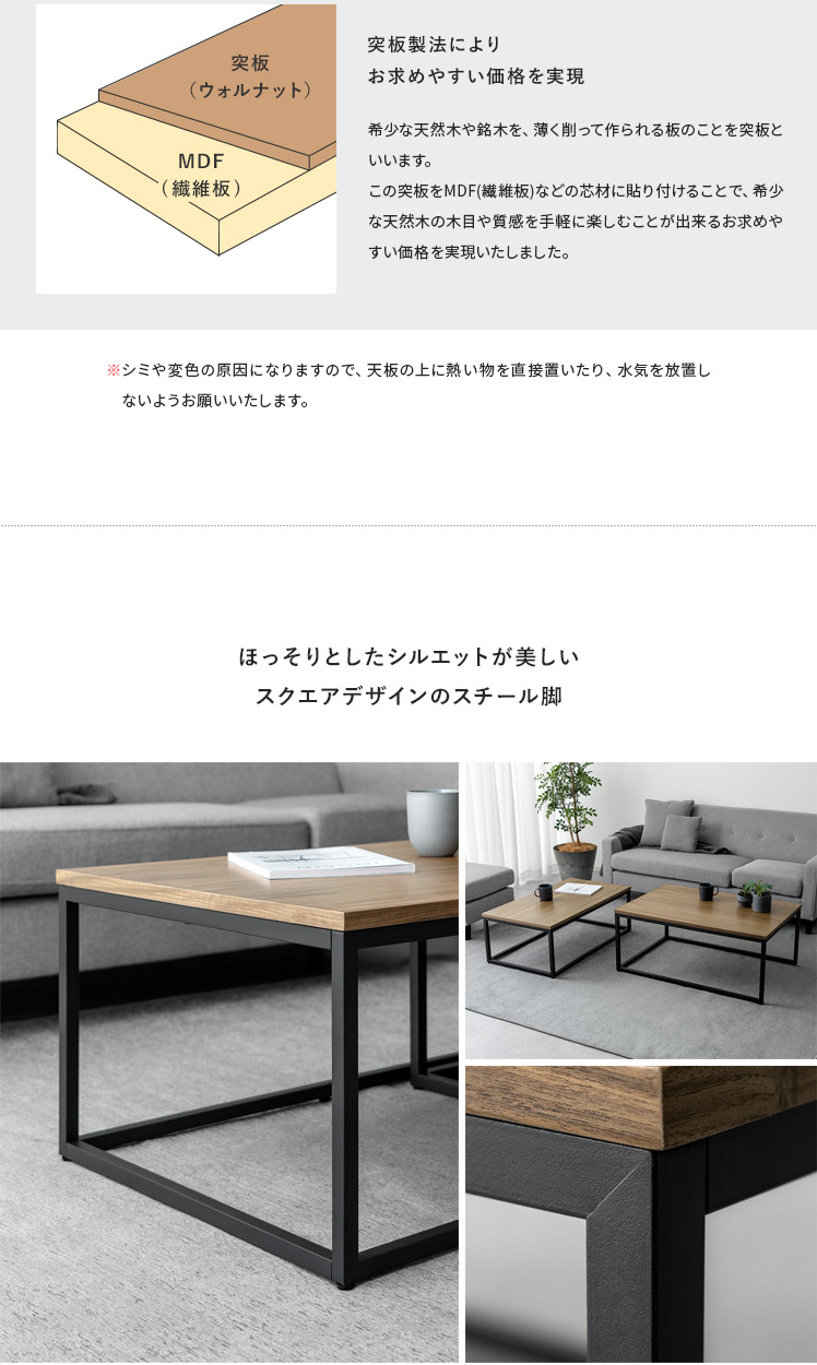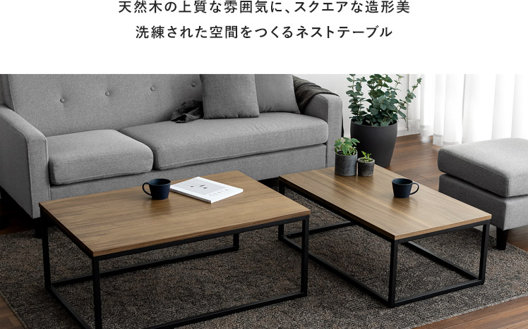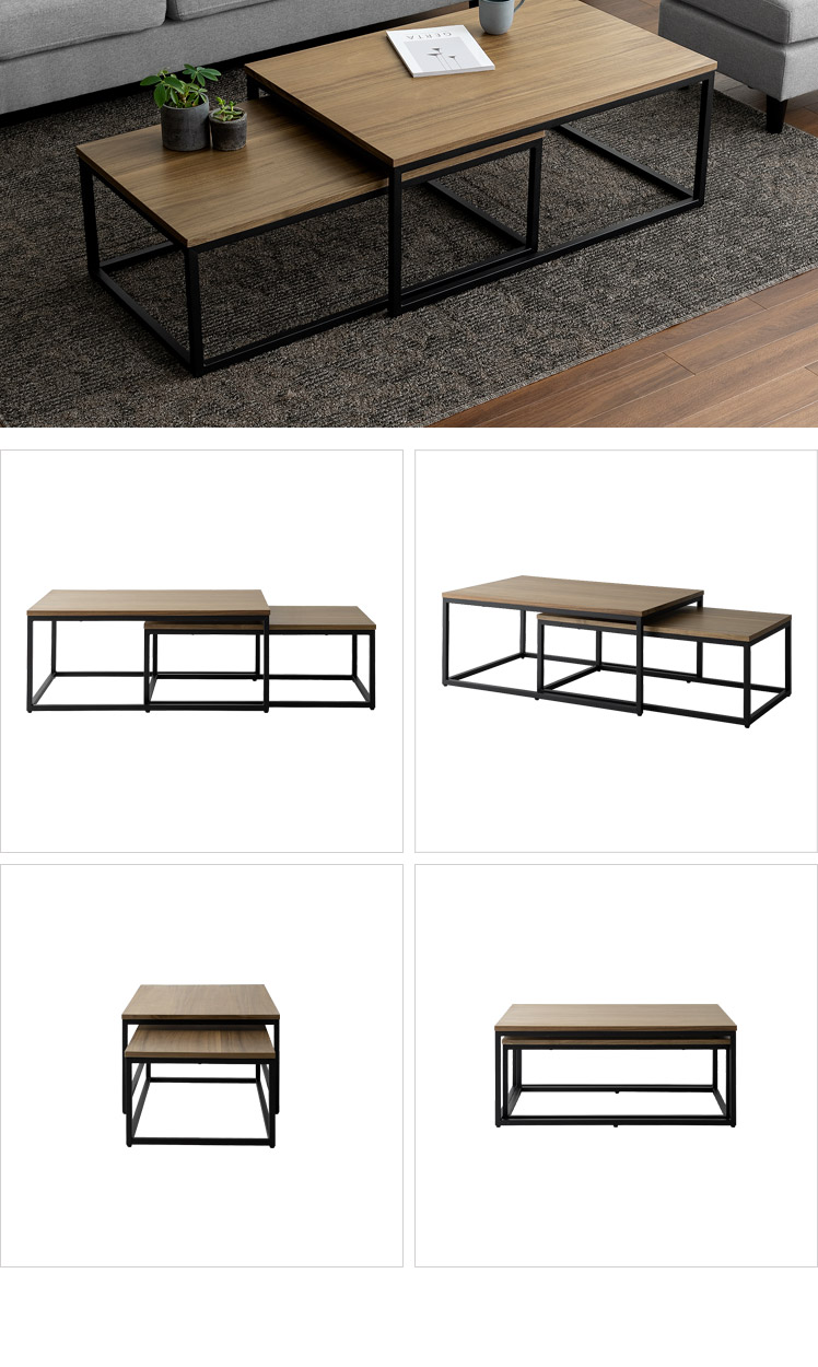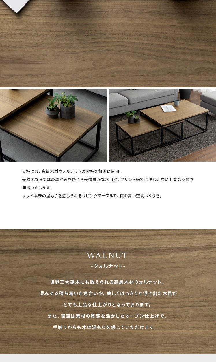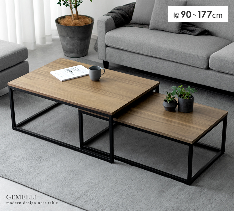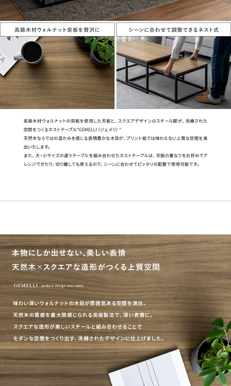 ネストテーブル GEMELLI〔ジェメリ〕長方形タイプ/高級木材ウォルナットの突板を使用した天板と、スクエアデザインのスチール脚が、洗練された空間をつくるネストテーブル“GEMELLI(ジェメリ)”天然木ならではの温かみを感じる表情豊かな木目が、プリント紙では味わえない上質な空間を演出いたします。また、大・小サイズの違うテーブルを組み合わせたネストテーブルは、天板の重なりをお好みでアレンジできたり、切り離しても使えるので、シーンに合わせてピッタリの配置で使用可能です。
