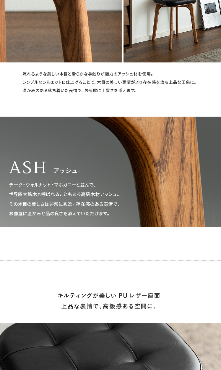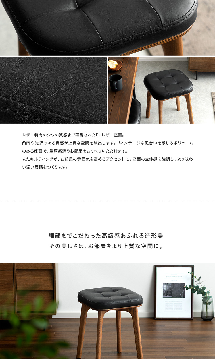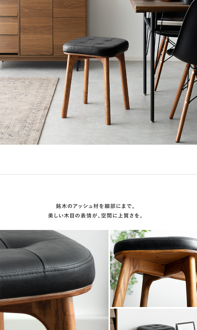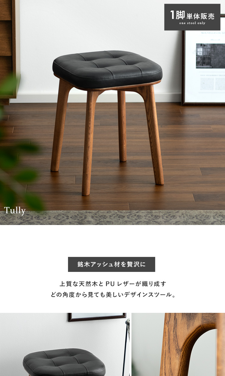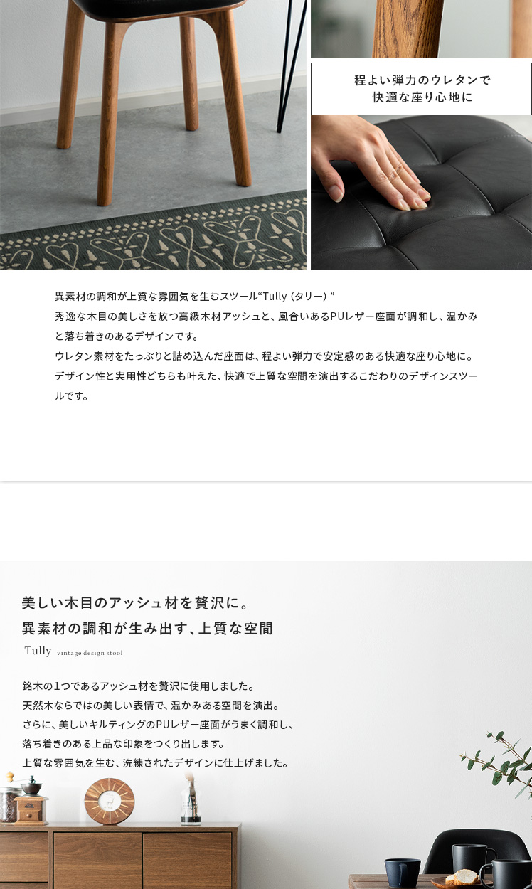 ヴィンテージデザインスツール Tully〔タリー〕 1脚単体販売/異素材の調和が上質な雰囲気を生むスツール“Tully(タリー)”秀逸な木目の美しさを放つ高級木材アッシュと、風合いあるPUレザー座面が調和し、温かみと落ち着きのあるデザインです。ウレタン素材をたっぷりと詰め込んだ座面は、程よい弾力で安定感のある快適な座り心地に。デザイン性と実用性どちらも叶えた、快適で上質な空間を演出するこだわりのデザインスツールです。