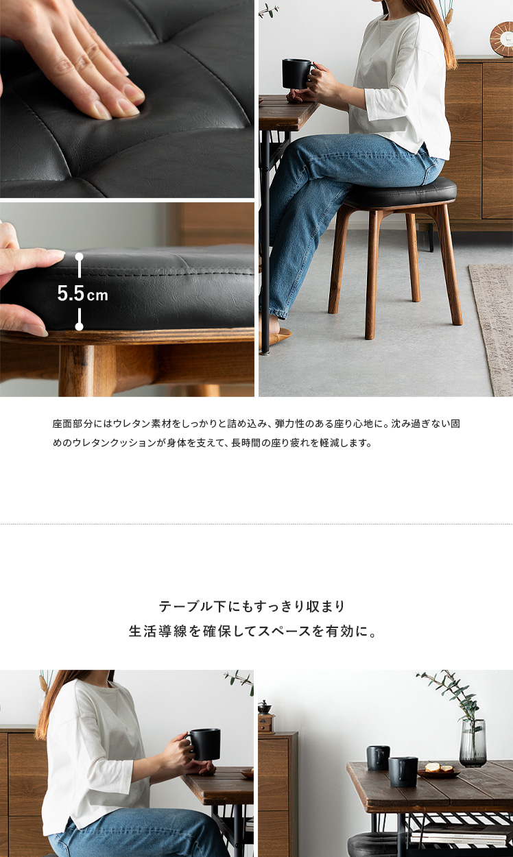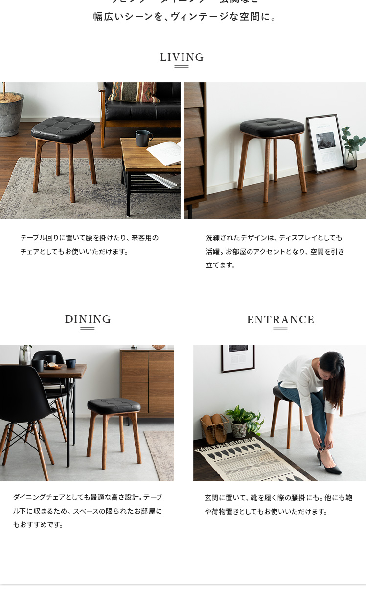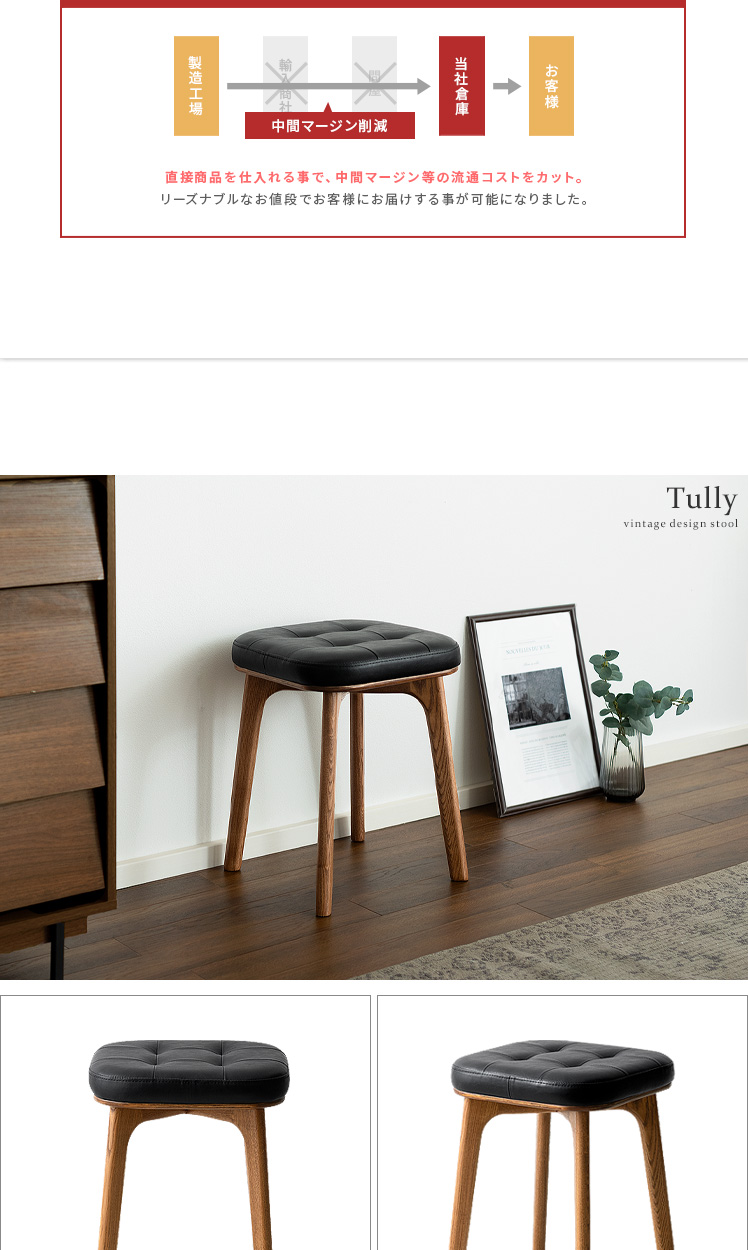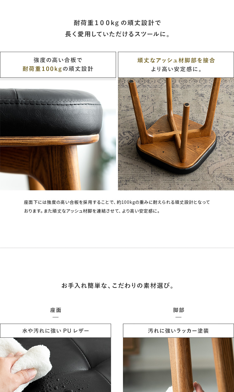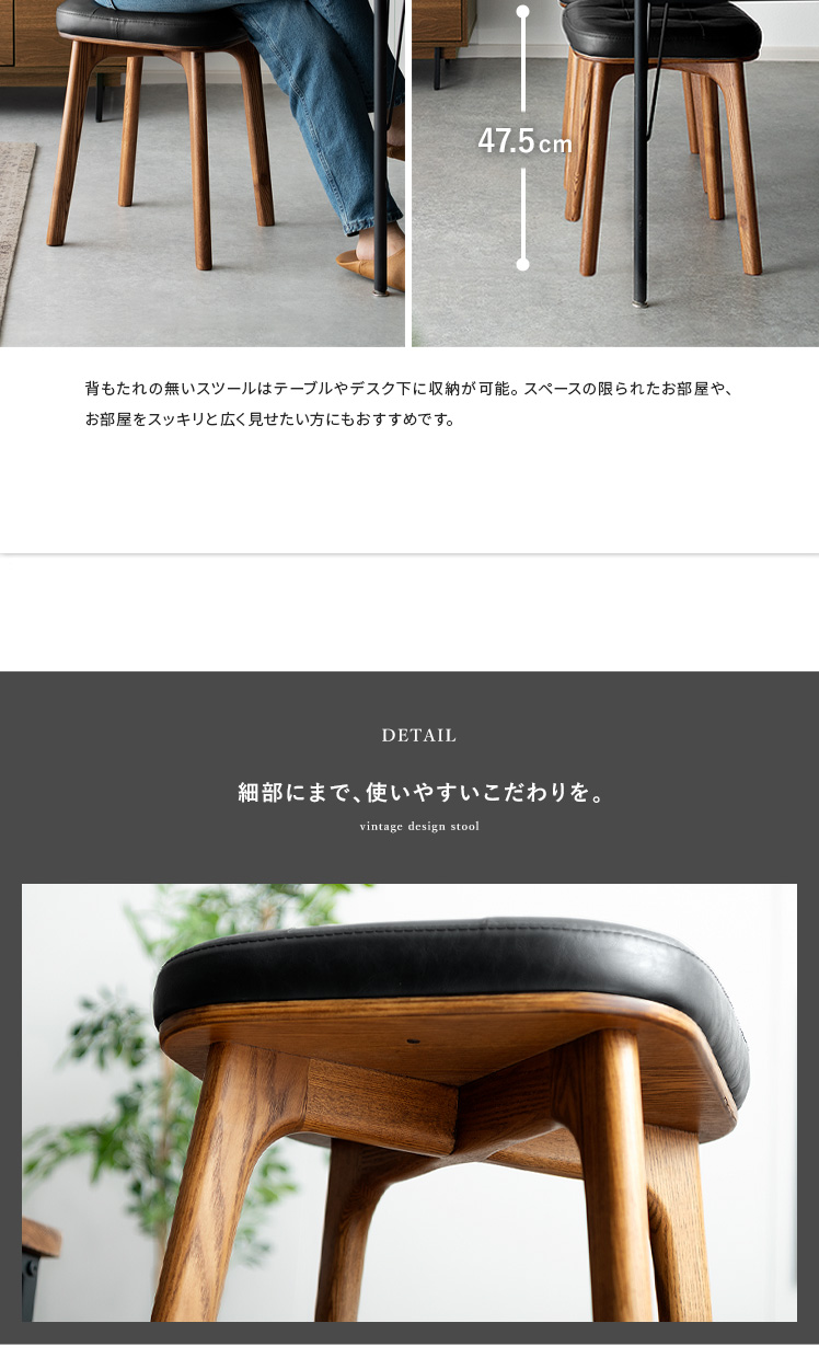 ヴィンテージデザインスツール Tully〔タリー〕 1脚単体販売/異素材の調和が上質な雰囲気を生むスツール“Tully(タリー)”秀逸な木目の美しさを放つ高級木材アッシュと、風合いあるPUレザー座面が調和し、温かみと落ち着きのあるデザインです。ウレタン素材をたっぷりと詰め込んだ座面は、程よい弾力で安定感のある快適な座り心地に。デザイン性と実用性どちらも叶えた、快適で上質な空間を演出するこだわりのデザインスツールです。