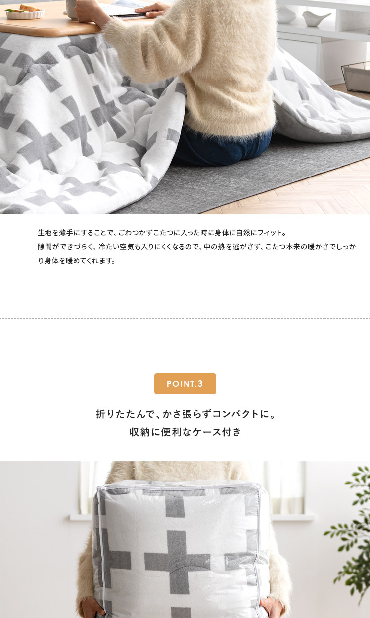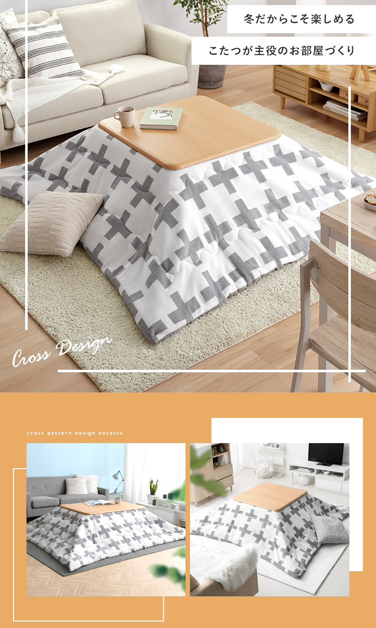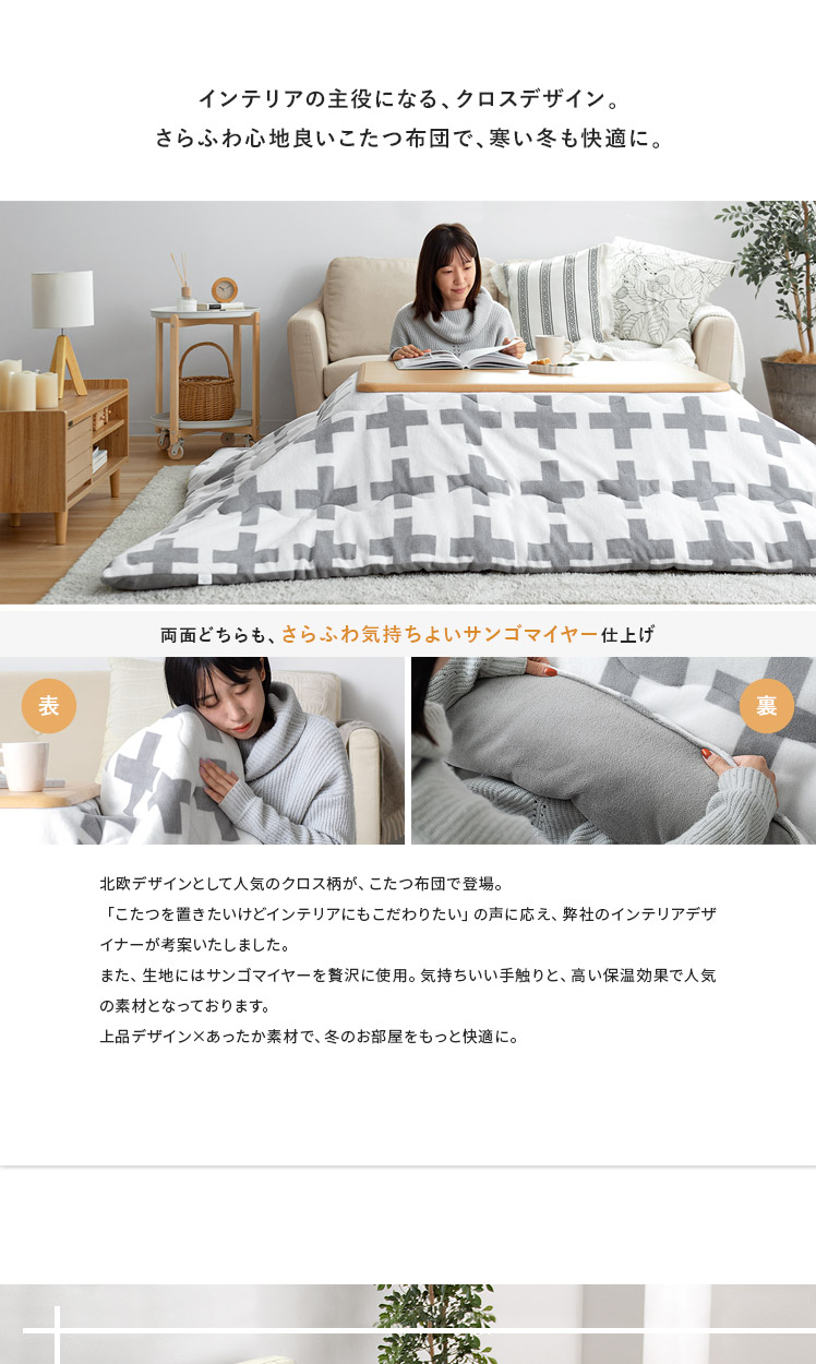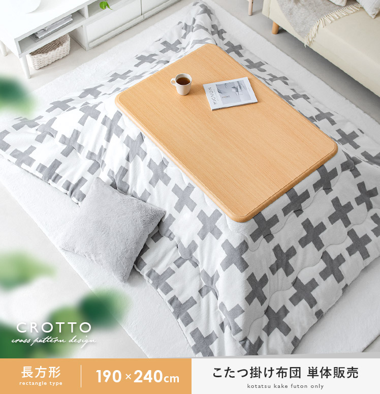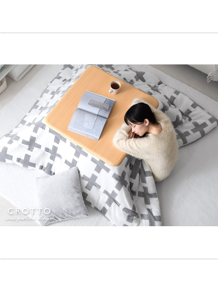 クロス柄薄掛けこたつ布団 CROTTO〔クロット〕長方形 190×240cm/北欧デザインとして人気のクロス柄が、こたつ布団で登場。「こたつを置きたいけどインテリアにもこだわりたい」の声に応え、弊社のインテリアデザイナーが考案いたしました。また、生地にはサンゴマイヤーを贅沢に使用。気持ちいい手触りと、高い保温効果で人気の素材となっております。上品デザイン×あったか素材で、冬のお部屋をもっと快適に。