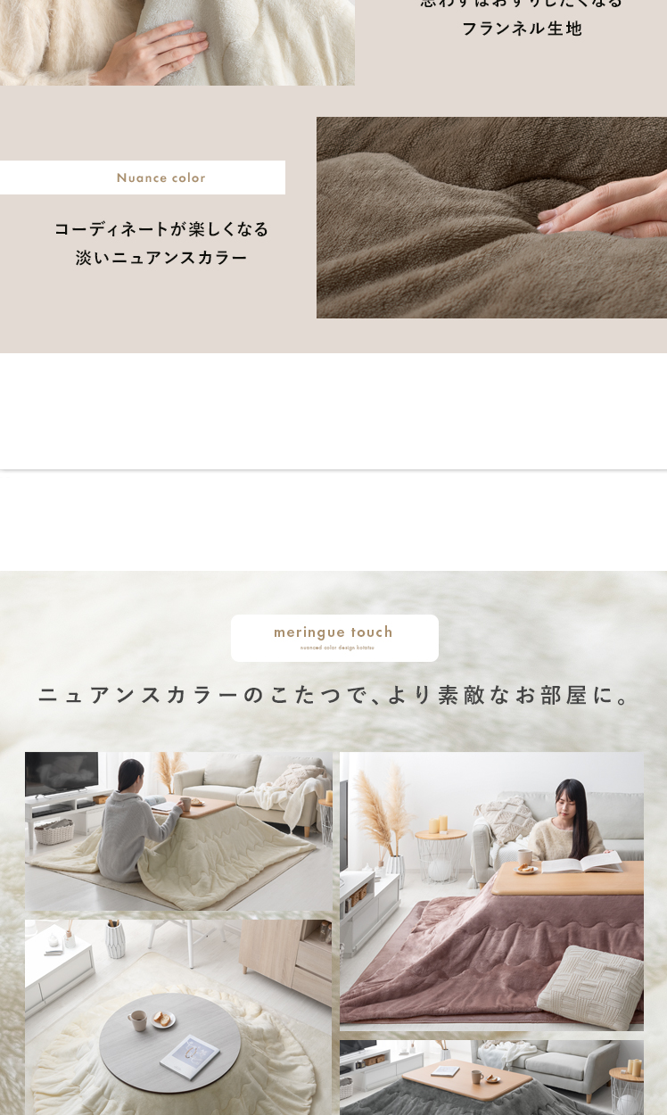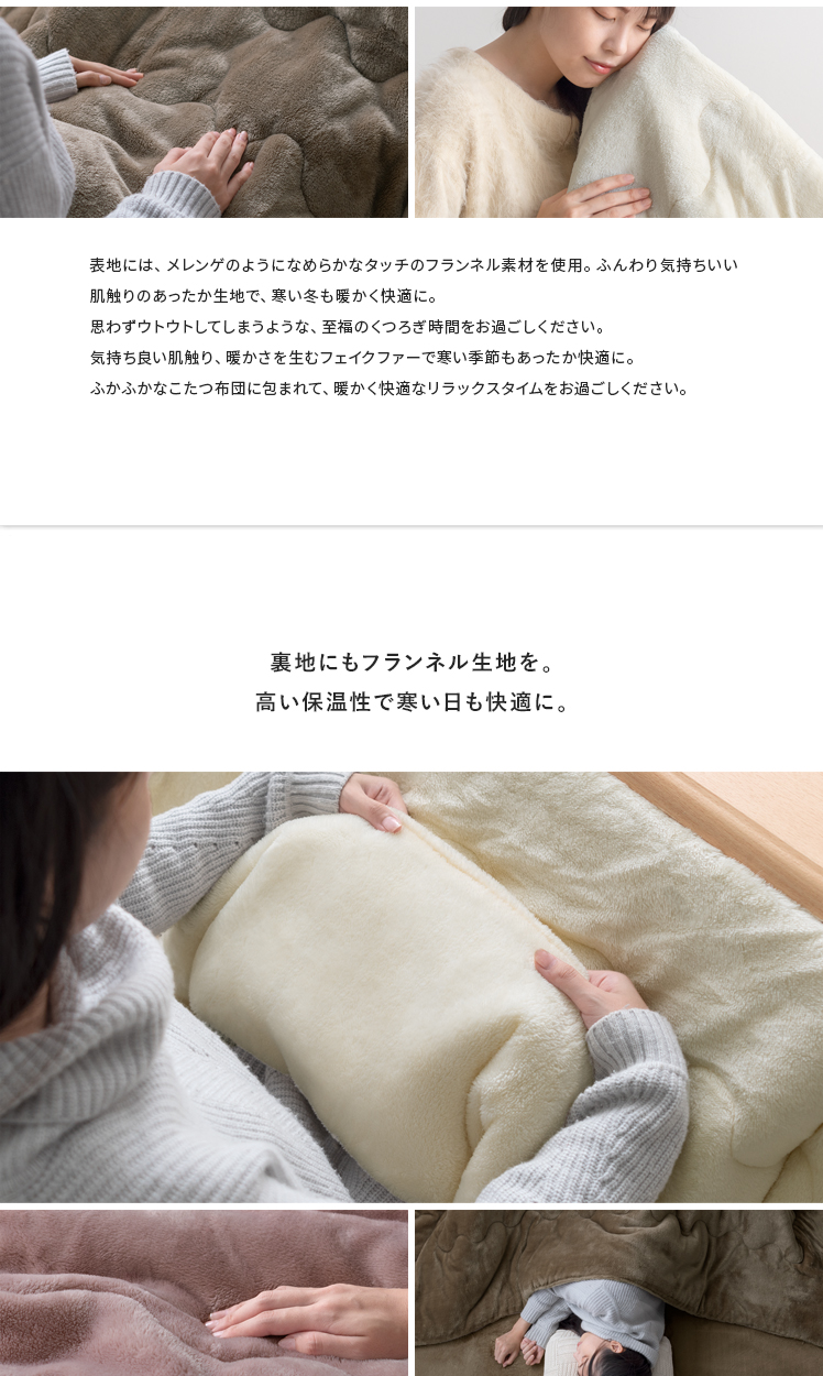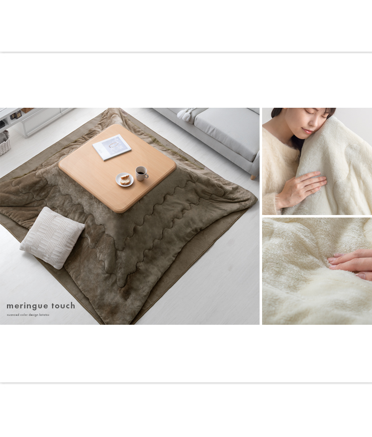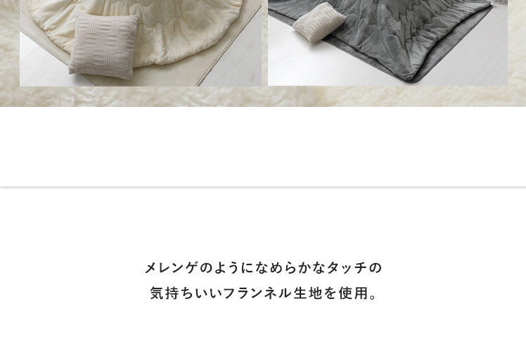 薄掛けこたつ布団メレンゲタッチ 正方形・円形 190x190cm/まるでメレンゲのようなふんわり肌心地のフランネル生地と淡いニュアンスカラーが冬の素敵なお部屋を作る、薄掛けこたつ布団“メレンゲタッチ”表地と裏地両方にふんわり柔らかな短毛のフランネル素材を使用。あったか快適なこたつ布団に仕上げました。淡いニュアンスカラーの大人かわいいデザインと、ふんわり気持ちいい肌触りで至福のくつろぎを。