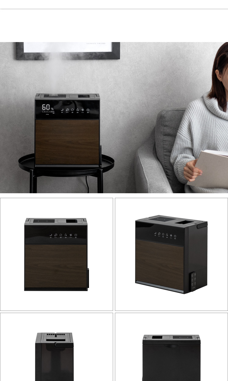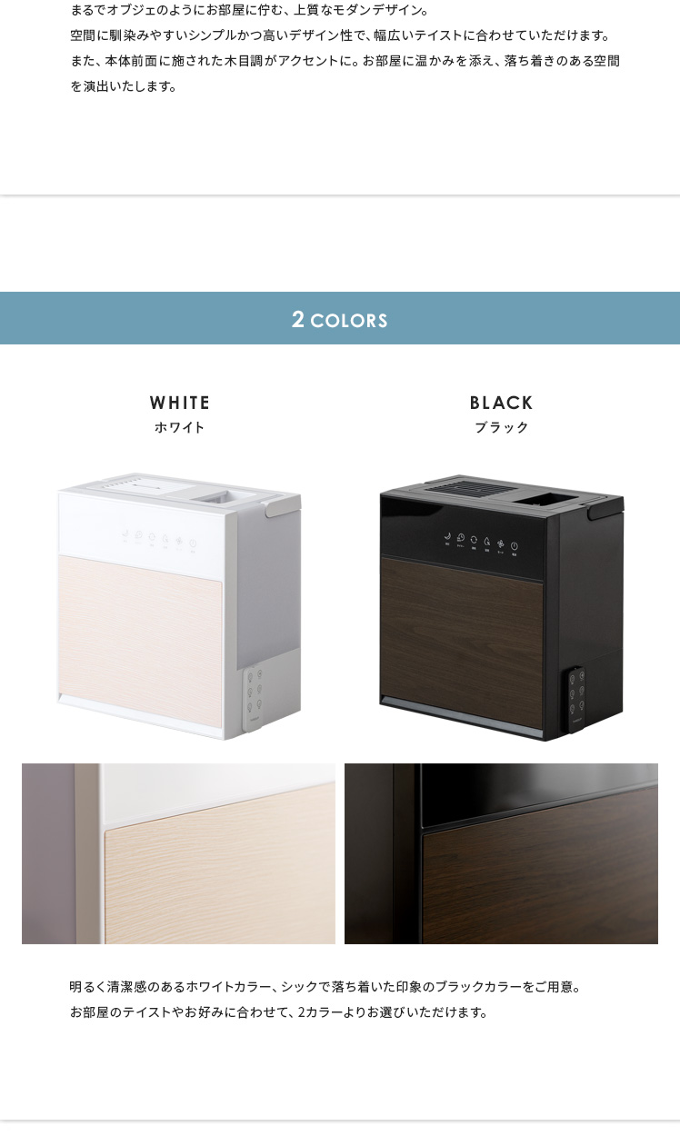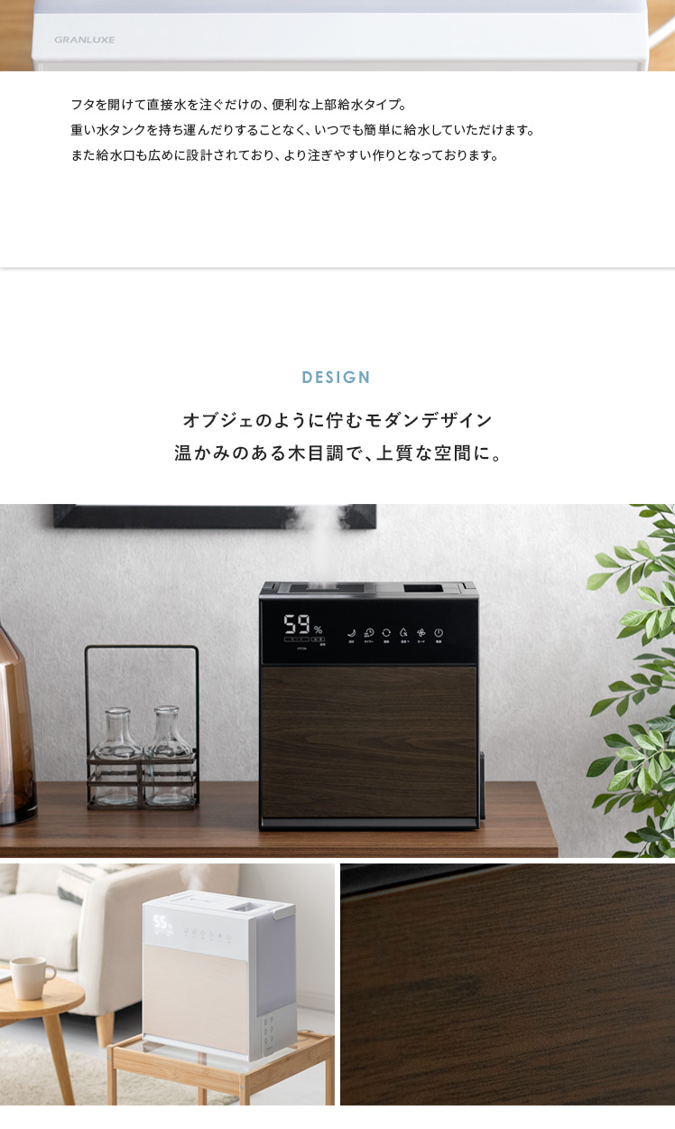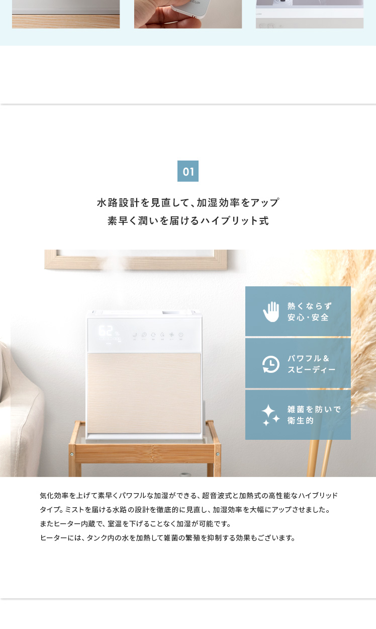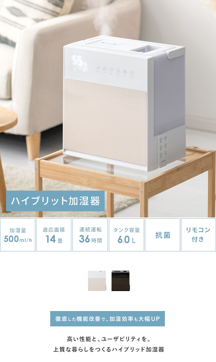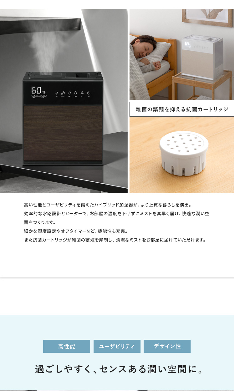 木目調ハイブリッド加湿器/高い性能とユーザビリティを備えたハイブリッド加湿器が、より上質な暮らしを演出。効率的な水路設計とヒーターで、お部屋の温度を下げずにミストを素早く届け、快適な潤い空間をつくります。細かな湿度設定やオフタイマーなど、機能性も充実。また抗菌カートリッジが雑菌の繁殖を抑制し、清潔なミストをお部屋に届けていただけます。