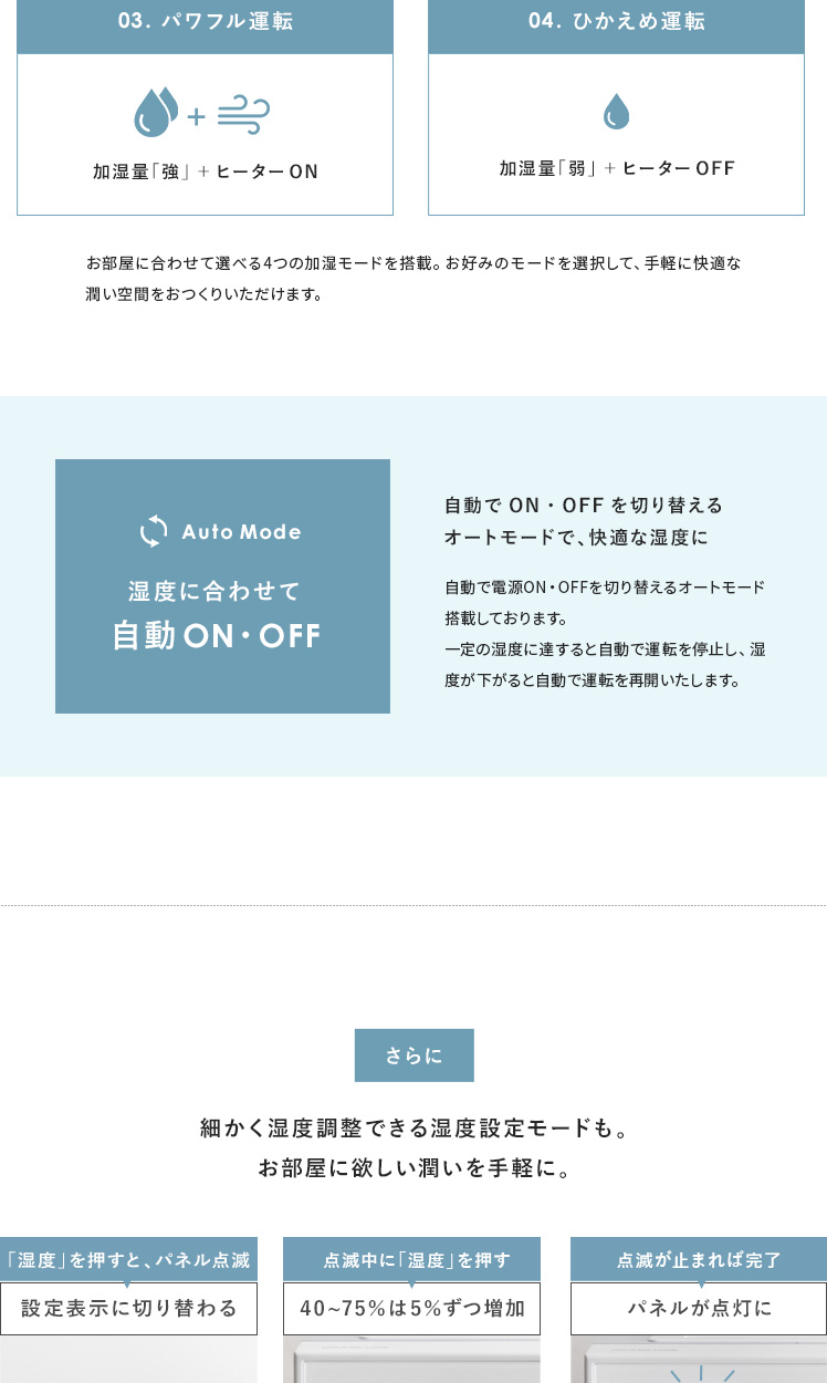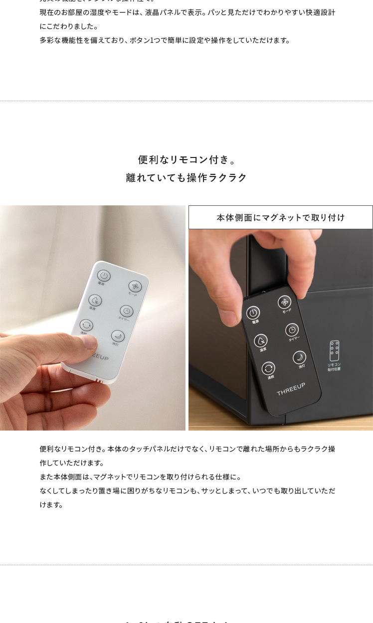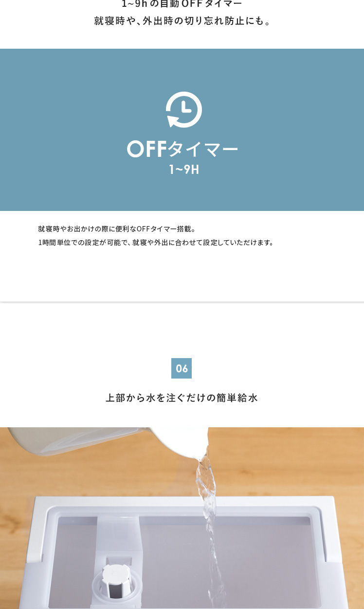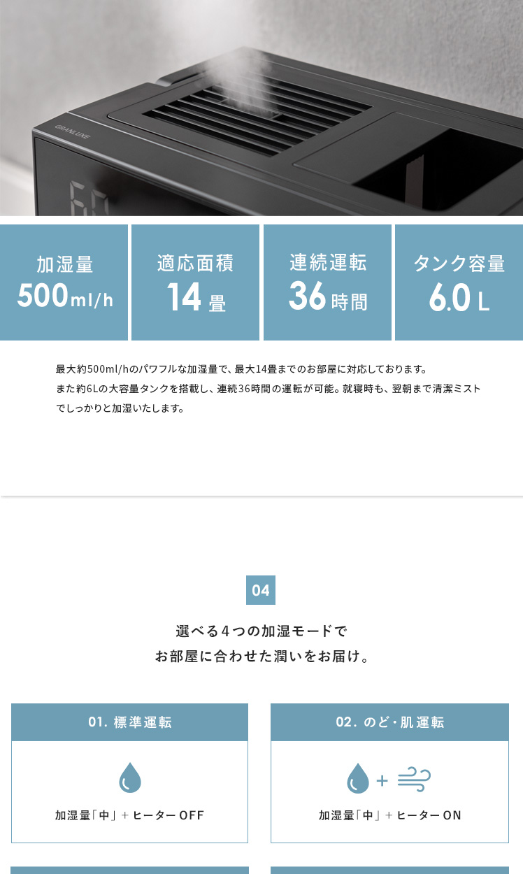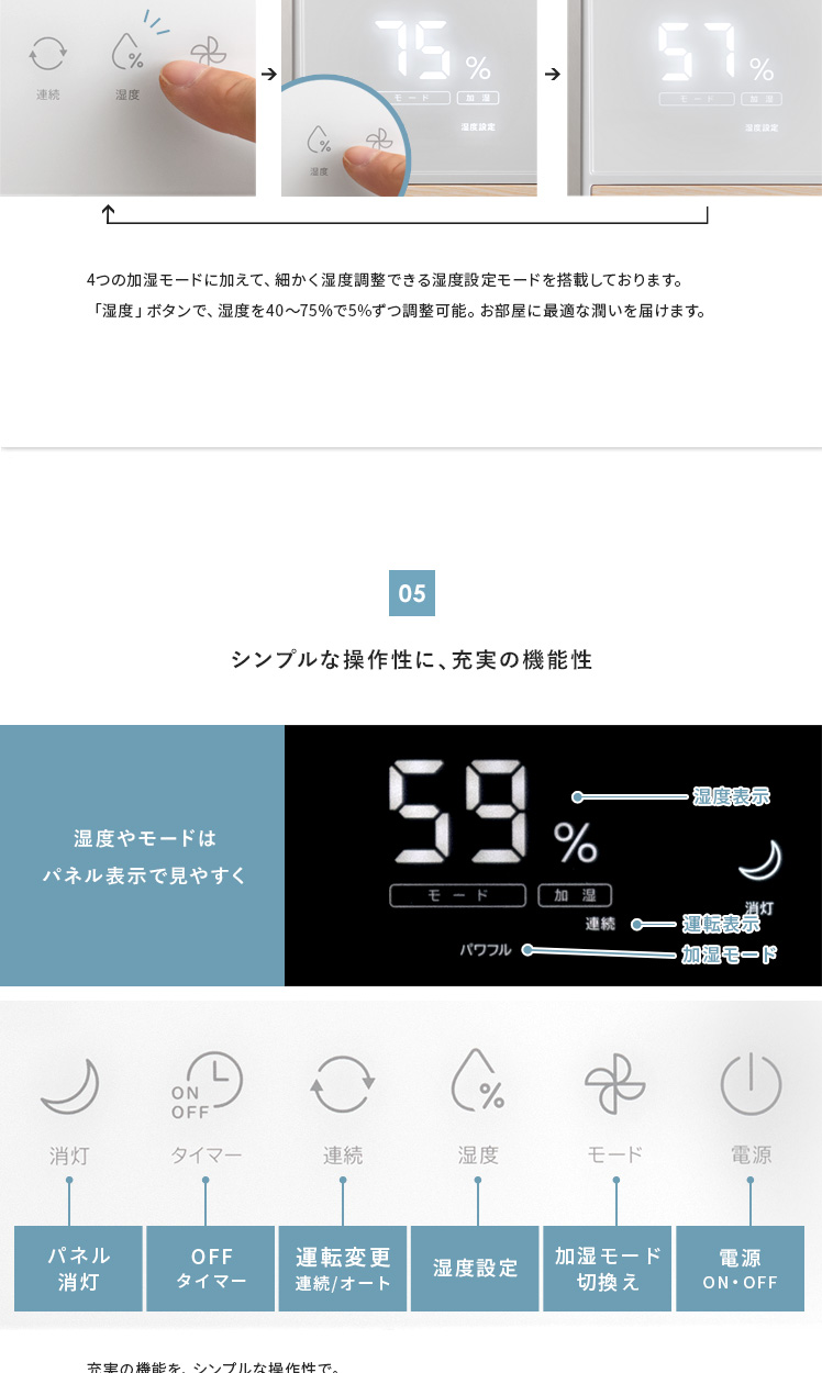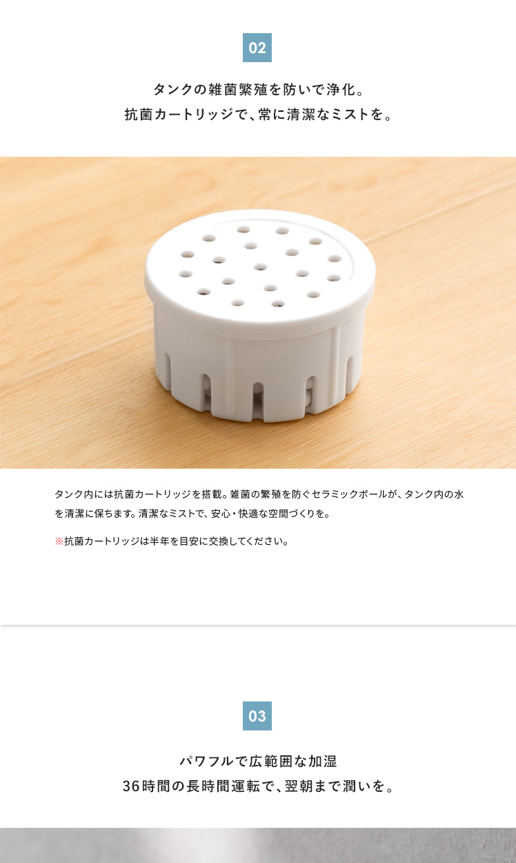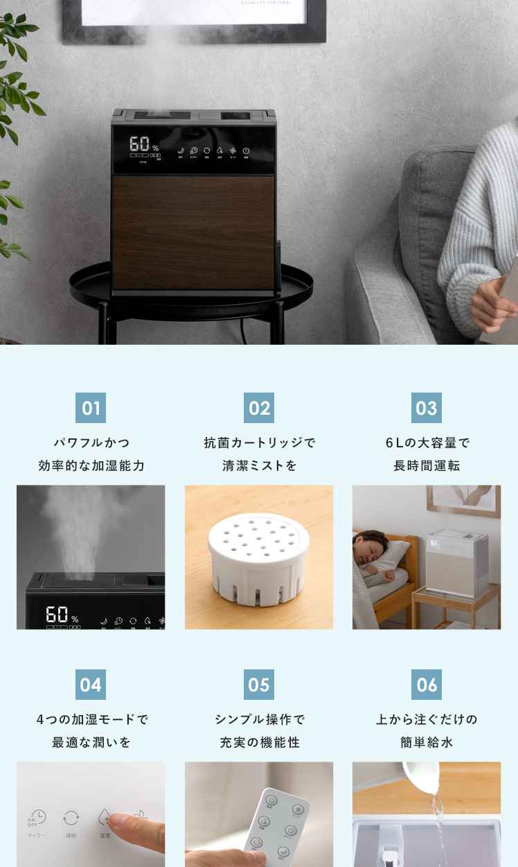 木目調ハイブリッド加湿器/高い性能とユーザビリティを備えたハイブリッド加湿器が、より上質な暮らしを演出。効率的な水路設計とヒーターで、お部屋の温度を下げずにミストを素早く届け、快適な潤い空間をつくります。細かな湿度設定やオフタイマーなど、機能性も充実。また抗菌カートリッジが雑菌の繁殖を抑制し、清潔なミストをお部屋に届けていただけます。