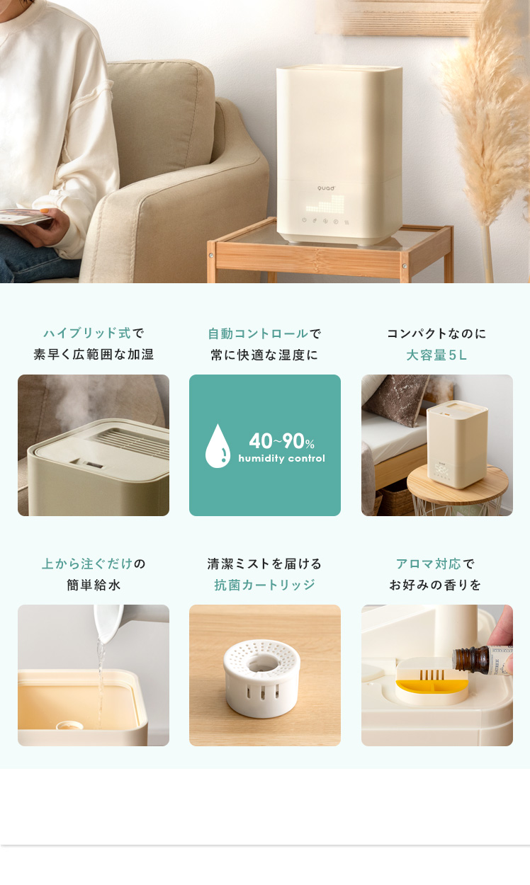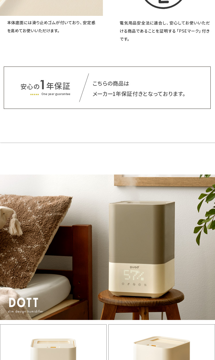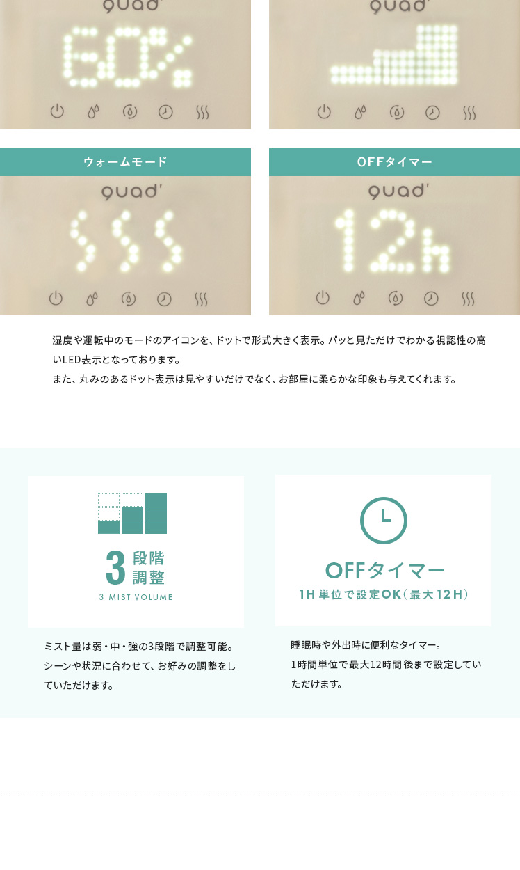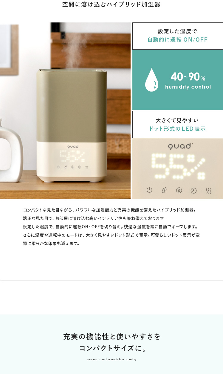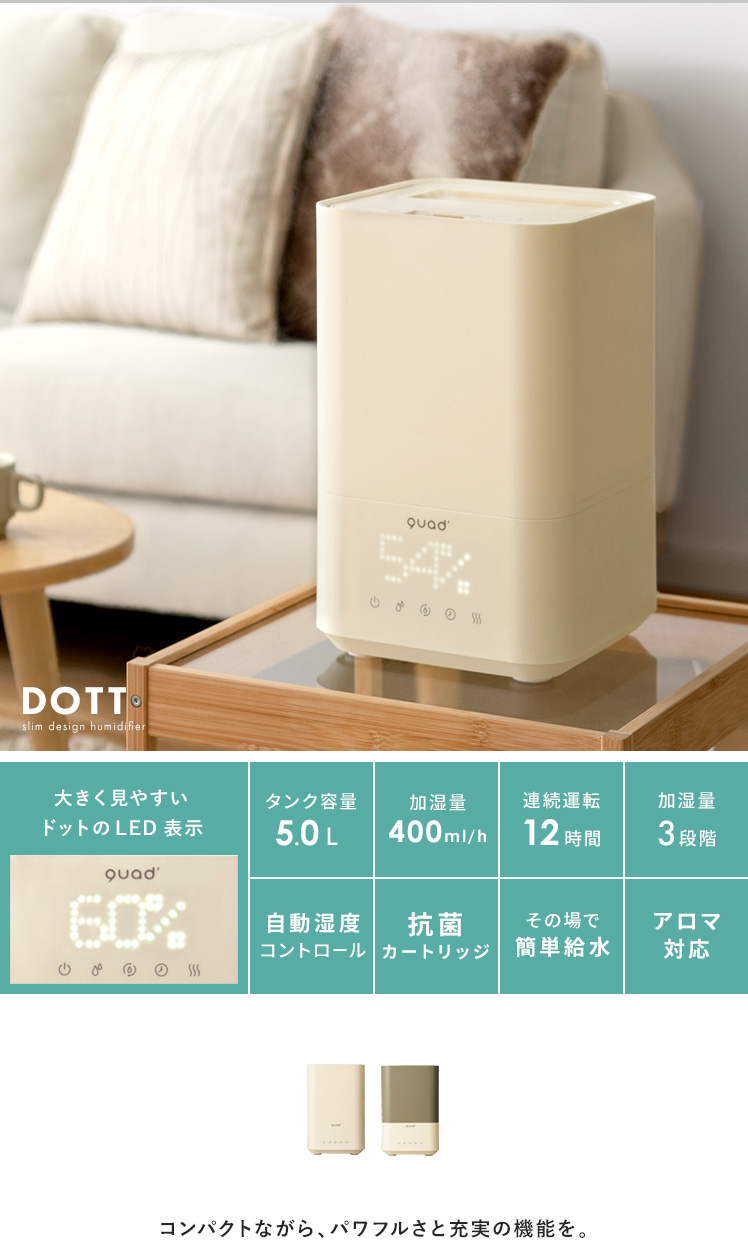 ハイブリット加湿器 DOTT〔ドット〕/コンパクトな見た目ながら、パワフルな加湿能力と充実の機能を備えたハイブリッド加湿器。端正な見た目で、お部屋に溶け込む高いインテリア性も兼ね備えております。設定した湿度で、自動的に運転ON・OFFを切り替え。快適な湿度を常に自動でキープします。さらに湿度や運転中のモードは、大きく見やすいドット形式で表示。可愛らしいドット表示が空間に柔らかな印象も添えます。