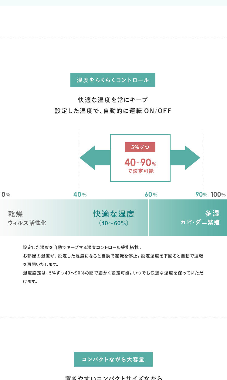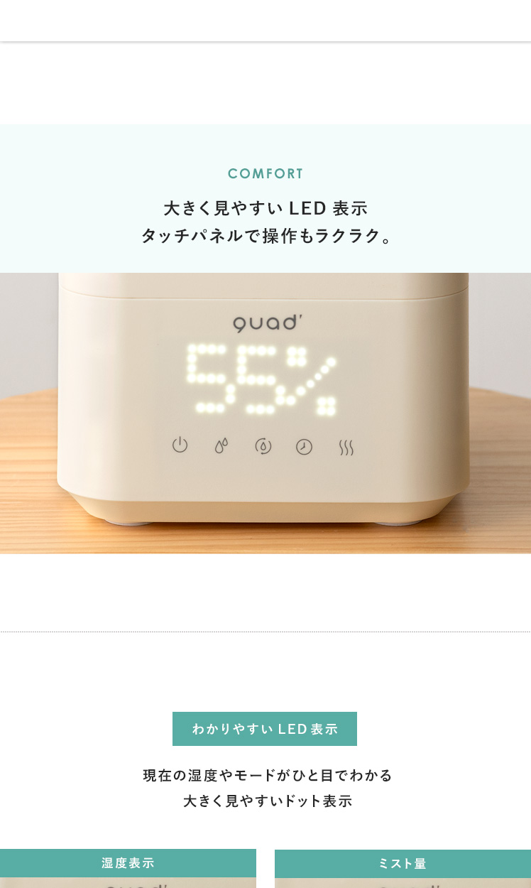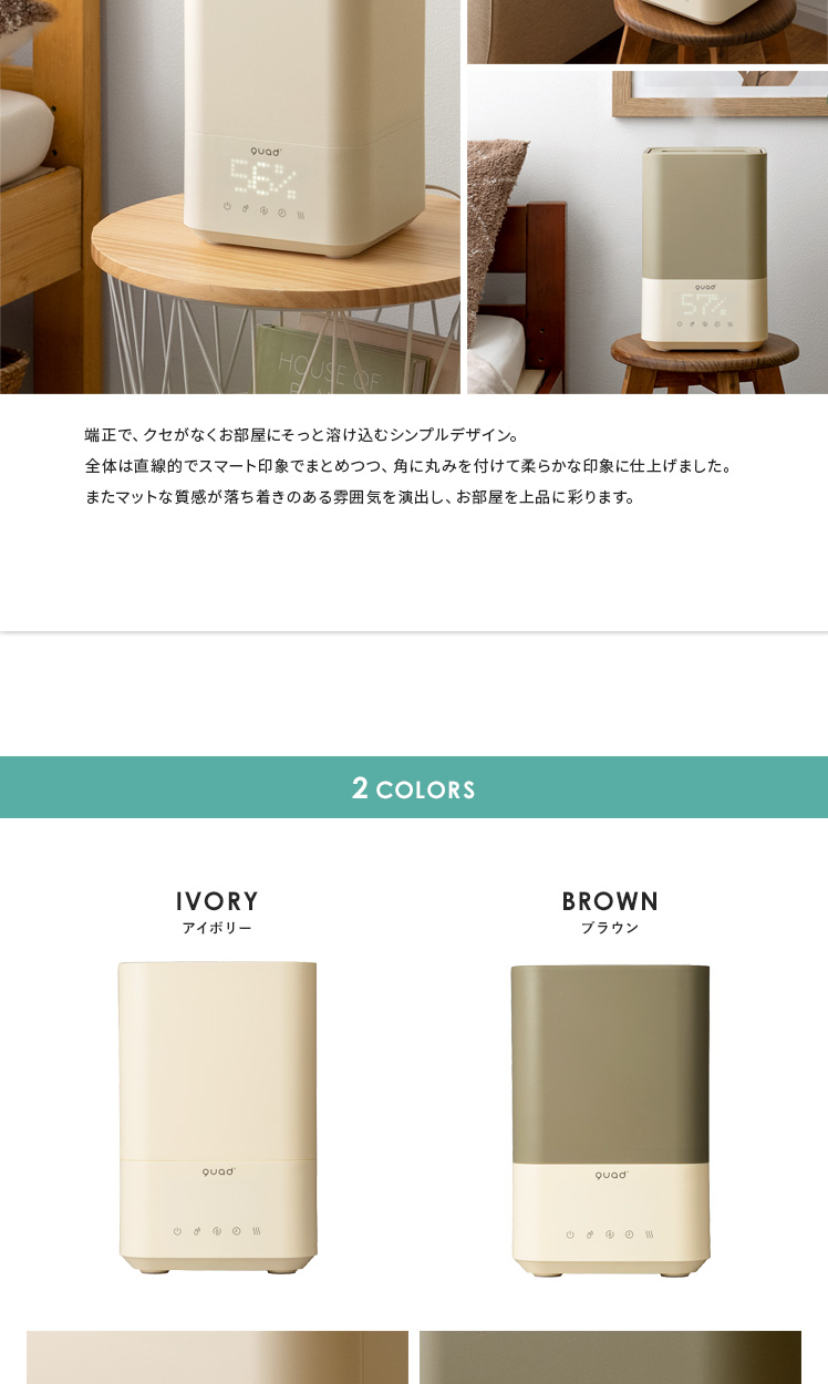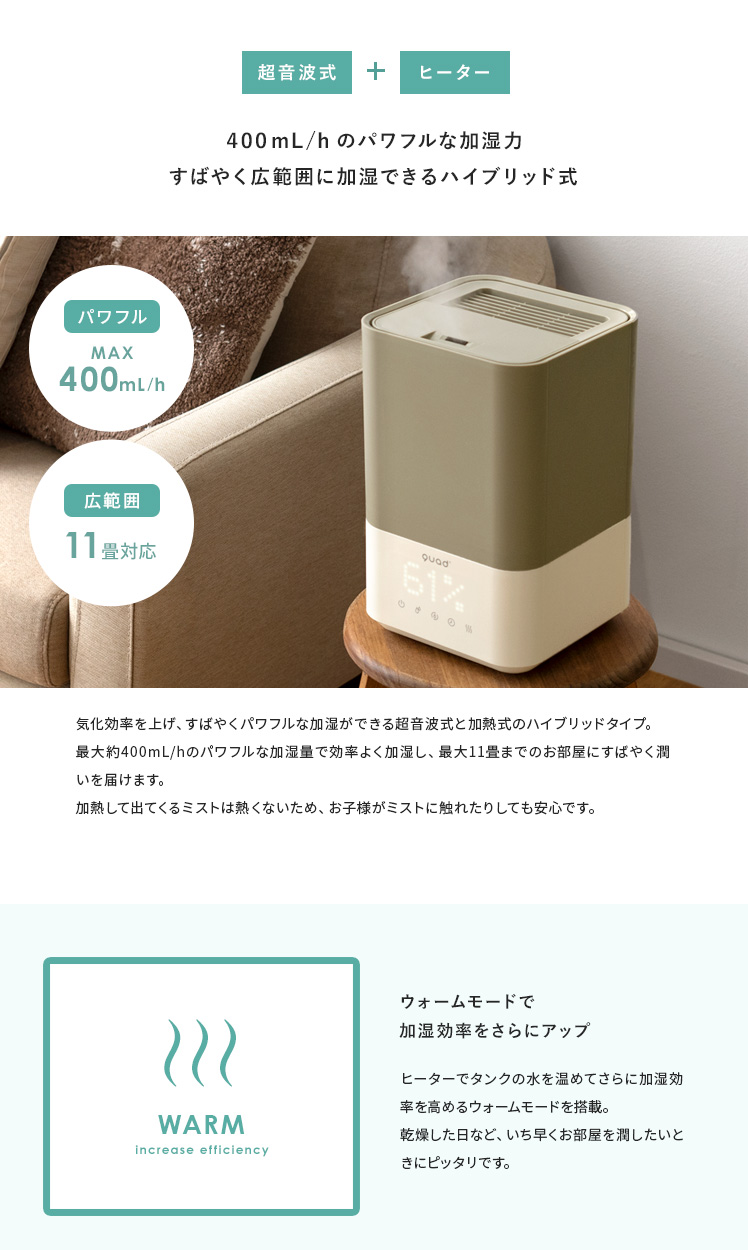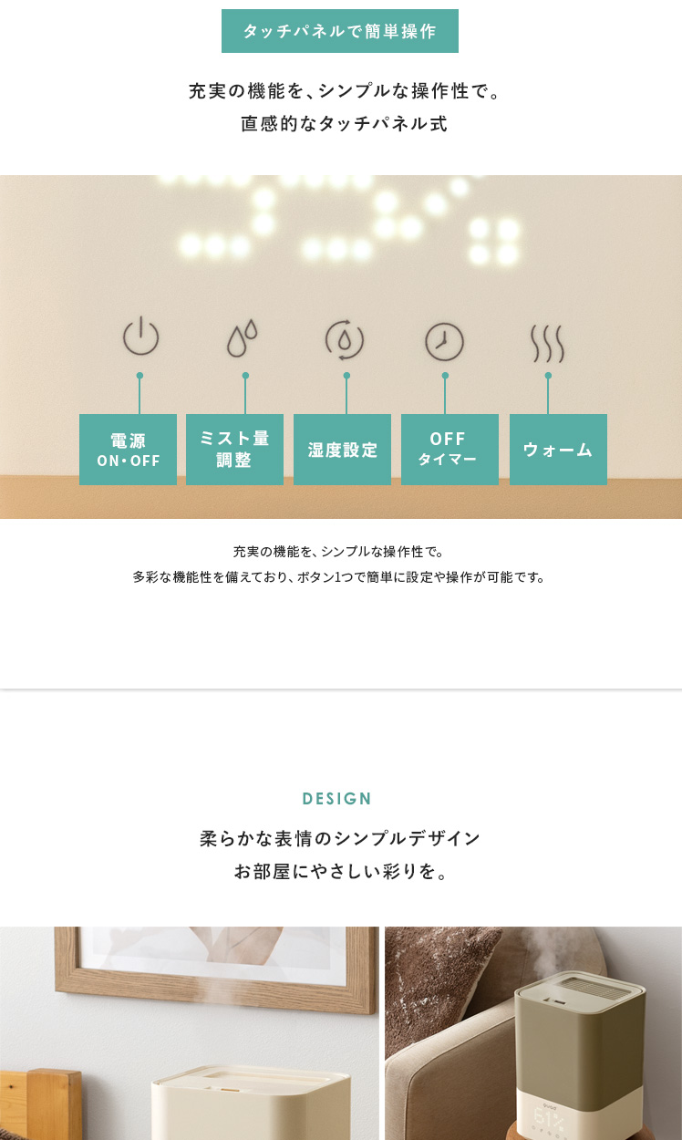 ハイブリット加湿器 DOTT〔ドット〕/コンパクトな見た目ながら、パワフルな加湿能力と充実の機能を備えたハイブリッド加湿器。端正な見た目で、お部屋に溶け込む高いインテリア性も兼ね備えております。設定した湿度で、自動的に運転ON・OFFを切り替え。快適な湿度を常に自動でキープします。さらに湿度や運転中のモードは、大きく見やすいドット形式で表示。可愛らしいドット表示が空間に柔らかな印象も添えます。