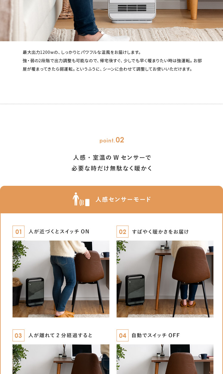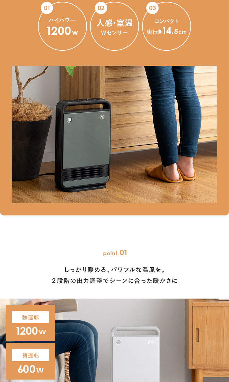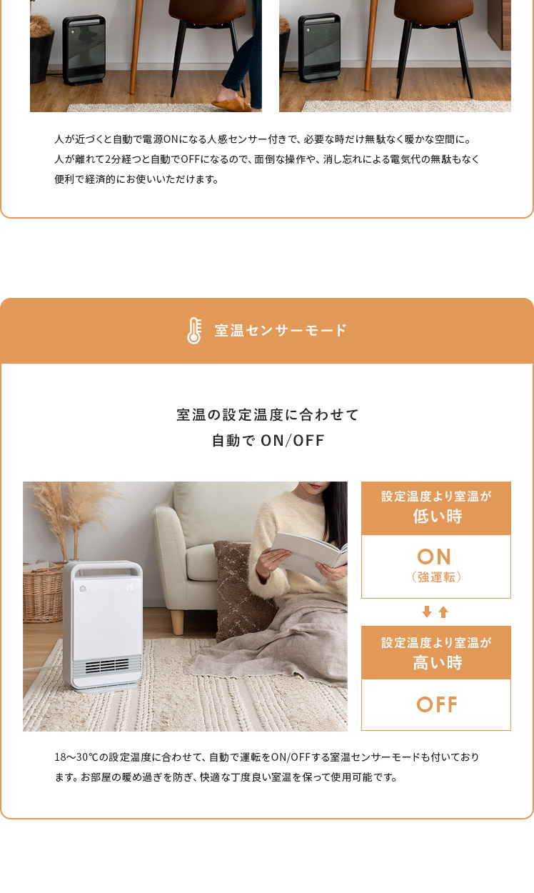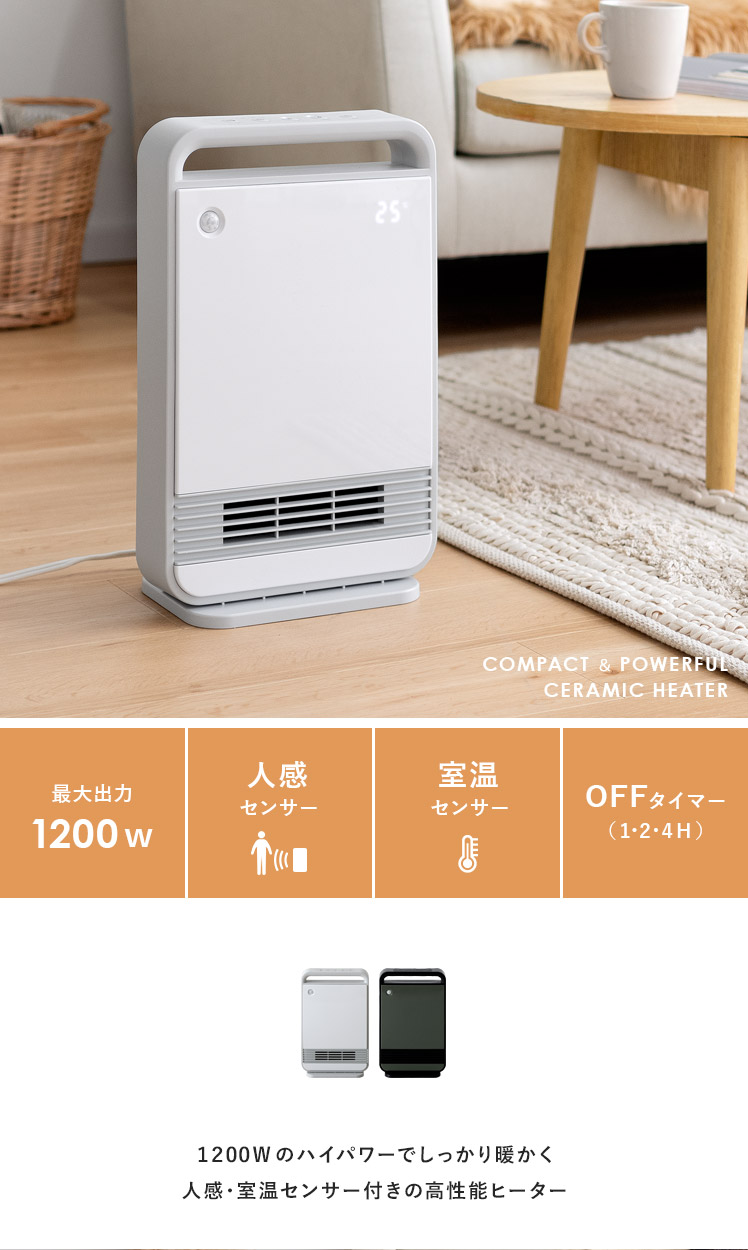 人感・室温センサー付き セラミックヒーター/コンパクトな見た目に、最大出力1200wのハイパワーと、人感・室温、Wの自動センサーを搭載した高性能セラミックヒーター。人が近づくと自動で電源ONになる人感センサーは、面倒な操作や、消し忘れによる電気代の無駄もなく、便利で経済的にお使いいただけます。設定温度に合わせて自動でON/OFFする室温センサーは、お部屋の暖め過ぎを防ぎ、丁度良い室温を保って使用可能です。