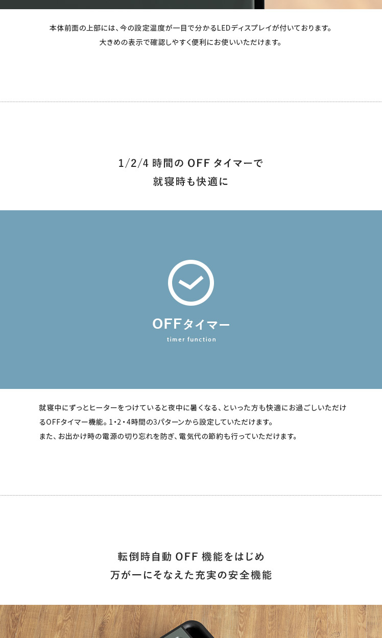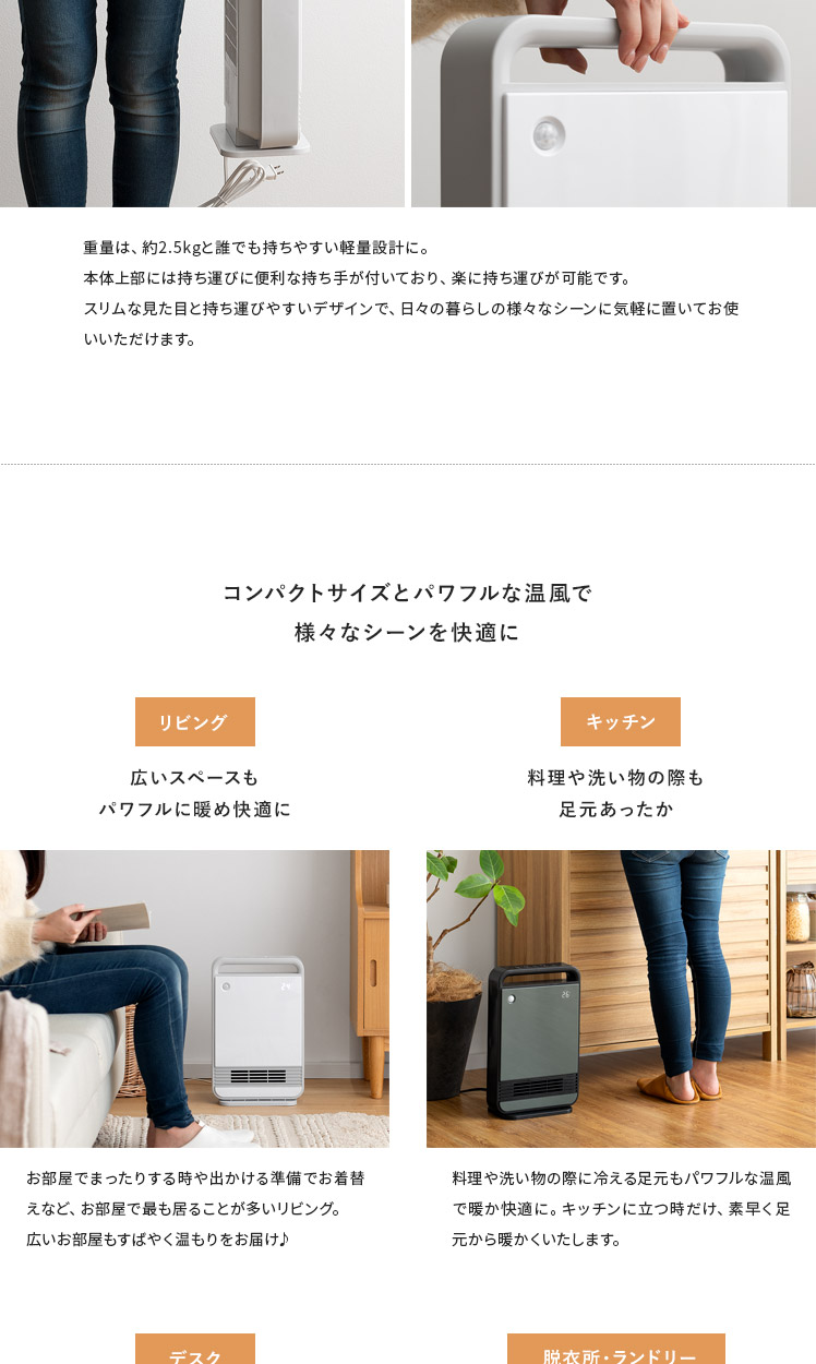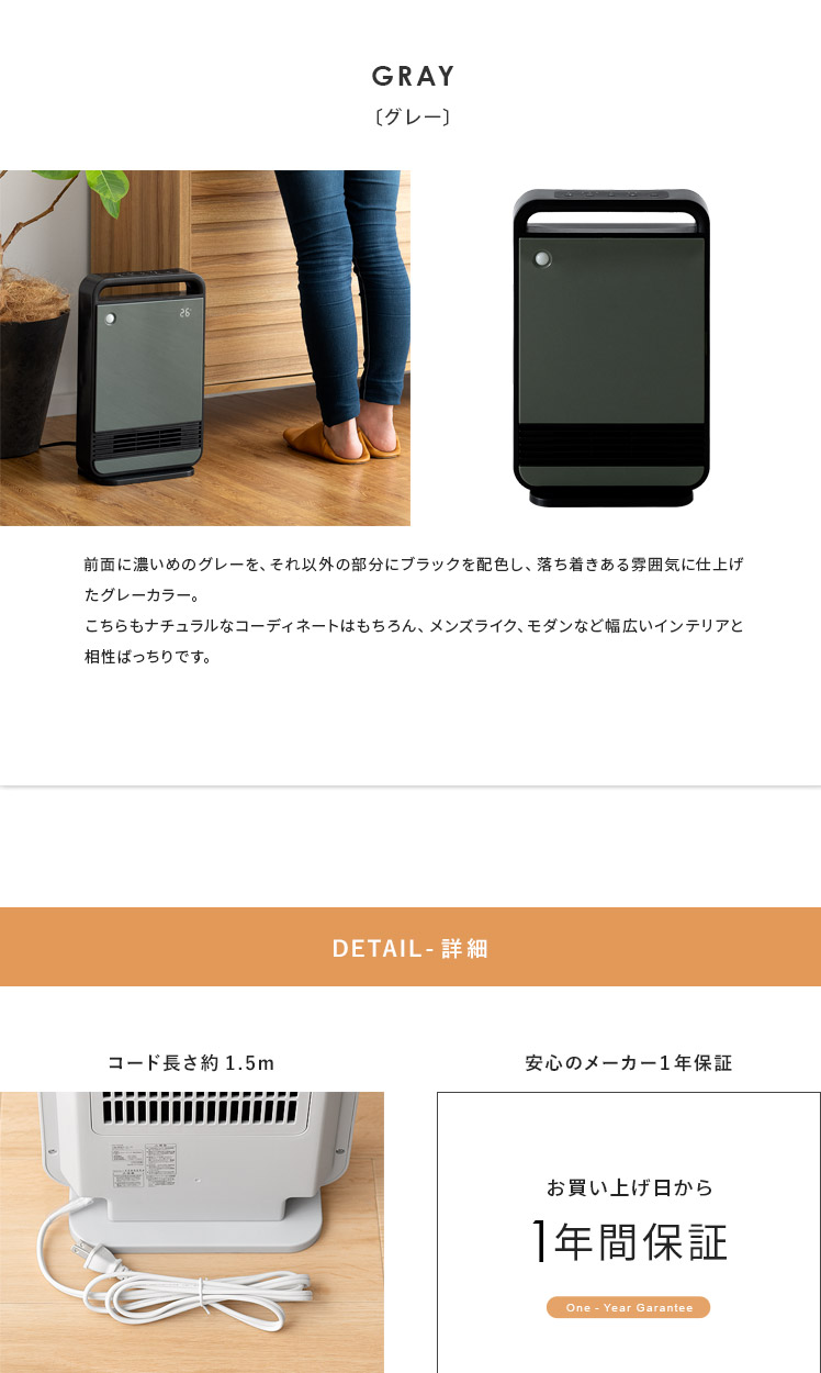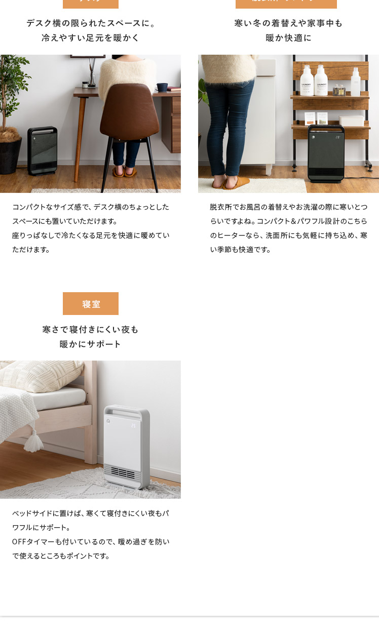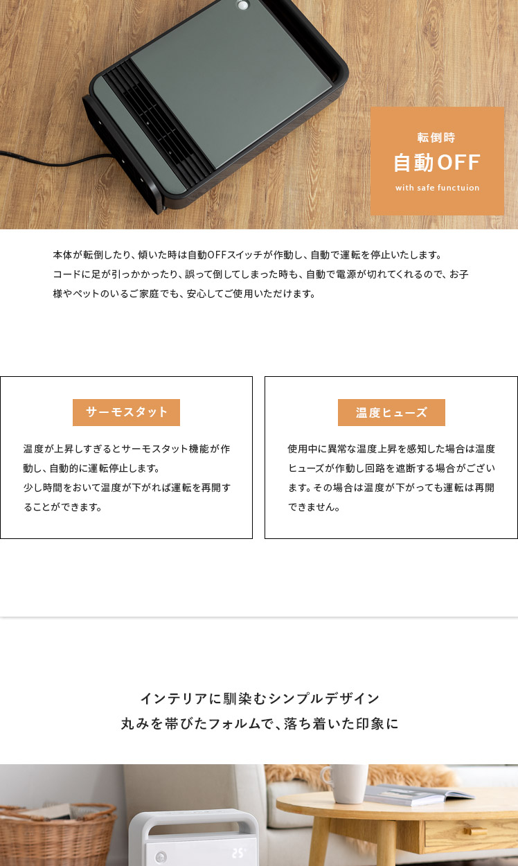 人感・室温センサー付き セラミックヒーター/コンパクトな見た目に、最大出力1200wのハイパワーと、人感・室温、Wの自動センサーを搭載した高性能セラミックヒーター。人が近づくと自動で電源ONになる人感センサーは、面倒な操作や、消し忘れによる電気代の無駄もなく、便利で経済的にお使いいただけます。設定温度に合わせて自動でON/OFFする室温センサーは、お部屋の暖め過ぎを防ぎ、丁度良い室温を保って使用可能です。