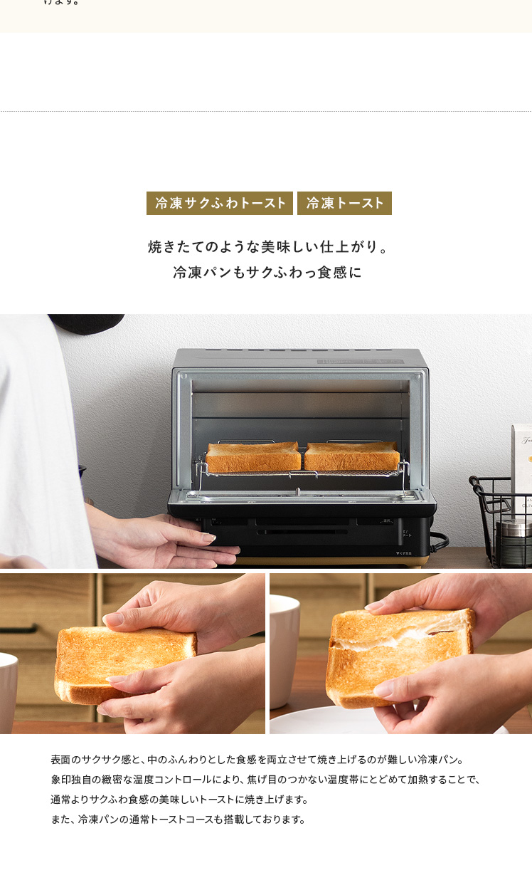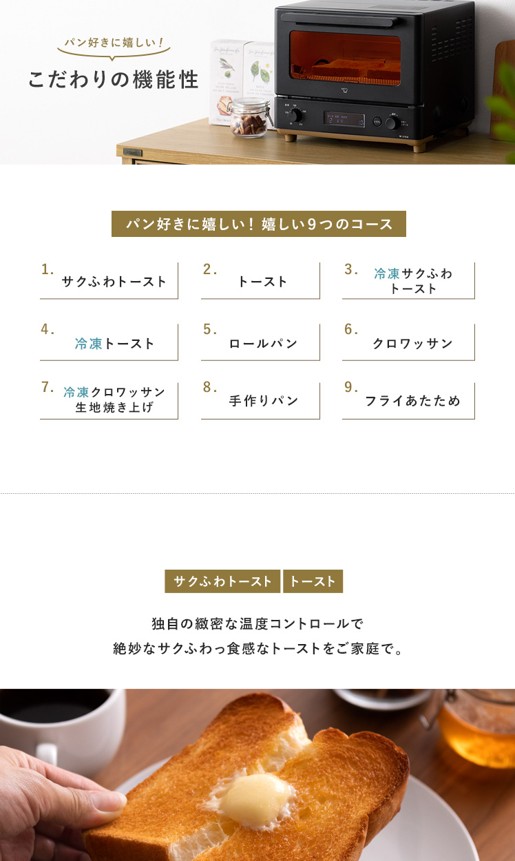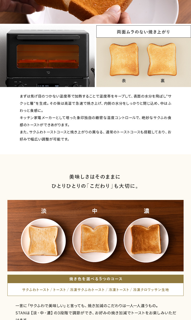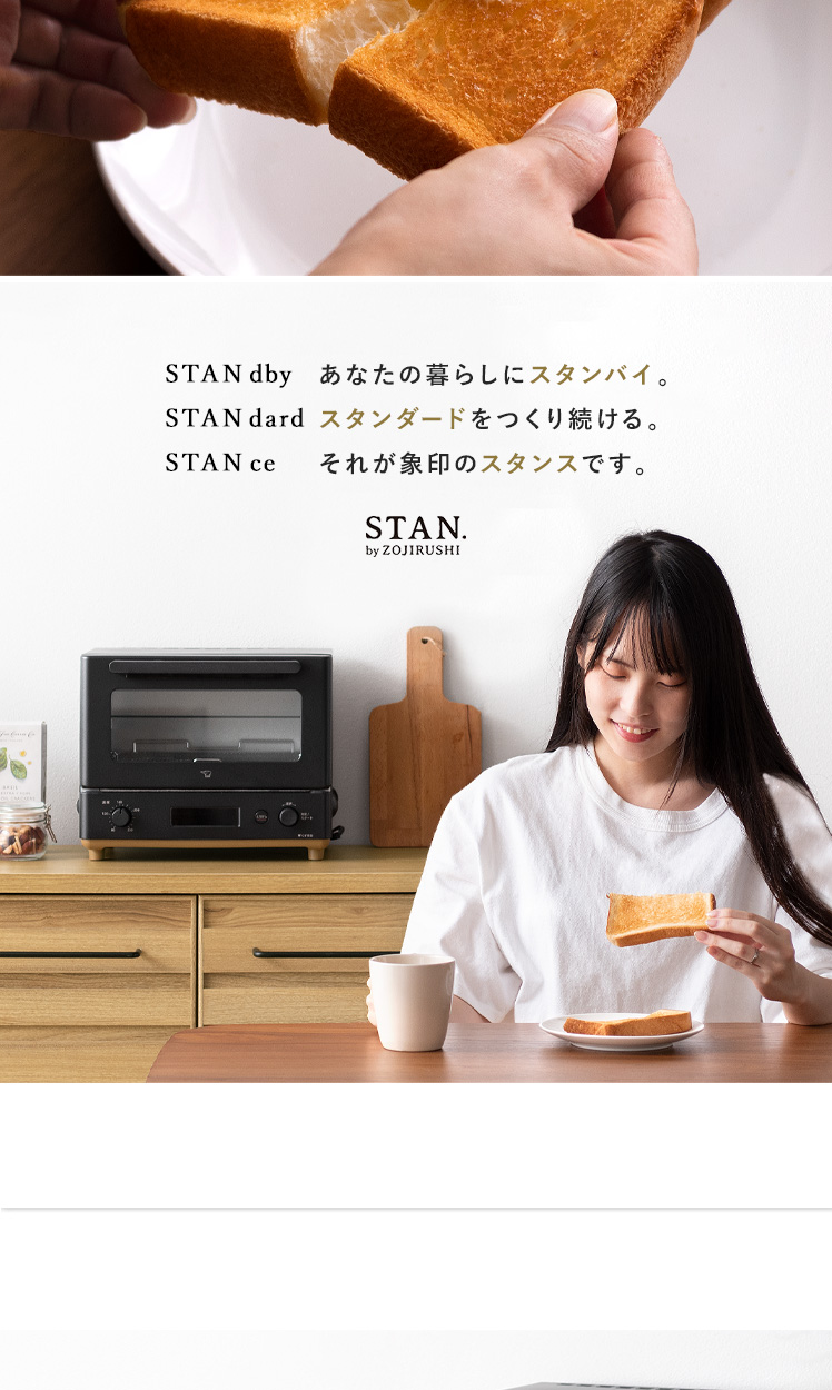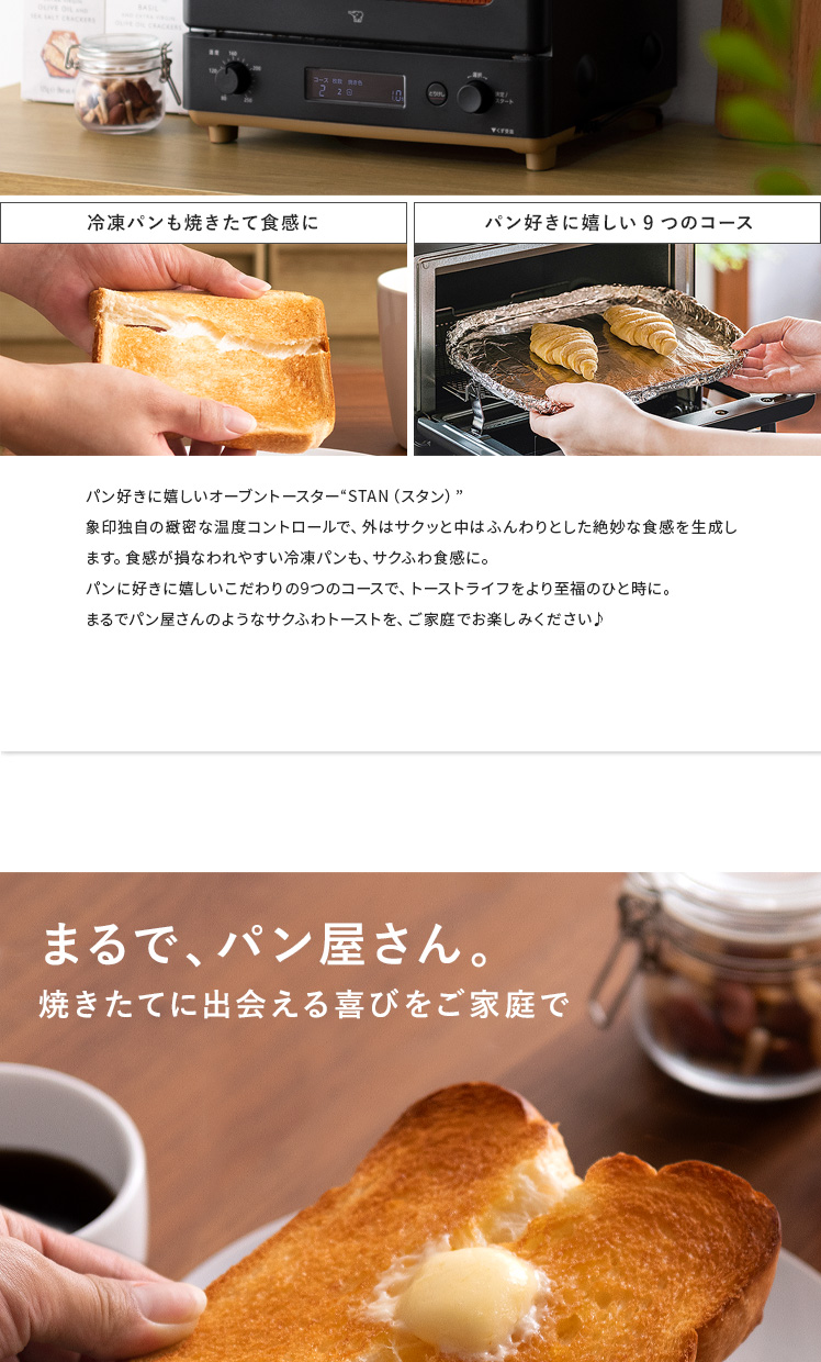 象印 シンプルデザインオーブントースター STAN〔スタン〕/パン好きに嬉しいオーブントースター“STAN(スタン)”象印独自の緻密な温度コントロールで、外はサクッと中はふんわりとした絶妙な食感を生成します。食感が損なわれやすい冷凍パンも、サクふわ食感に。パンに好きに嬉しいこだわりの9つのコースで、トーストライフをより至福のひと時に。まるでパン屋さんのようなサクふわトーストを、ご家庭でお楽しみください♪