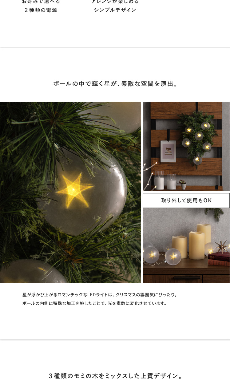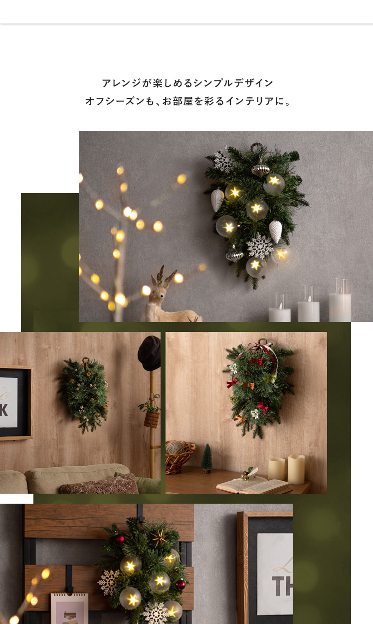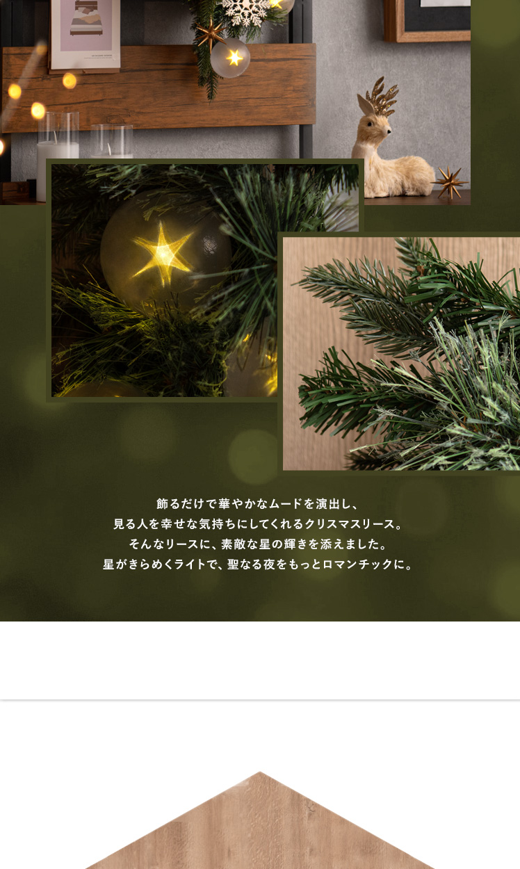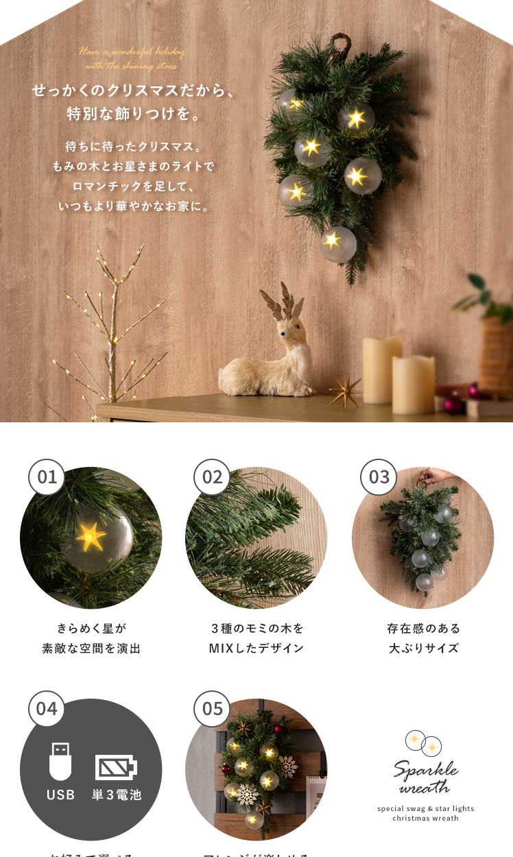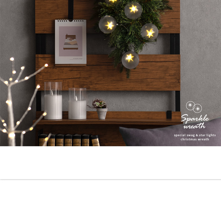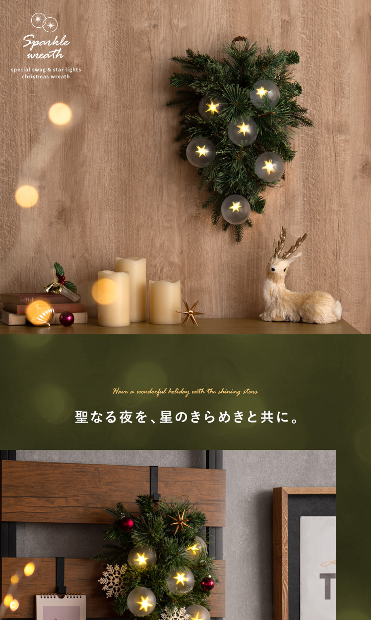 SPARKLE WREATH〔スパークルリース〕/飾るだけで華やかなムードを演出し、見る人を幸せな気持ちにしてくれるクリスマスリース。そんなリースに、素敵な星の輝きを添えました。星がきらめくライトで、聖なる夜をもっとロマンチックに。