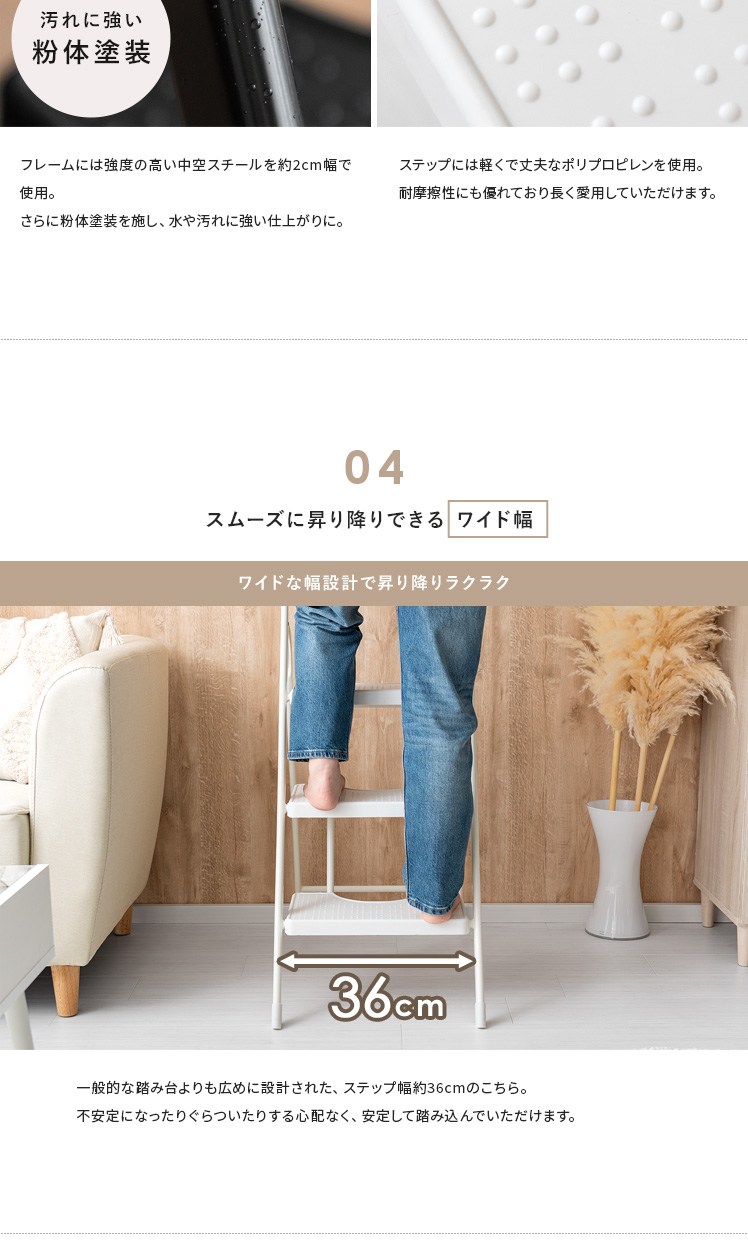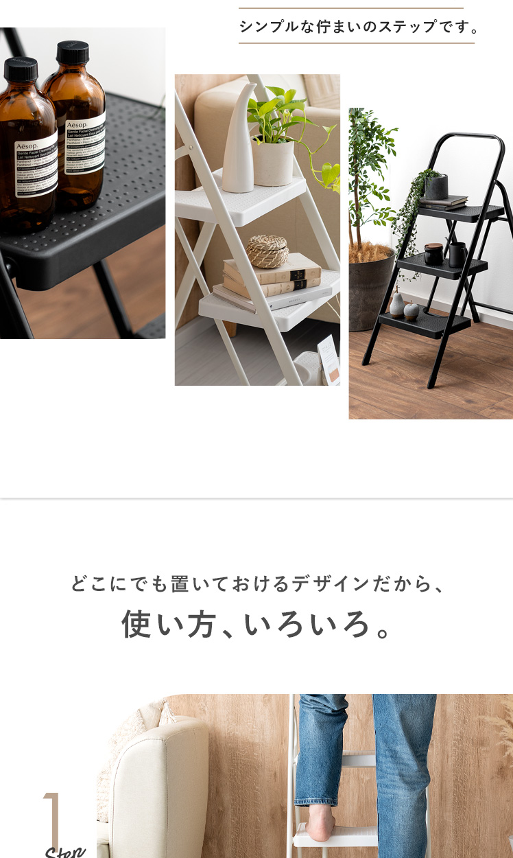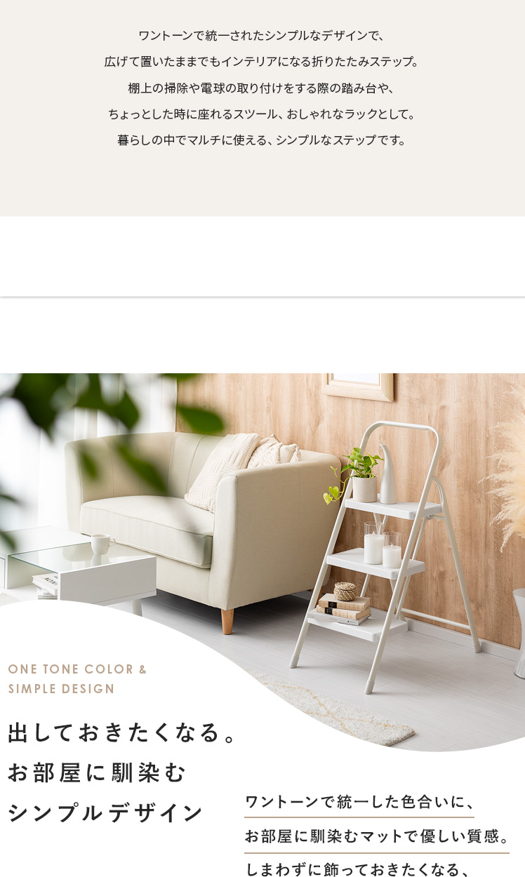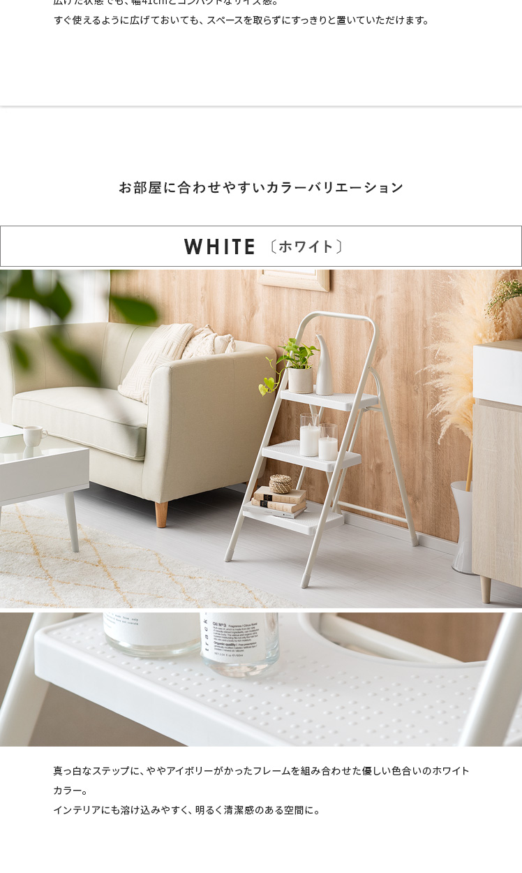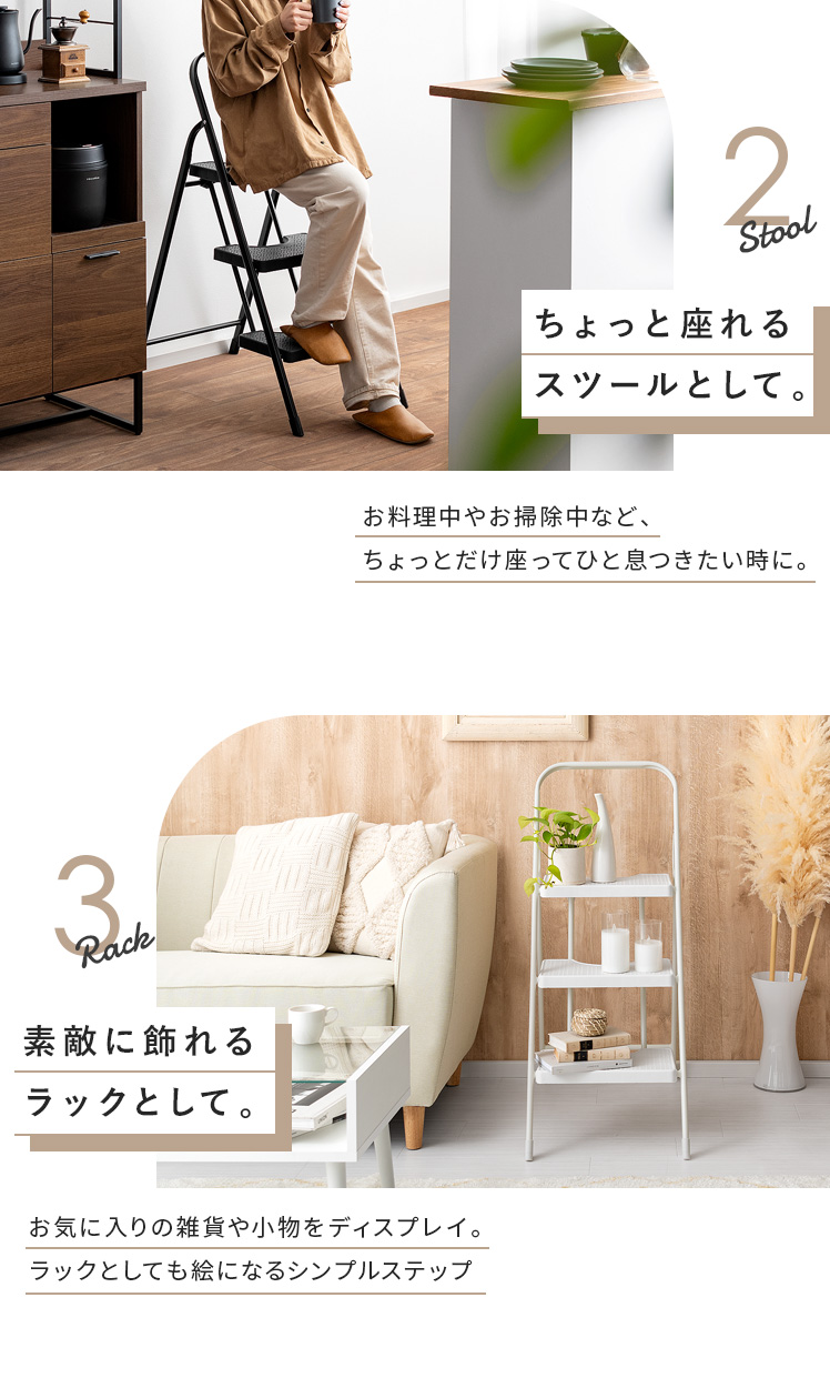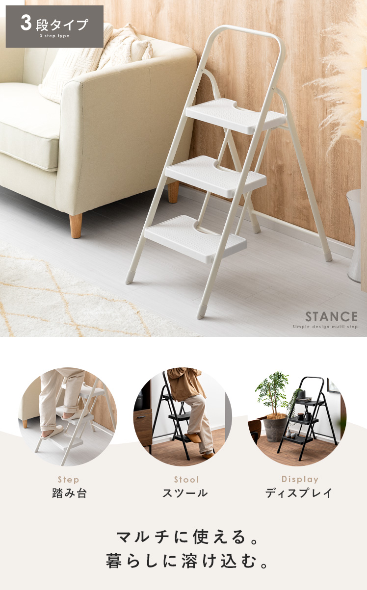 マルチステップ STANCE〔スタンス〕 3段タイプ/ワントーンで統一されたシンプルなデザインで、広げて置いたままでもインテリアになる折りたたみステップ。棚上の掃除や電球の取り付けをする際の踏み台や、ちょっとした時に座れるスツール、おしゃれなラックとして。暮らしの中でマルチに使える、シンプルなステップです。