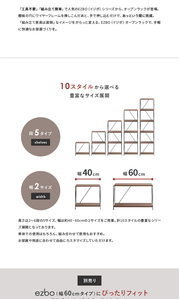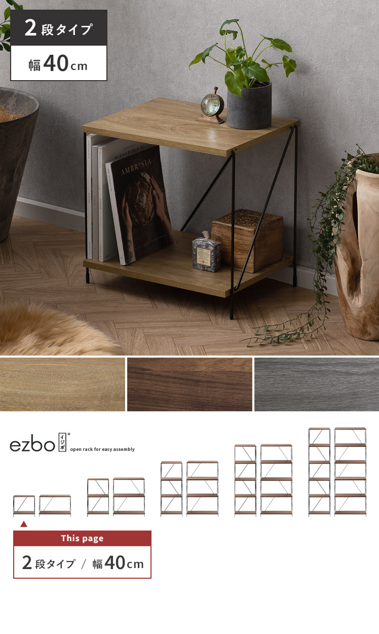簡単組み立てワイヤーラックEzbo〔イジボ〕 幅40cm 2段タイプ/「工具不要」「組み立て簡単」で人気のEZBO(イジボ)シリーズから、オープンラックが登場。棚板の穴にワイヤーフレームを挿しこんだあと、手で押し込むだけで、あっという間に完成。「組み立て家具は面倒」なイメージをがらっと変える、EZBO(イジボ)オープンラックで、手軽に快適なお部屋づくりを。