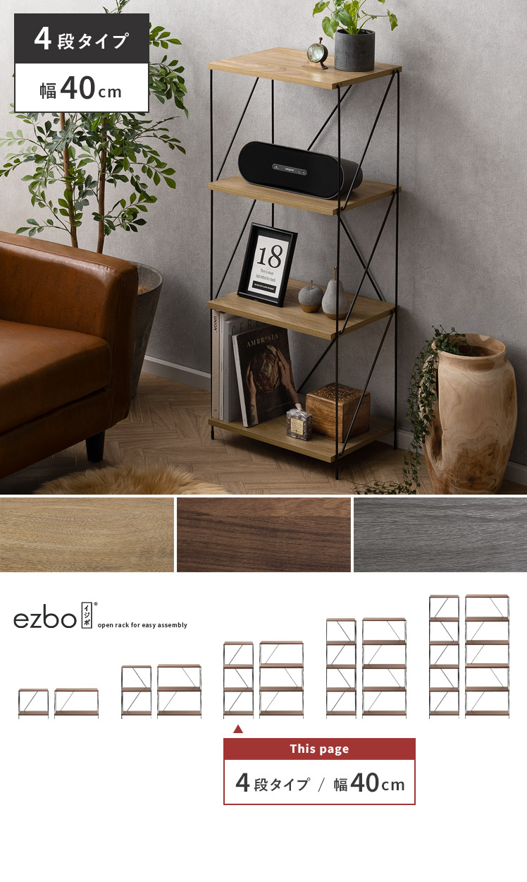簡単組み立てワイヤーラックEzbo〔イジボ〕 幅40cm 4段タイプ/「工具不要」「組み立て簡単」で人気のEZBO(イジボ)シリーズから、オープンラックが登場。棚板の穴にワイヤーフレームを挿しこんだあと、手で押し込むだけで、あっという間に完成。「組み立て家具は面倒」なイメージをがらっと変える、EZBO(イジボ)オープンラックで、手軽に快適なお部屋づくりを。