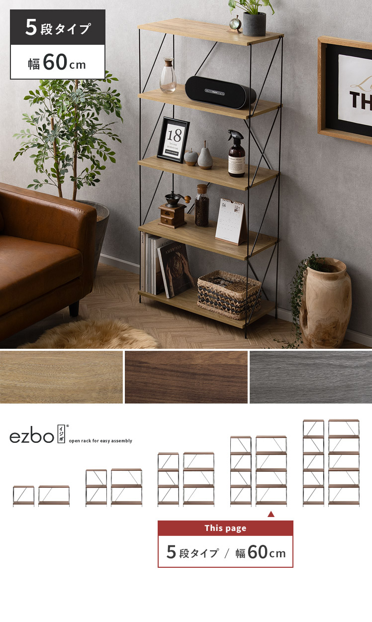 簡単組み立てワイヤーラックEzbo〔イジボ〕 幅60cm 5段タイプ/「工具不要」「組み立て簡単」で人気のEZBO(イジボ)シリーズから、オープンラックが登場。棚板の穴にワイヤーフレームを挿しこんだあと、手で押し込むだけで、あっという間に完成。「組み立て家具は面倒」なイメージをがらっと変える、EZBO(イジボ)オープンラックで、手軽に快適なお部屋づくりを。