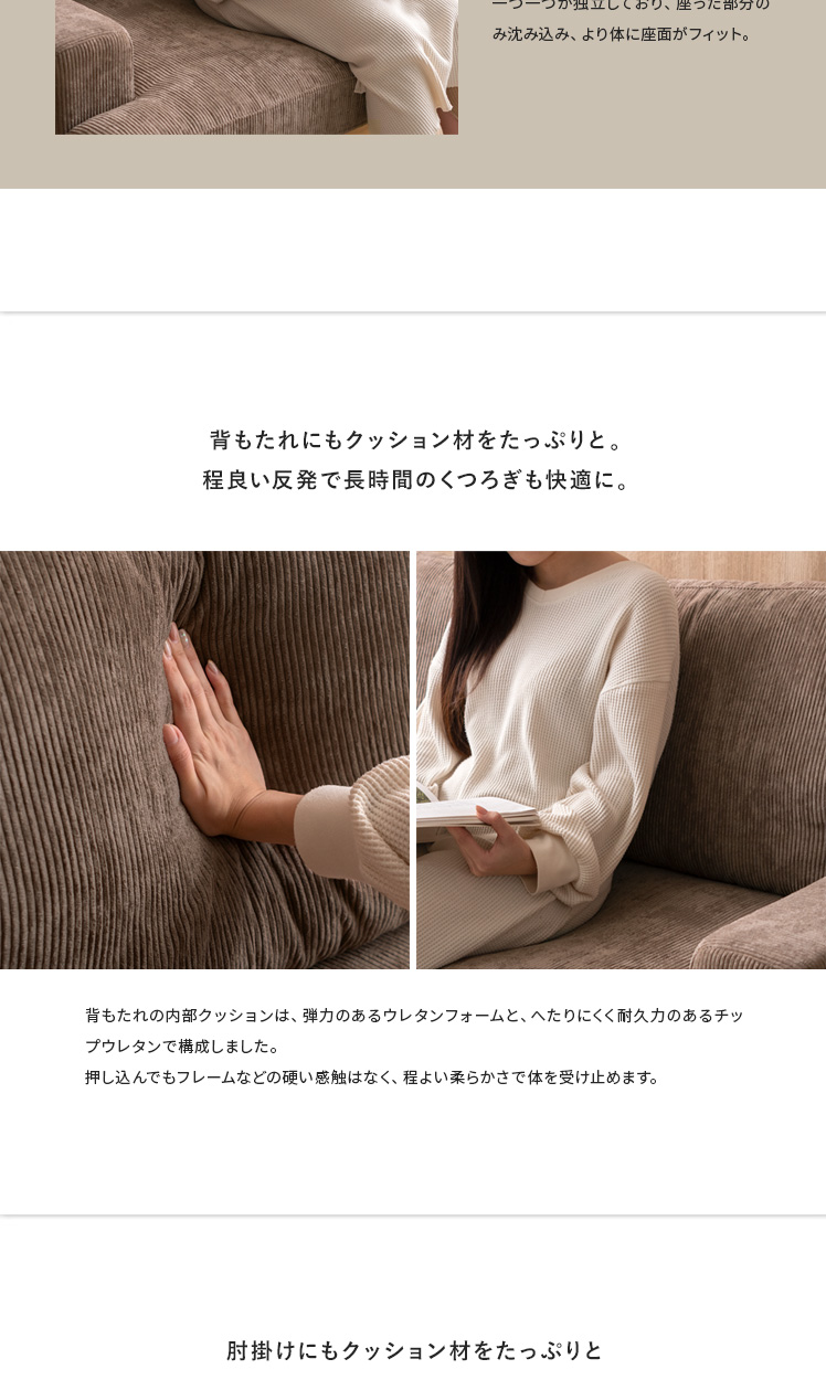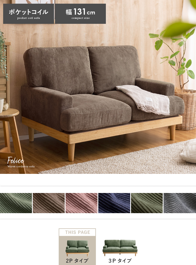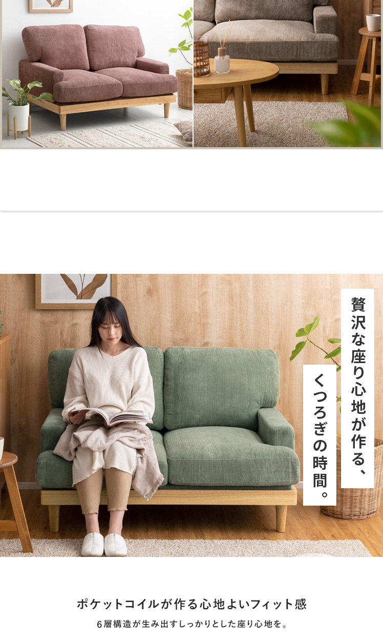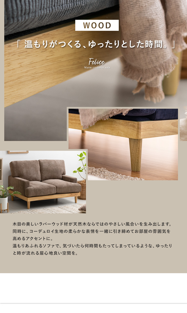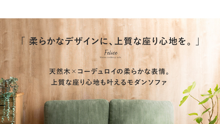 コーデュロイソファ Felice〔フェリーチェ〕 2人掛けタイプ/温かな天然木と表情豊かなコーデュロイを組み合わせた、上質な座り心地のモダンソファ。天然木とコーデュロイがつくる柔らかな表情が、お部屋にゆとりと居心地の良さを与えます。座面は弾力・耐久性に定評のあるポケットコイルや、ふかふかの羽毛などを重ねた6層構造で、格別な座り心地に。寝ころんで映画を見る1人の時間も、大切な人とゆったり過ごす時間も、いつもゆとりを感じる特別な空間に。