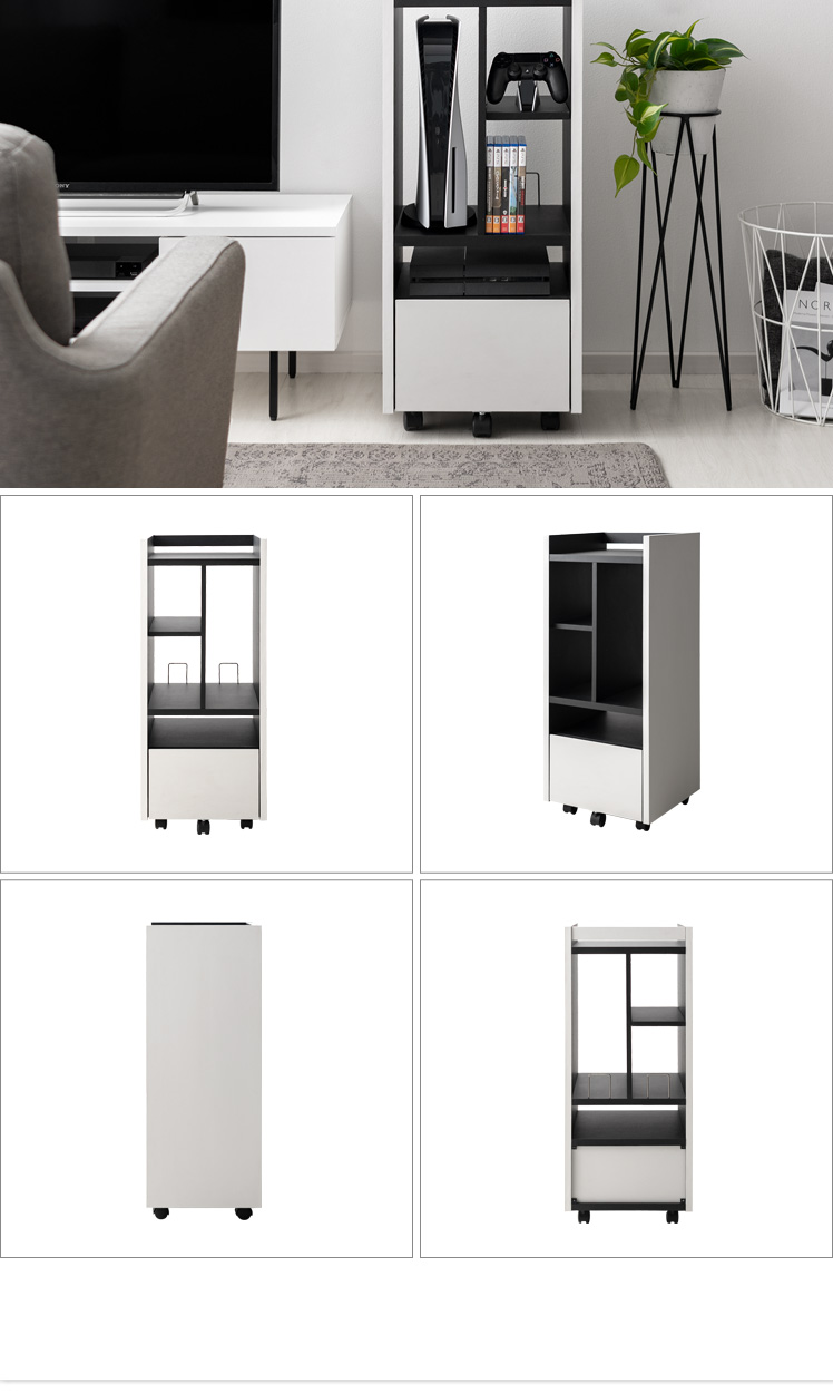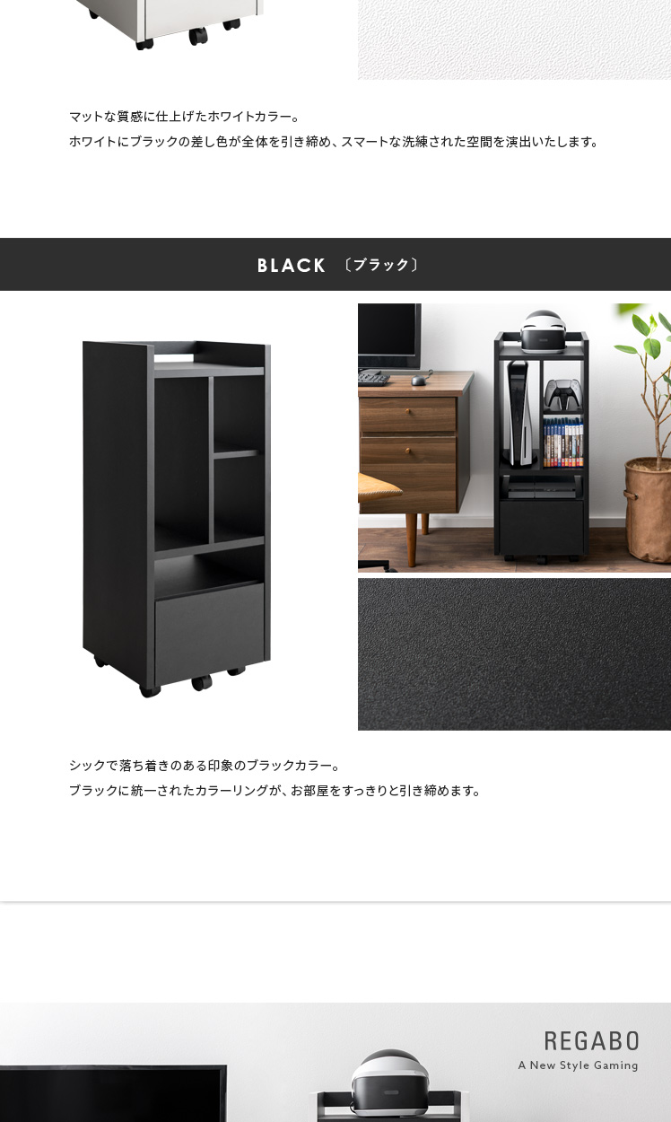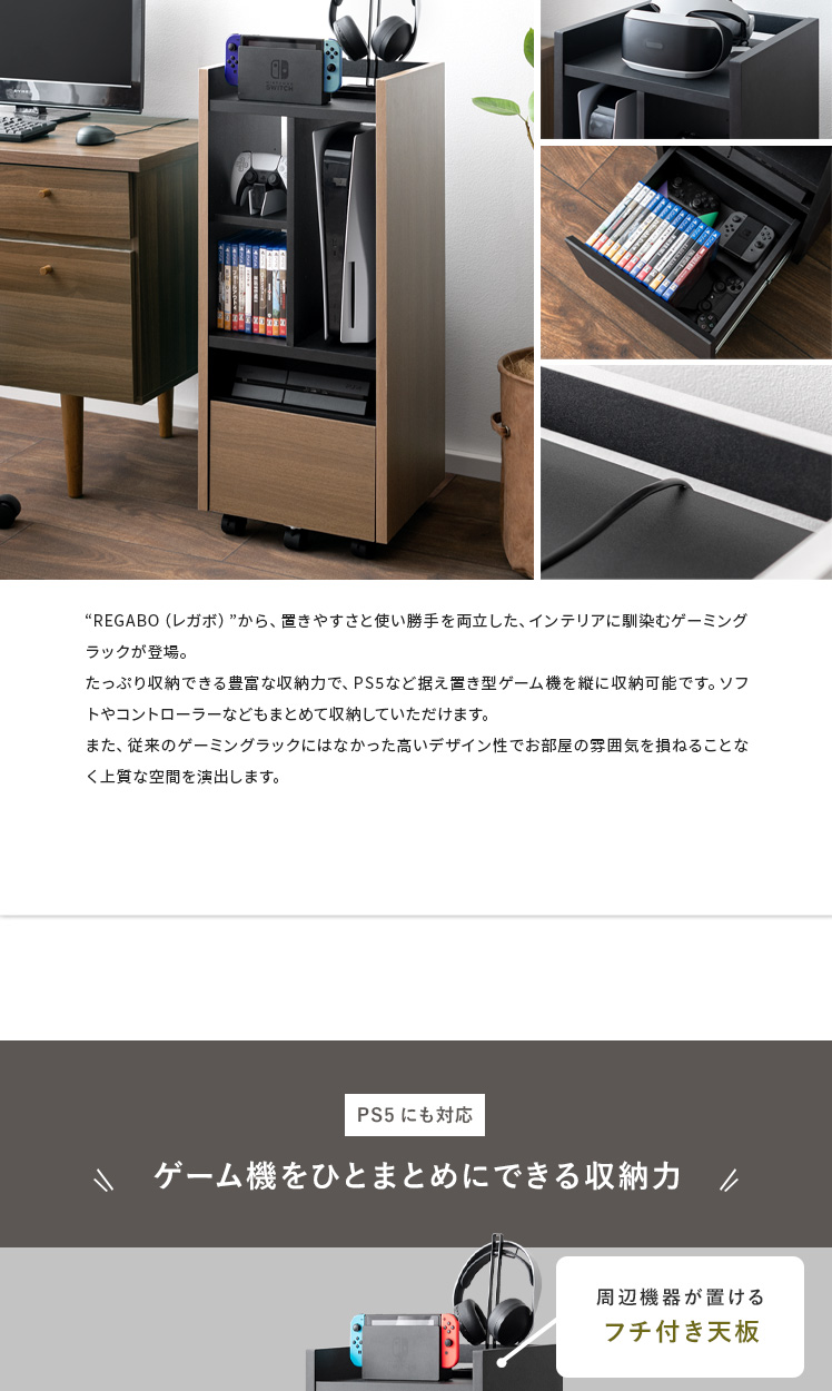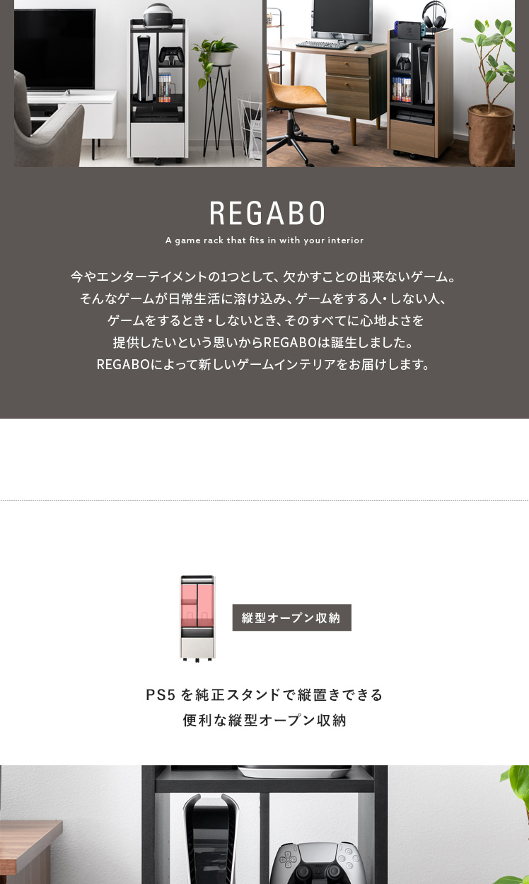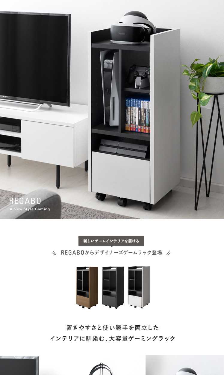 ゲーミングラック REGABO〔レガボ〕/“REGABO(レガボ)”から、置きやすさと使い勝手を両立した、インテリアに馴染むゲーミングラックが登場。たっぷり収納できる豊富な収納力で、PS5など据え置き型ゲーム機を縦に収納可能です。ソフトやコントローラーなどもまとめて収納していただけます。また、従来のゲーミングラックにはなかった高いデザイン性でお部屋の雰囲気を損ねることなく上質な空間を演出します。