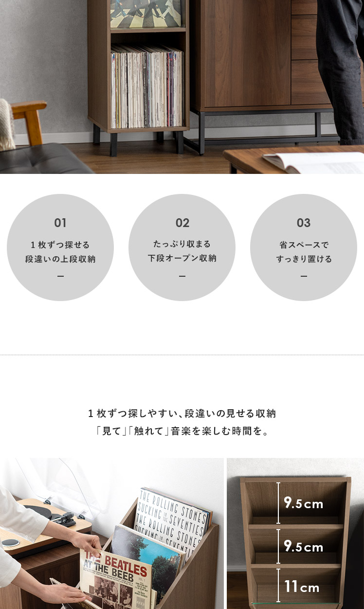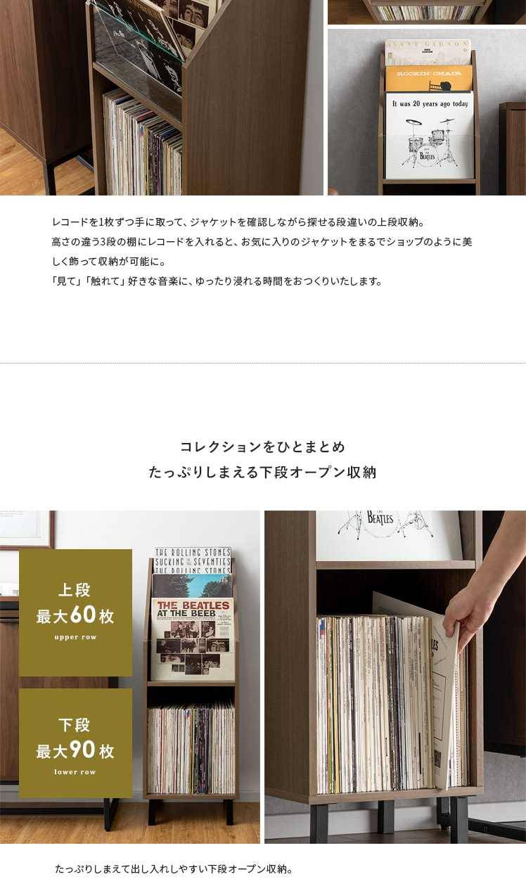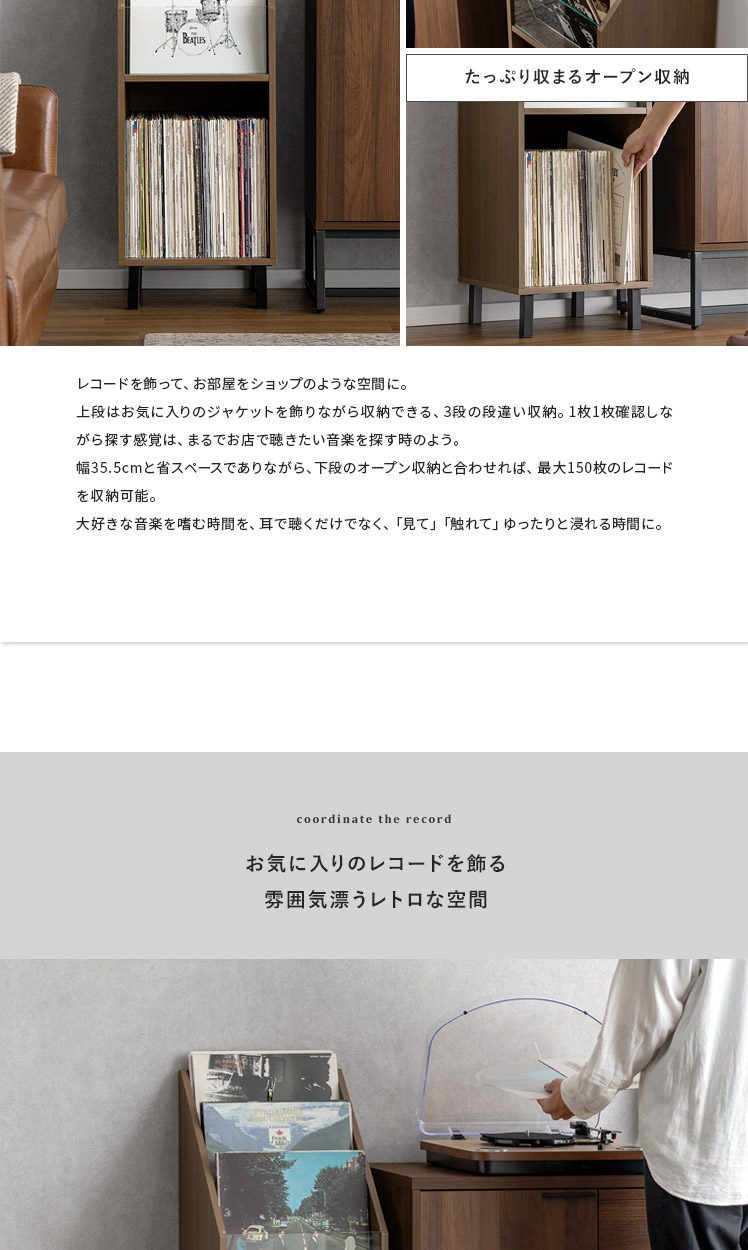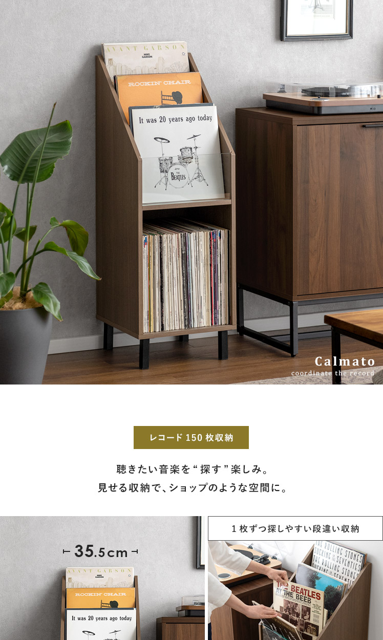 レコードラック Calmato〔カルマート〕/レコードを飾って、お部屋をショップのような空間に。上段はお気に入りのジャケットを飾りながら収納できる、3段の段違い収納。1枚1枚確認しながら探す感覚は、まるでお店で聴きたい音楽を探す時のよう。幅35.5cmと省スペースでありながら、下段のオープン収納と合わせれば、最大150枚のレコードを収納可能。大好きな音楽を嗜む時間を、耳で聴くだけでなく、「見て」「触れて」ゆったりと浸れる時間に。