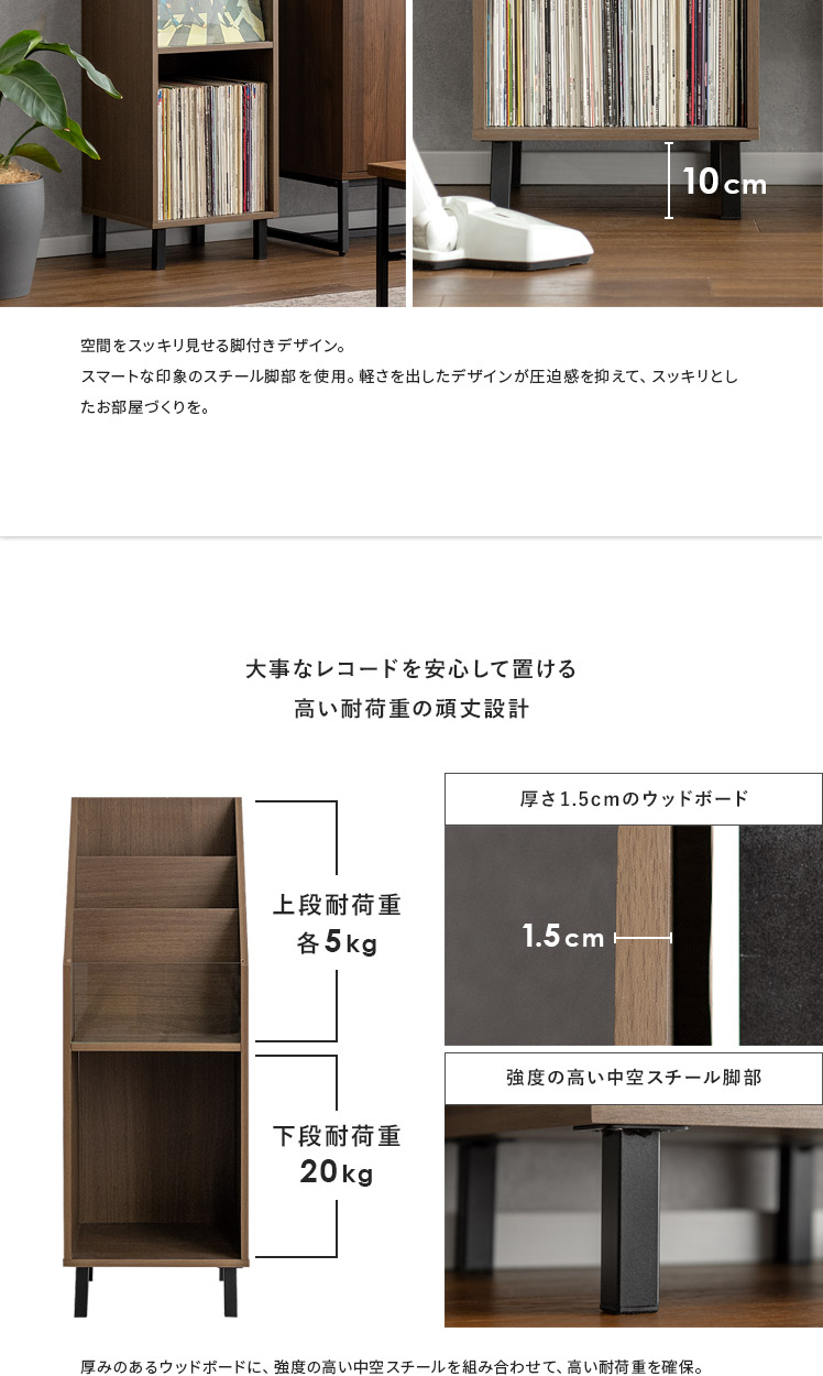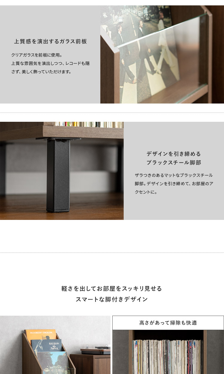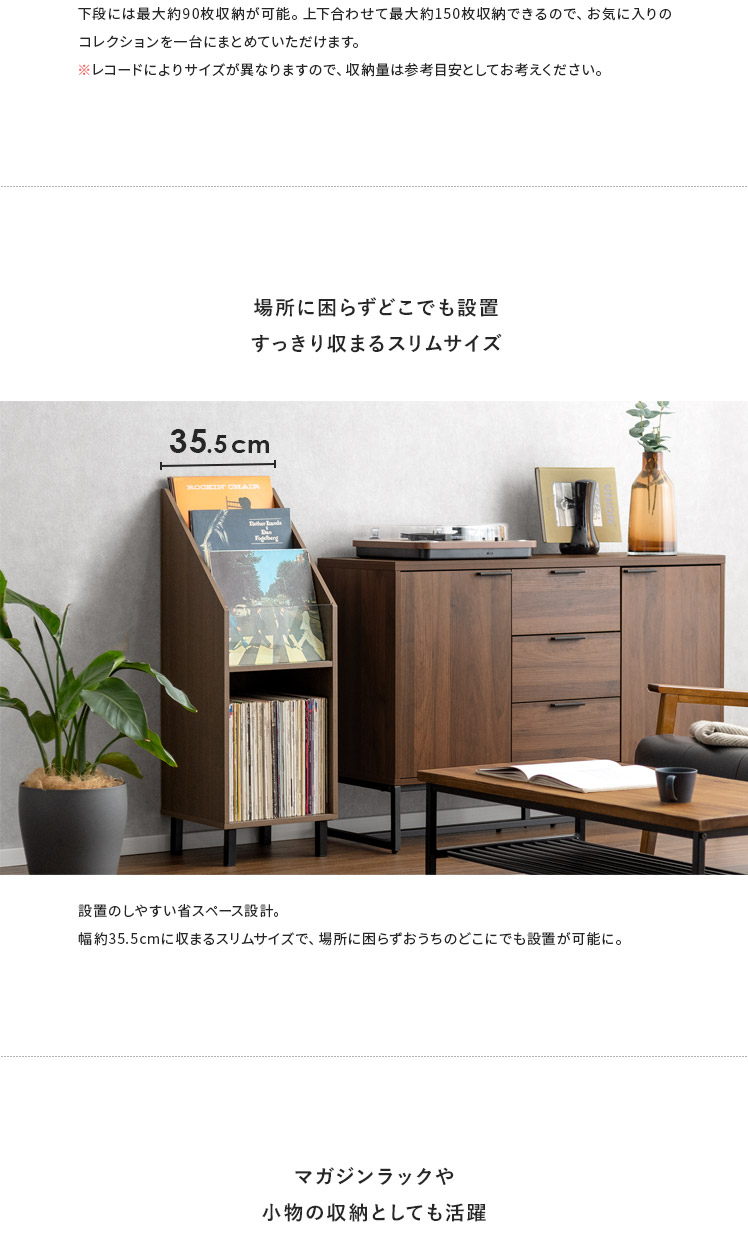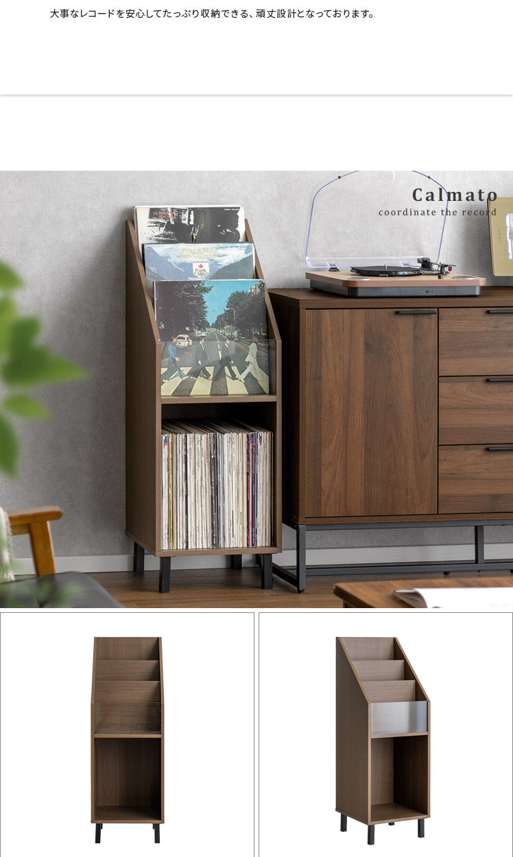 レコードラック Calmato〔カルマート〕/レコードを飾って、お部屋をショップのような空間に。上段はお気に入りのジャケットを飾りながら収納できる、3段の段違い収納。1枚1枚確認しながら探す感覚は、まるでお店で聴きたい音楽を探す時のよう。幅35.5cmと省スペースでありながら、下段のオープン収納と合わせれば、最大150枚のレコードを収納可能。大好きな音楽を嗜む時間を、耳で聴くだけでなく、「見て」「触れて」ゆったりと浸れる時間に。