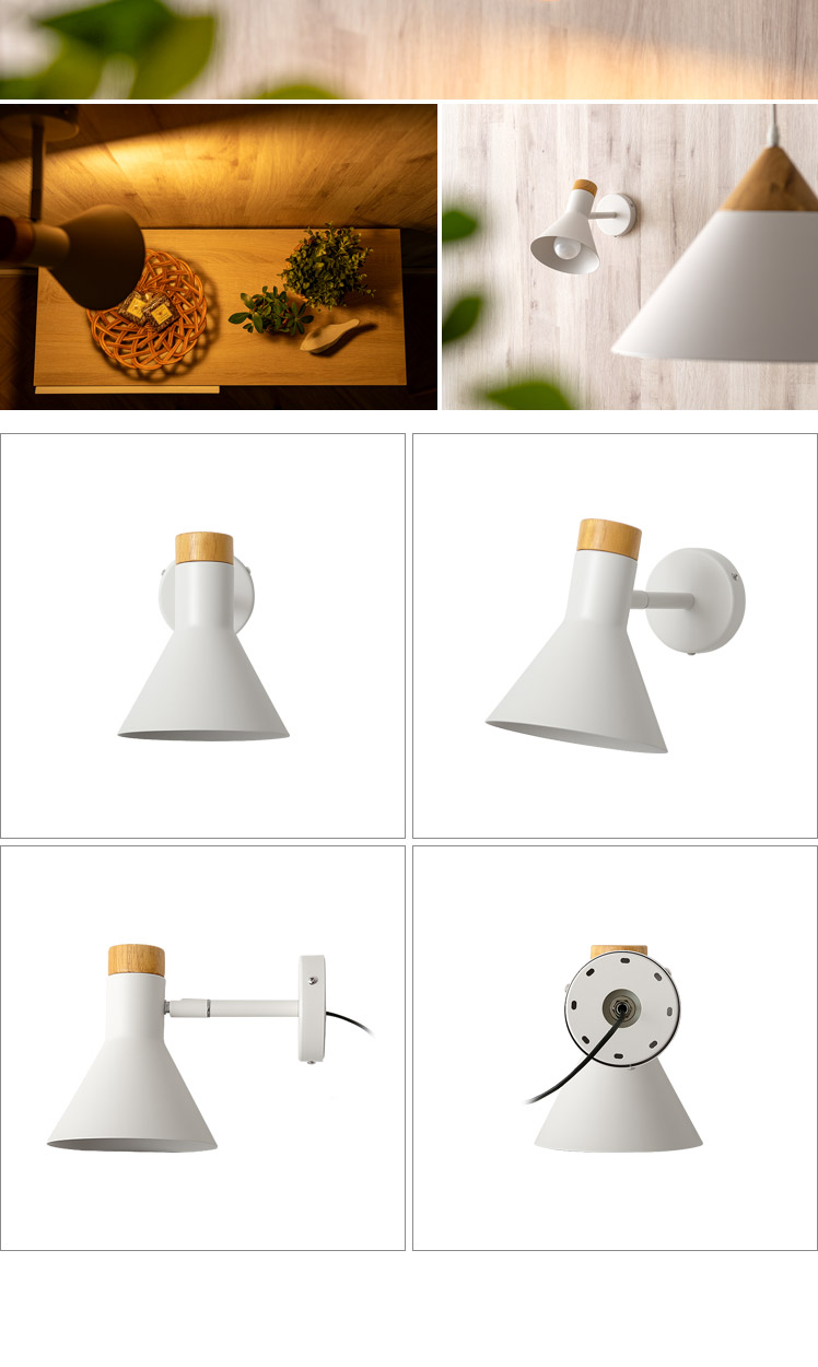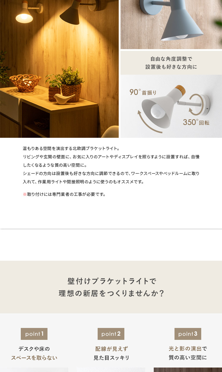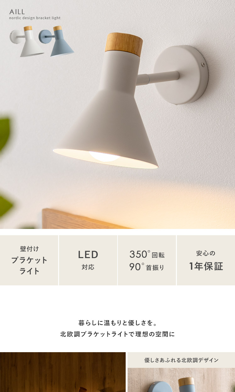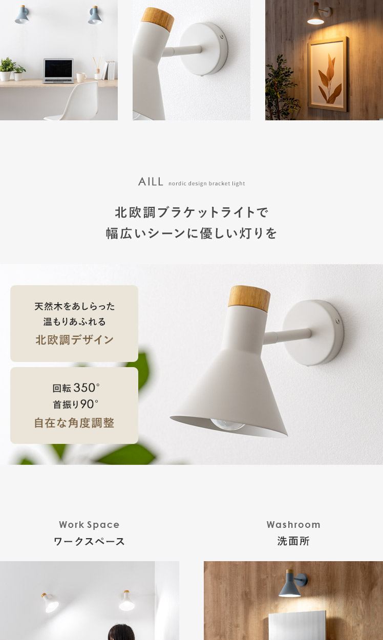 北欧調ブラケットライト AILL〔アイル〕/温もりある空間を演出する北欧調ブラケットライト。リビングや玄関の壁面に、お気に入りのアートやディスプレイを照らすように設置すれば、自慢したくなるような質の高い空間に。シェードの方向は設置後も好きな方向に調節できるので、ワークスペースやベッドルームに取り入れて、作業用ライトや間接照明のように使うのもオススメです。※取り付けには専門業者の工事が必要です。