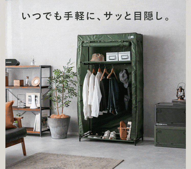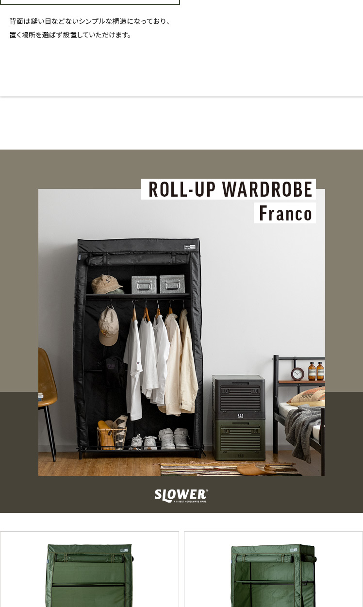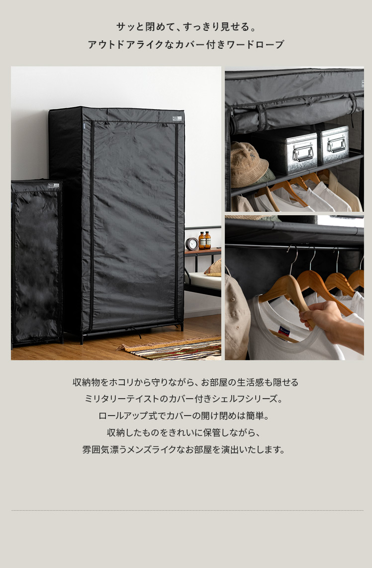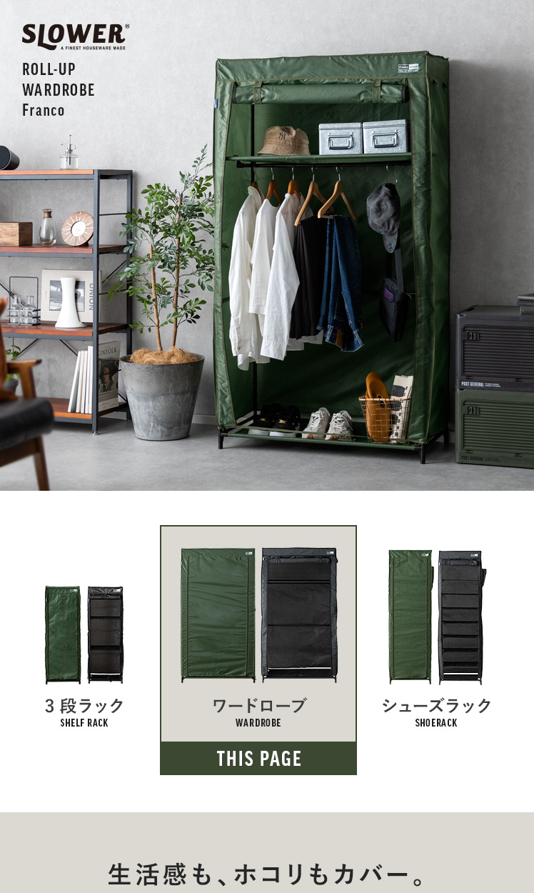 SLOWER ロールアップワードローブ “Franco〔フランコ〕”/収納物をホコリから守りながら、お部屋の生活感も隠せるミリタリーテイストのカバー付きシェルフシリーズ。ロールアップ式でカバーの開け閉めは簡単。収納したものをきれいに保管しながら、雰囲気漂うメンズライクなお部屋を演出いたします。