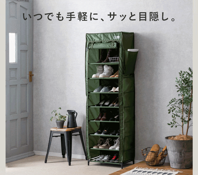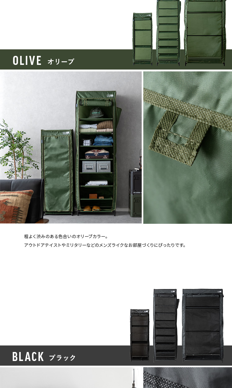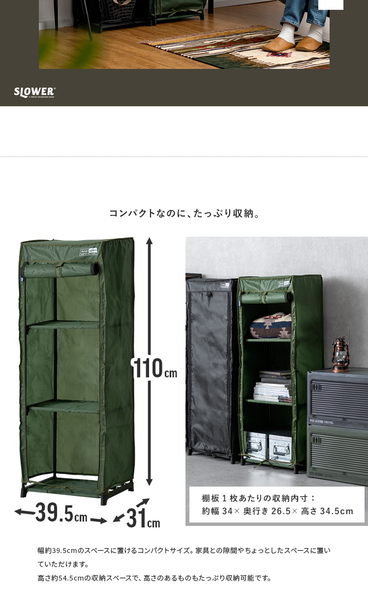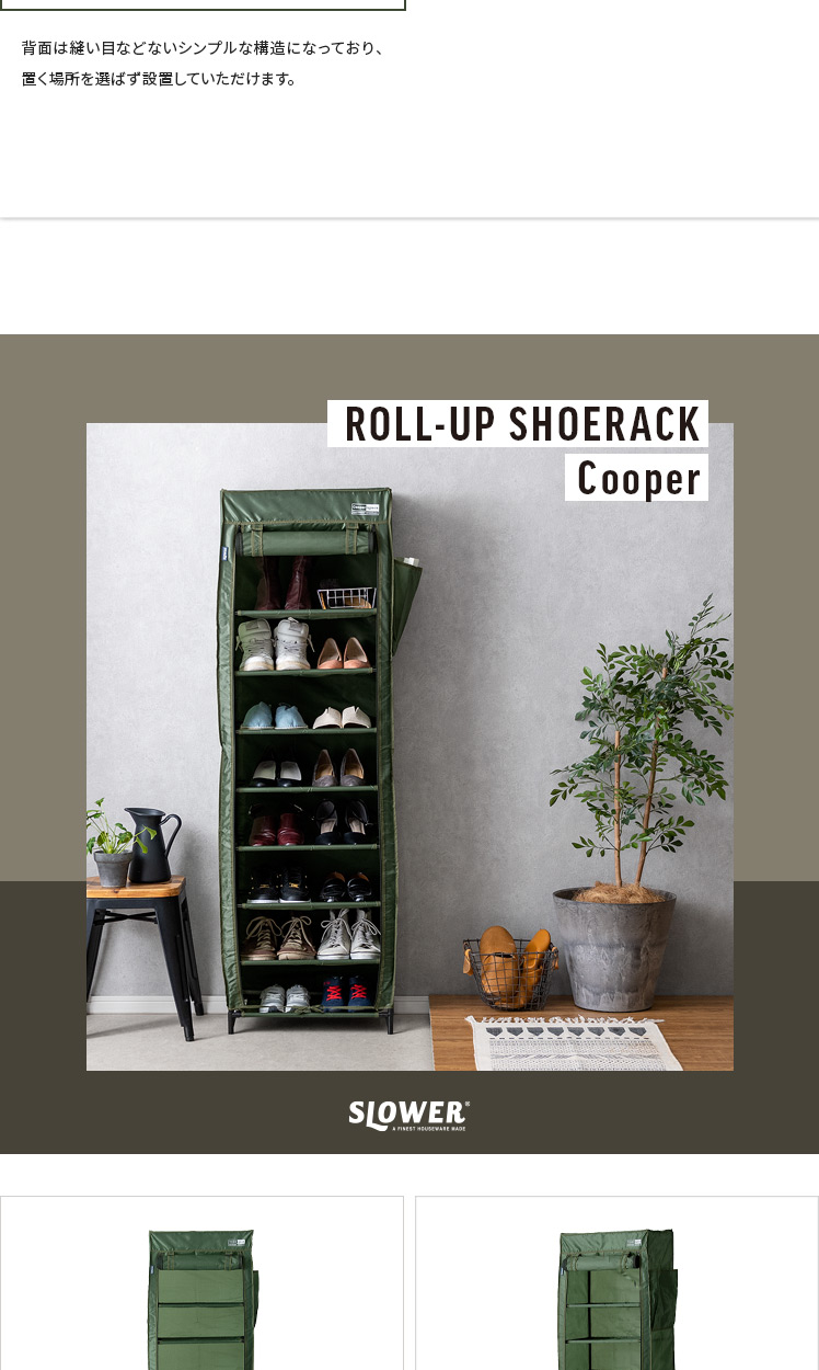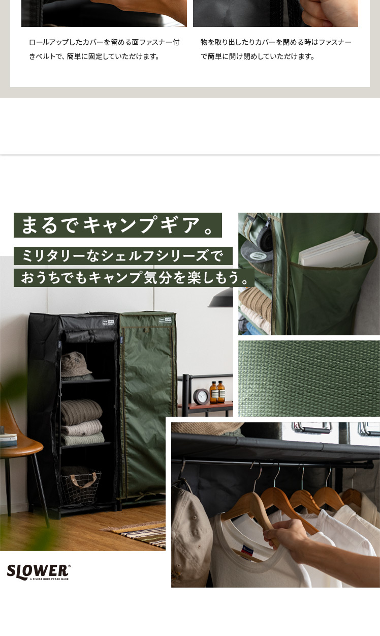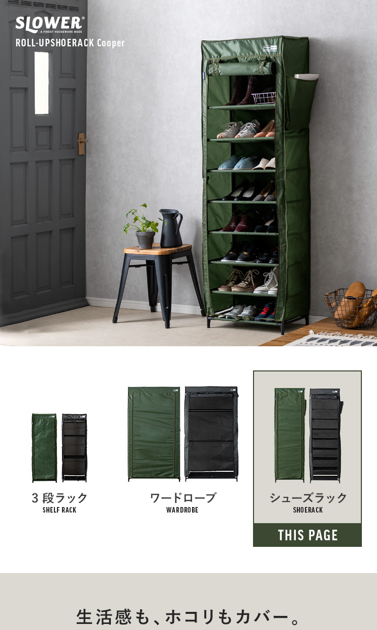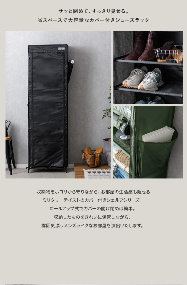 SLOWER ロールアップシューズラック “Cooper〔クーパー〕”/収納物をホコリから守りながら、お部屋の生活感も隠せるミリタリーテイストのカバー付きシェルフシリーズ。ロールアップ式でカバーの開け閉めは簡単。収納したものをきれいに保管しながら、雰囲気漂うメンズライクなお部屋を演出いたします。
