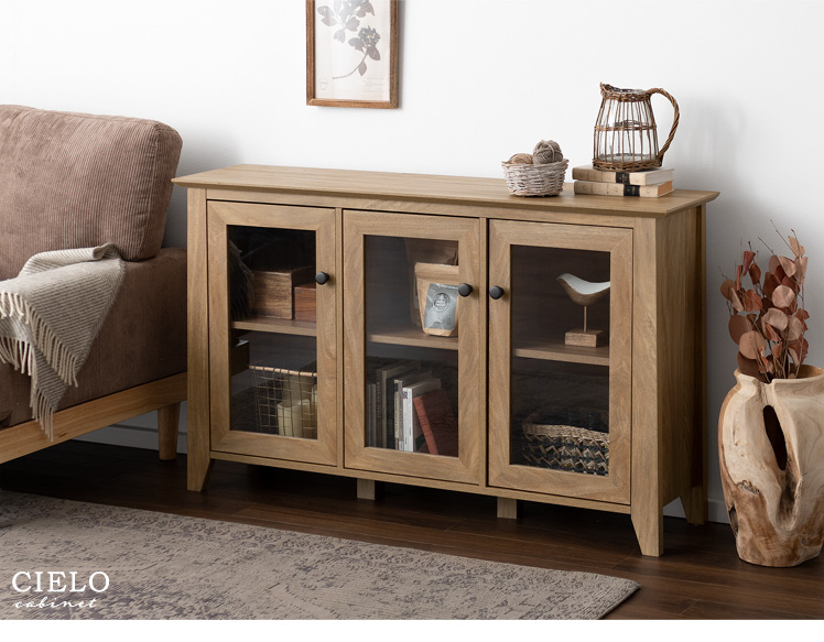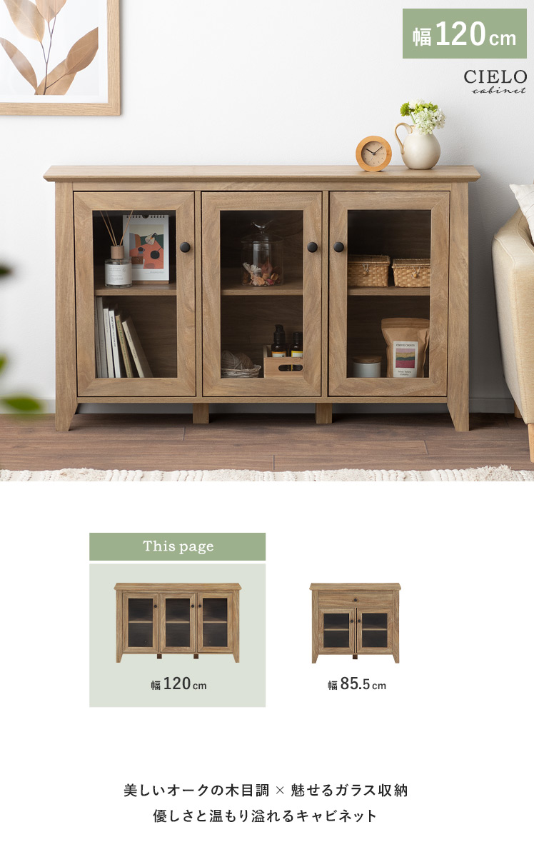 リビングキャビネット 120cm幅タイプ Cielo〔シエロ〕/まるで本物のオーク材のように、美しく温もりある木目模様。収納する雑貨や本を引き立て、より素敵に魅せるキャビネット。目に入るところにお気に入りの雑貨があるのは嬉しいもの。ガラス窓で塵汚れから守りながら、おしゃれにディスプレイ。収納棚は可動式で、アイテムに合わせて高さ調節も可能です。木目調の温もり×お気に入りの小物で、私だけの特別な空間に。