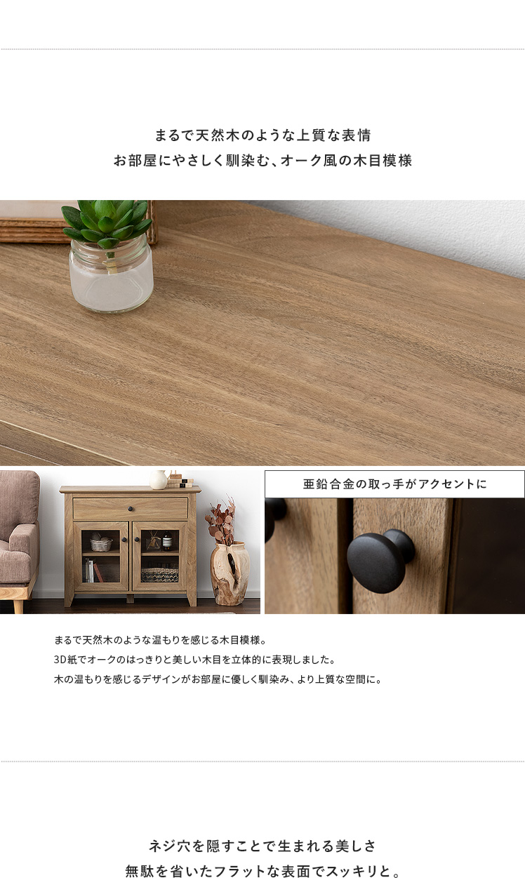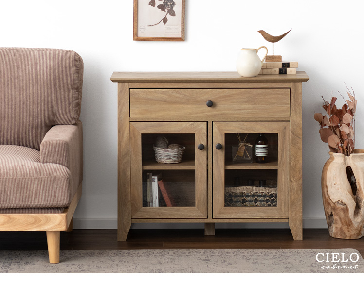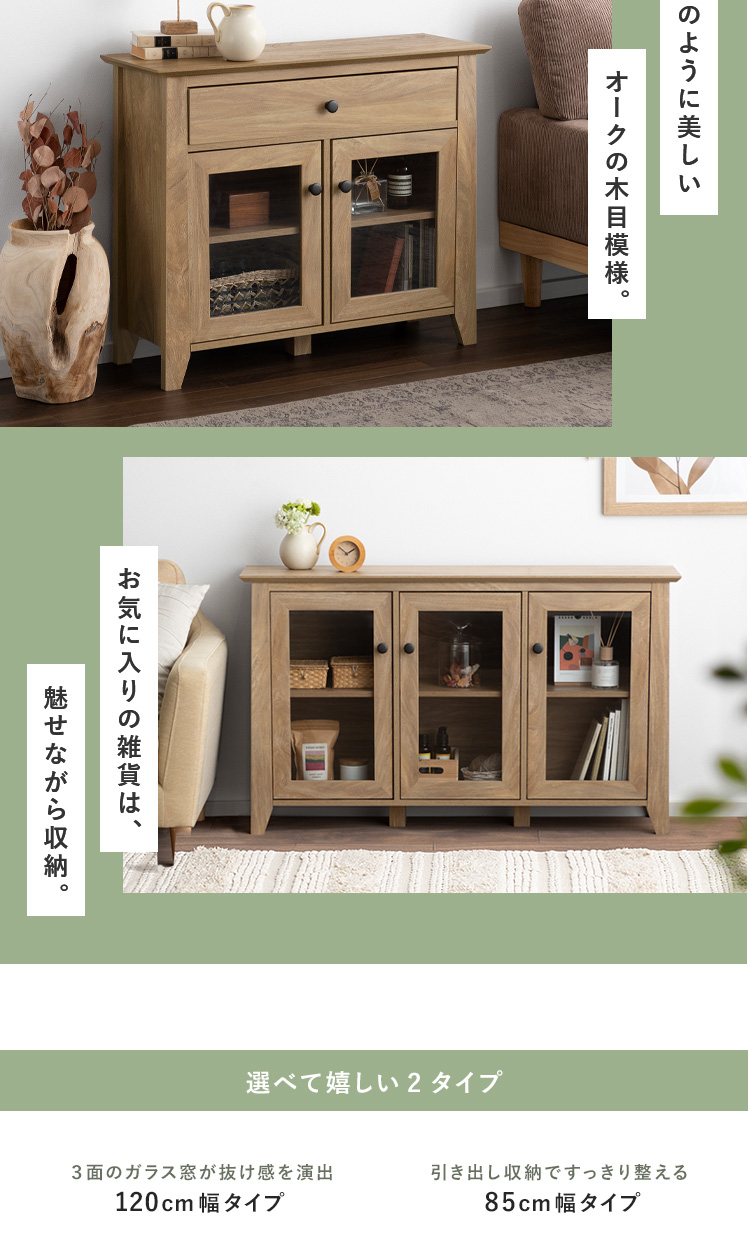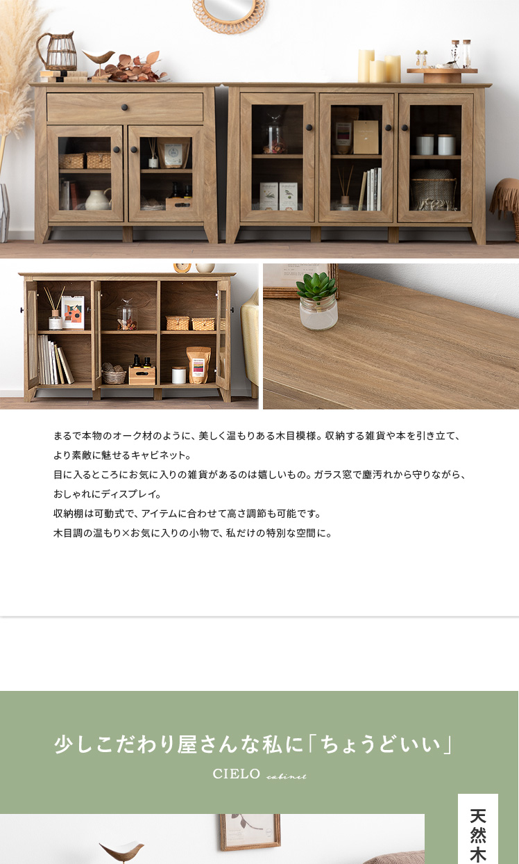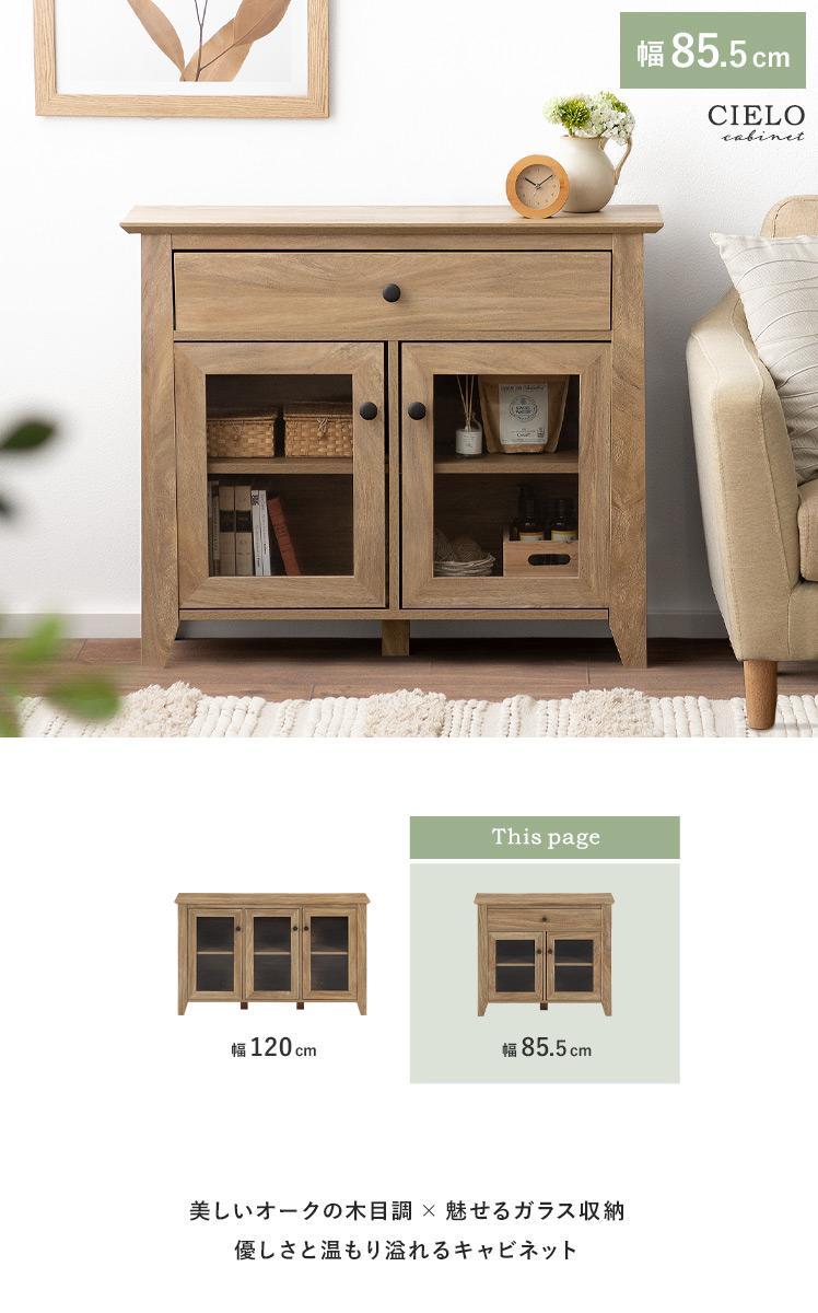 リビングキャビネット 85cm幅タイプ Cielo〔シエロ〕/まるで本物のオーク材のように、美しく温もりある木目模様。収納する雑貨や本を引き立て、より素敵に魅せるキャビネット。目に入るところにお気に入りの雑貨があるのは嬉しいもの。ガラス窓で塵汚れから守りながら、おしゃれにディスプレイ。収納棚は可動式で、アイテムに合わせて高さ調節も可能です。木目調の温もり×お気に入りの小物で、私だけの特別な空間に。