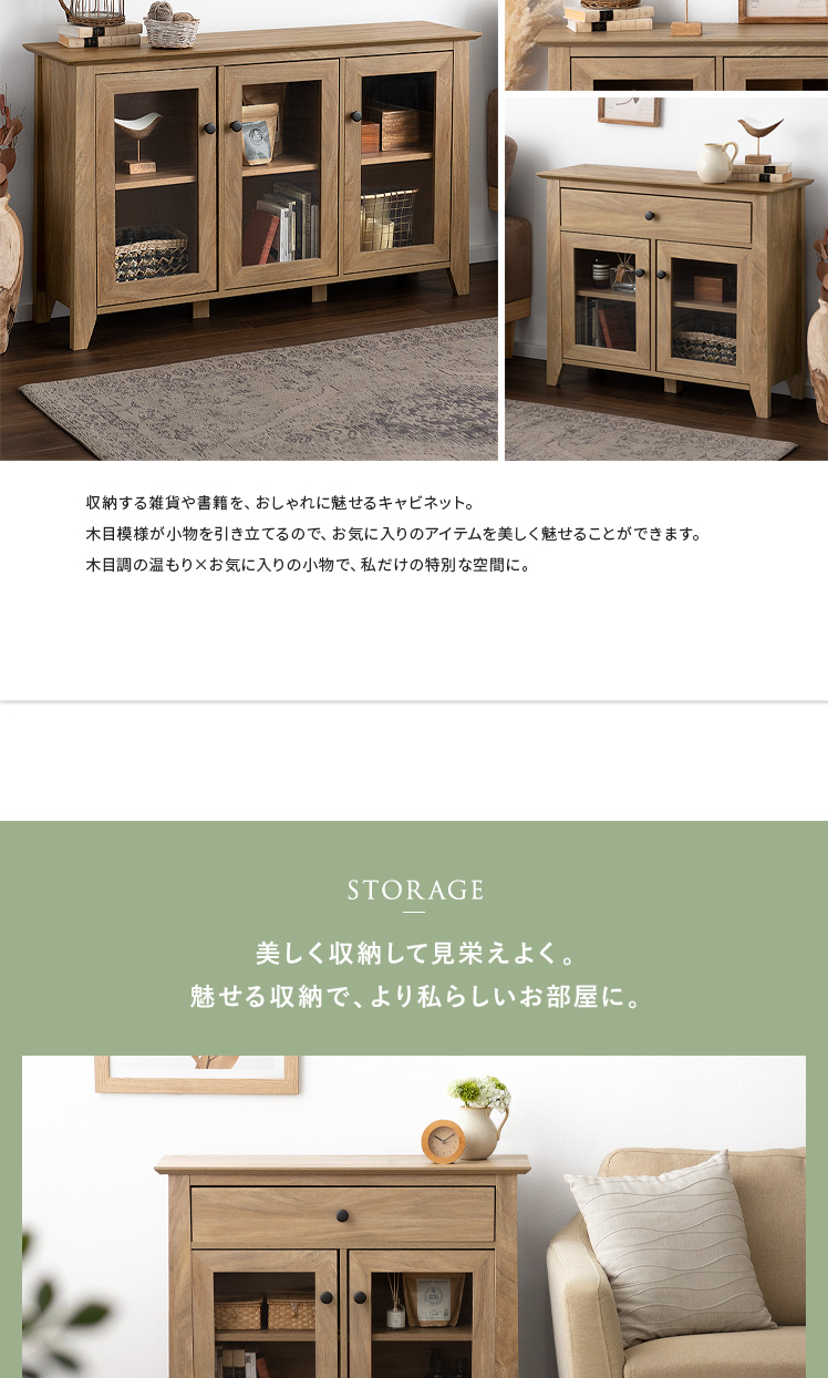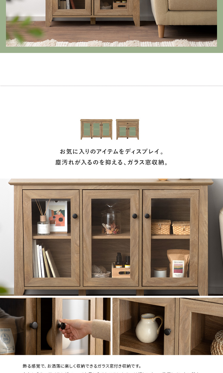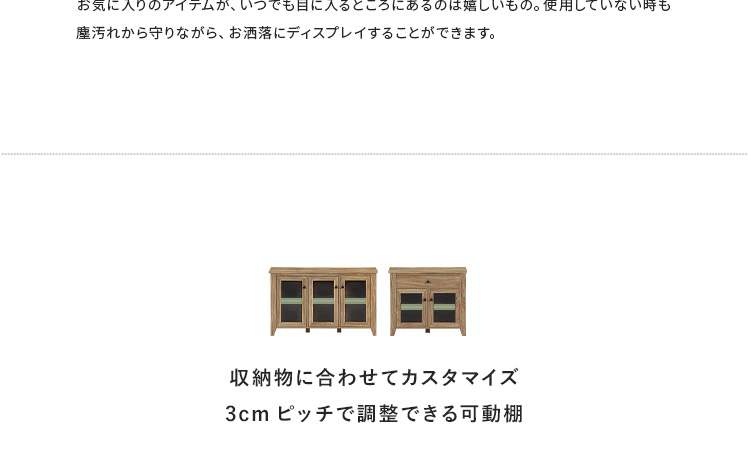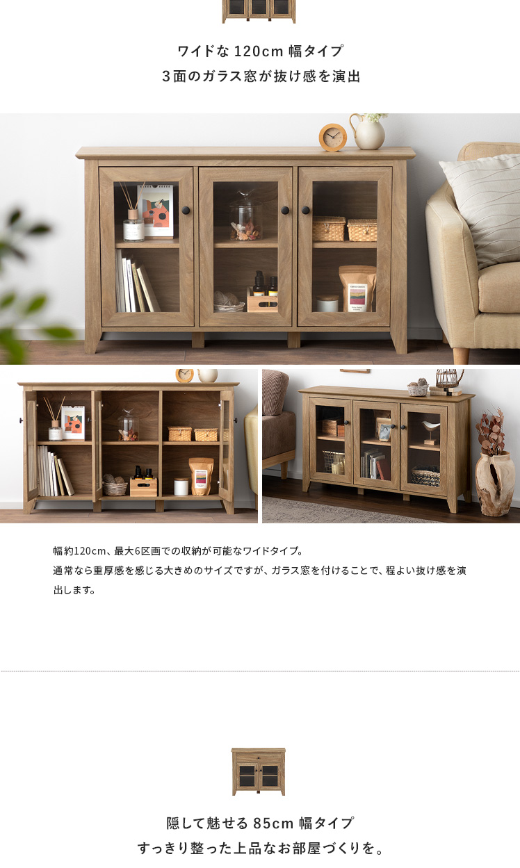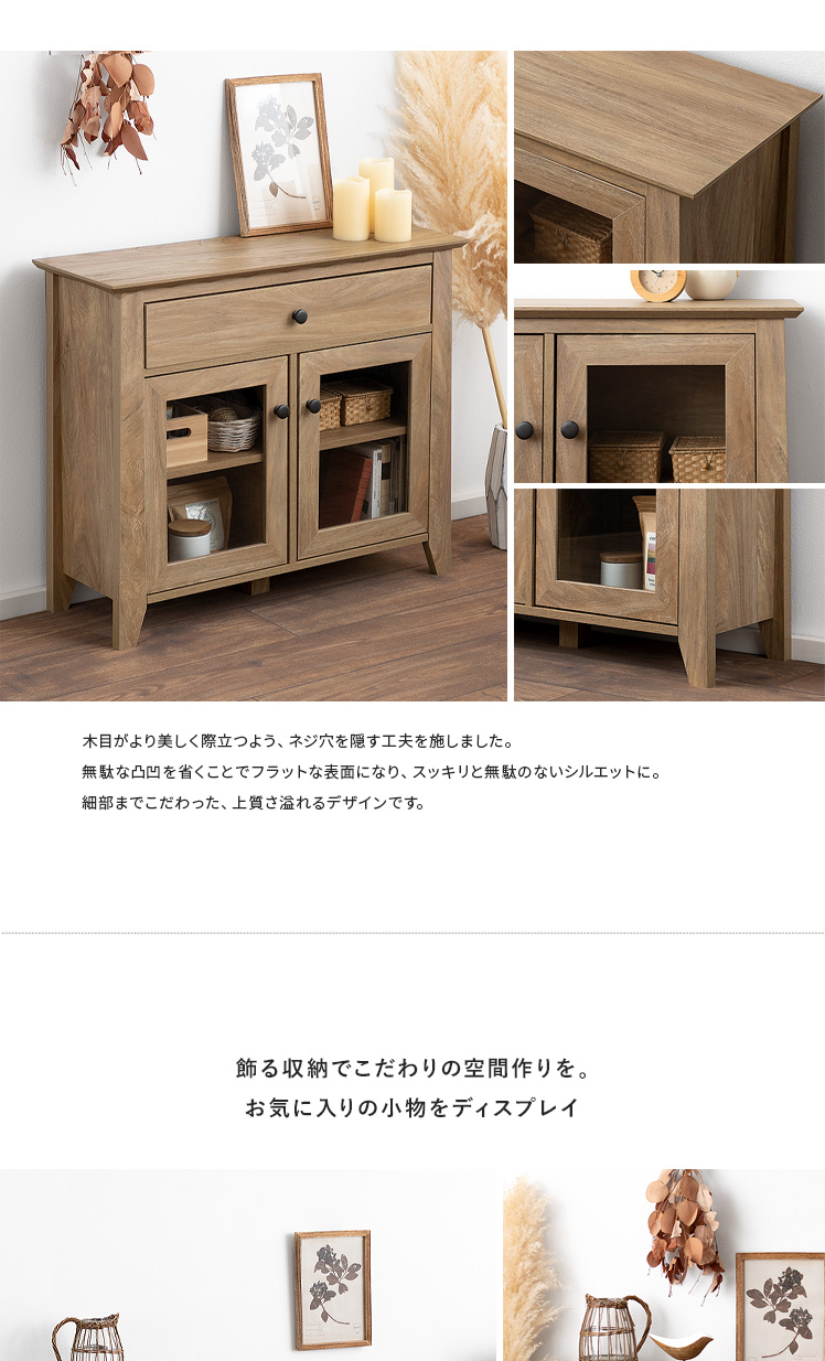 リビングキャビネット 85cm幅タイプ Cielo〔シエロ〕/まるで本物のオーク材のように、美しく温もりある木目模様。収納する雑貨や本を引き立て、より素敵に魅せるキャビネット。目に入るところにお気に入りの雑貨があるのは嬉しいもの。ガラス窓で塵汚れから守りながら、おしゃれにディスプレイ。収納棚は可動式で、アイテムに合わせて高さ調節も可能です。木目調の温もり×お気に入りの小物で、私だけの特別な空間に。