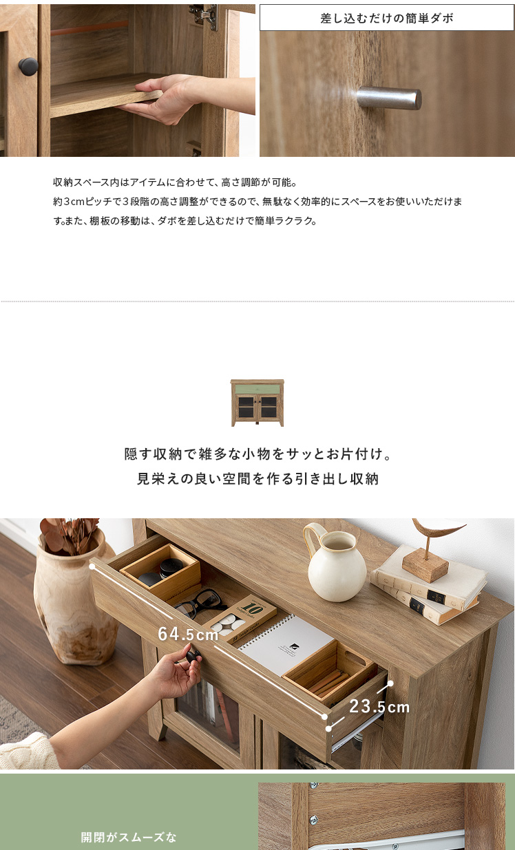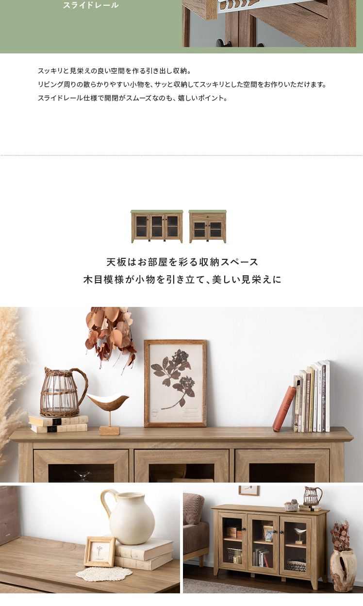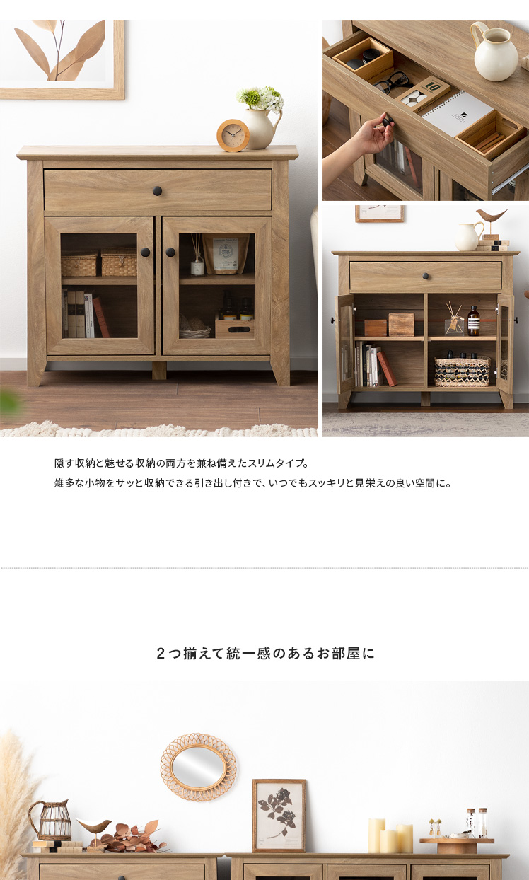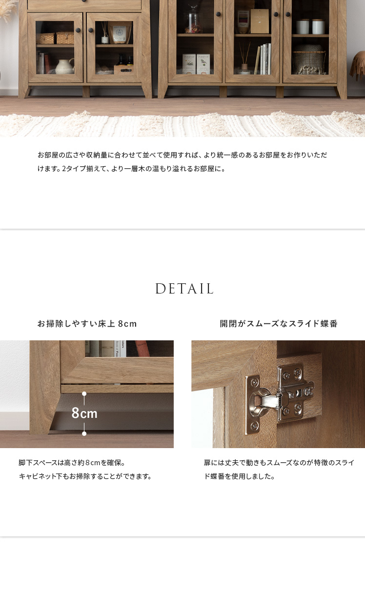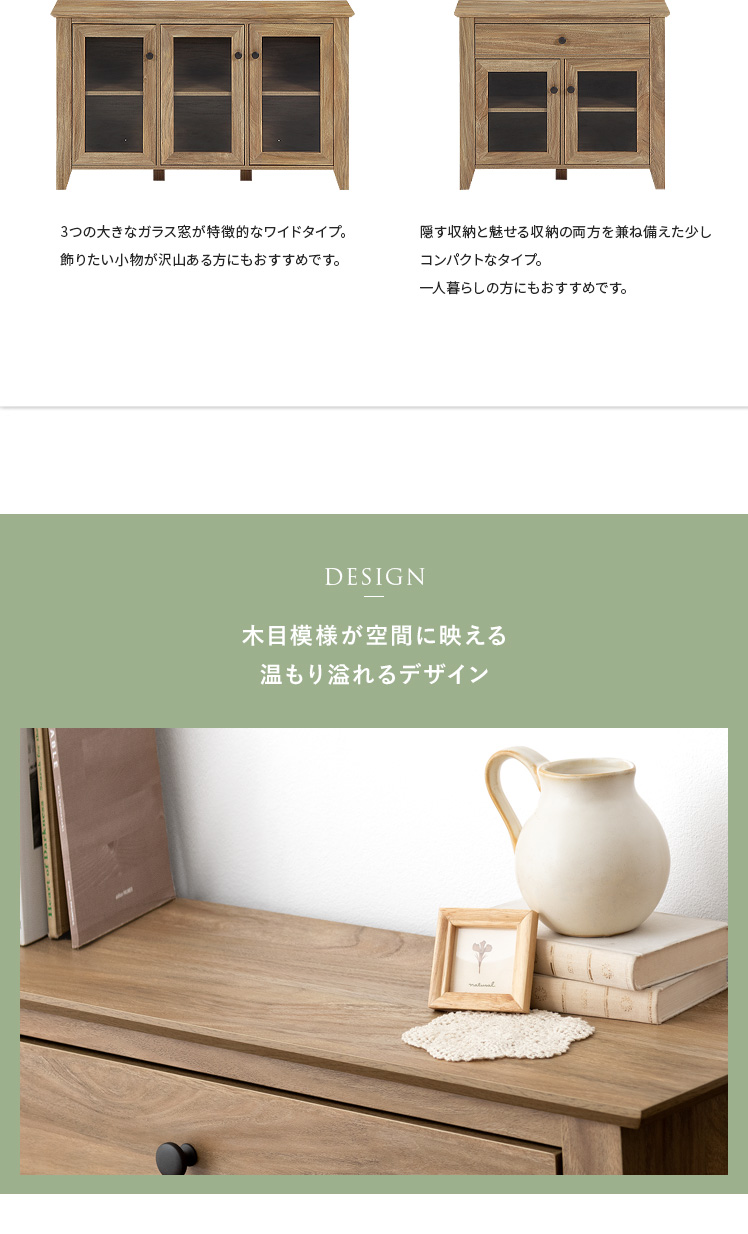 リビングキャビネット 85cm幅タイプ Cielo〔シエロ〕/まるで本物のオーク材のように、美しく温もりある木目模様。収納する雑貨や本を引き立て、より素敵に魅せるキャビネット。目に入るところにお気に入りの雑貨があるのは嬉しいもの。ガラス窓で塵汚れから守りながら、おしゃれにディスプレイ。収納棚は可動式で、アイテムに合わせて高さ調節も可能です。木目調の温もり×お気に入りの小物で、私だけの特別な空間に。