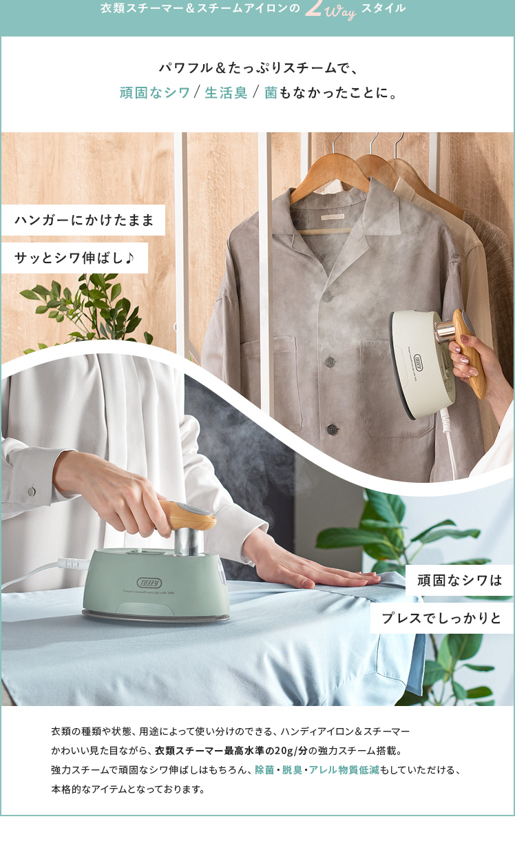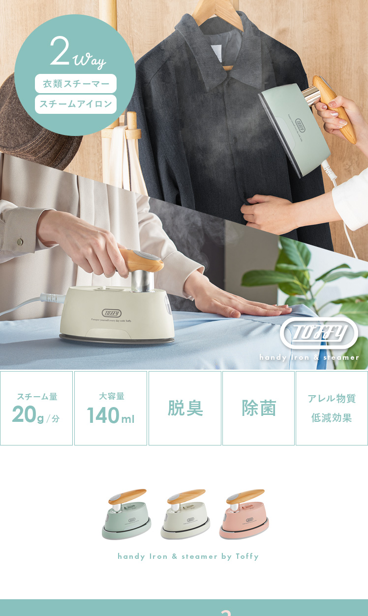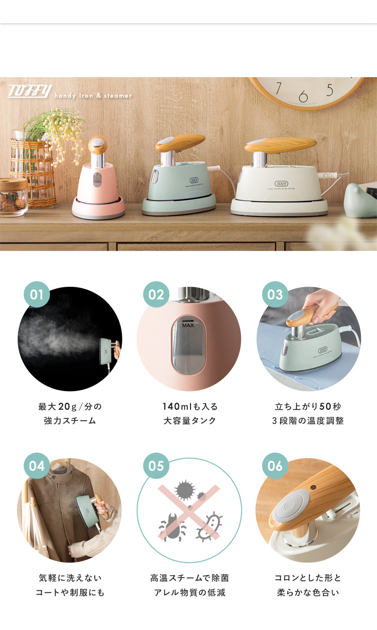ハンディアイロン&スチーマー Toffy〔トフィー〕/衣類の種類や状態、用途によって使い分けのできる、ハンディアイロン&スチーマーかわいい見た目ながら、衣類スチーマー最高水準の20g/分の強力スチーム搭載。強力スチームで頑固なシワ伸ばしはもちろん、除菌・脱臭・アレル物質低減もしていただける、本格的なアイテムとなっております。