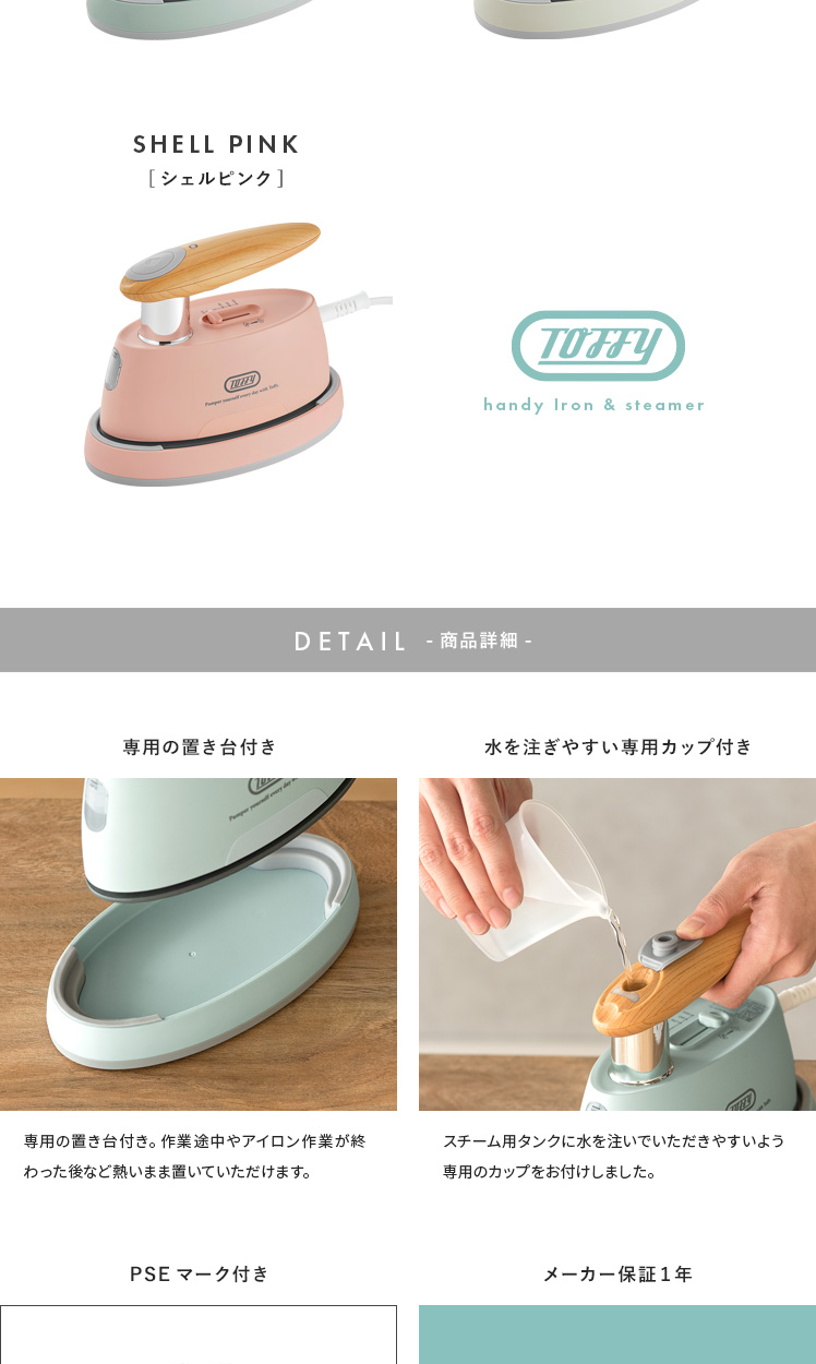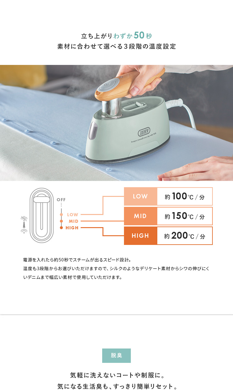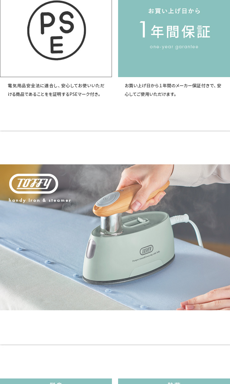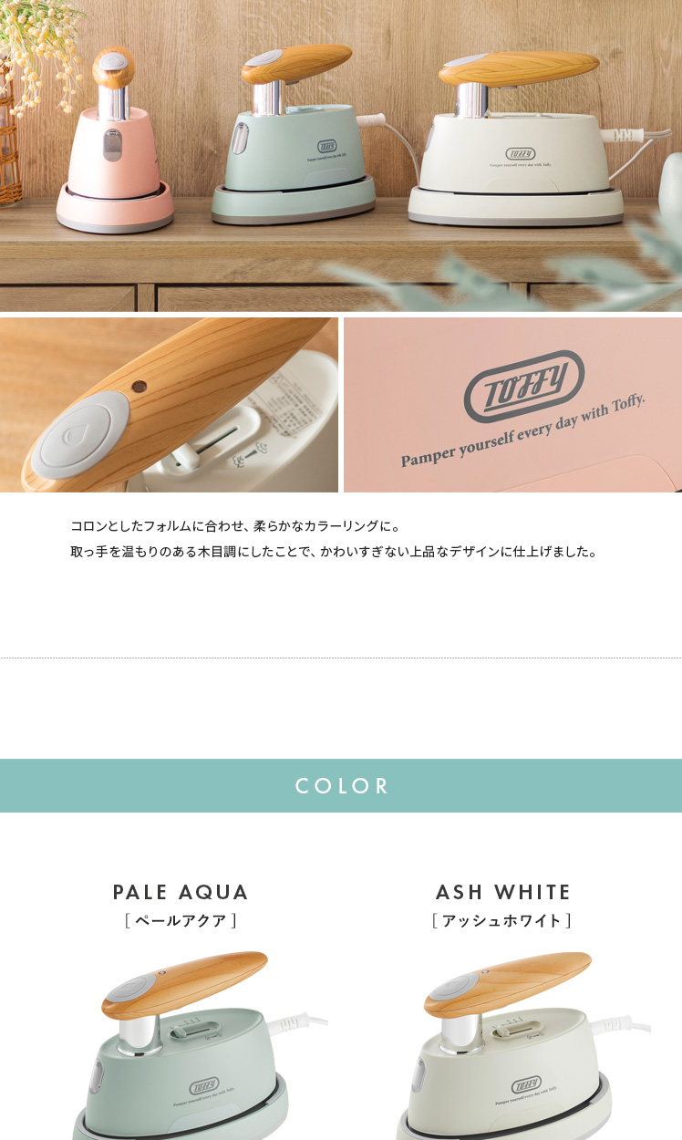 ハンディアイロン&スチーマー Toffy〔トフィー〕/衣類の種類や状態、用途によって使い分けのできる、ハンディアイロン&スチーマーかわいい見た目ながら、衣類スチーマー最高水準の20g/分の強力スチーム搭載。強力スチームで頑固なシワ伸ばしはもちろん、除菌・脱臭・アレル物質低減もしていただける、本格的なアイテムとなっております。