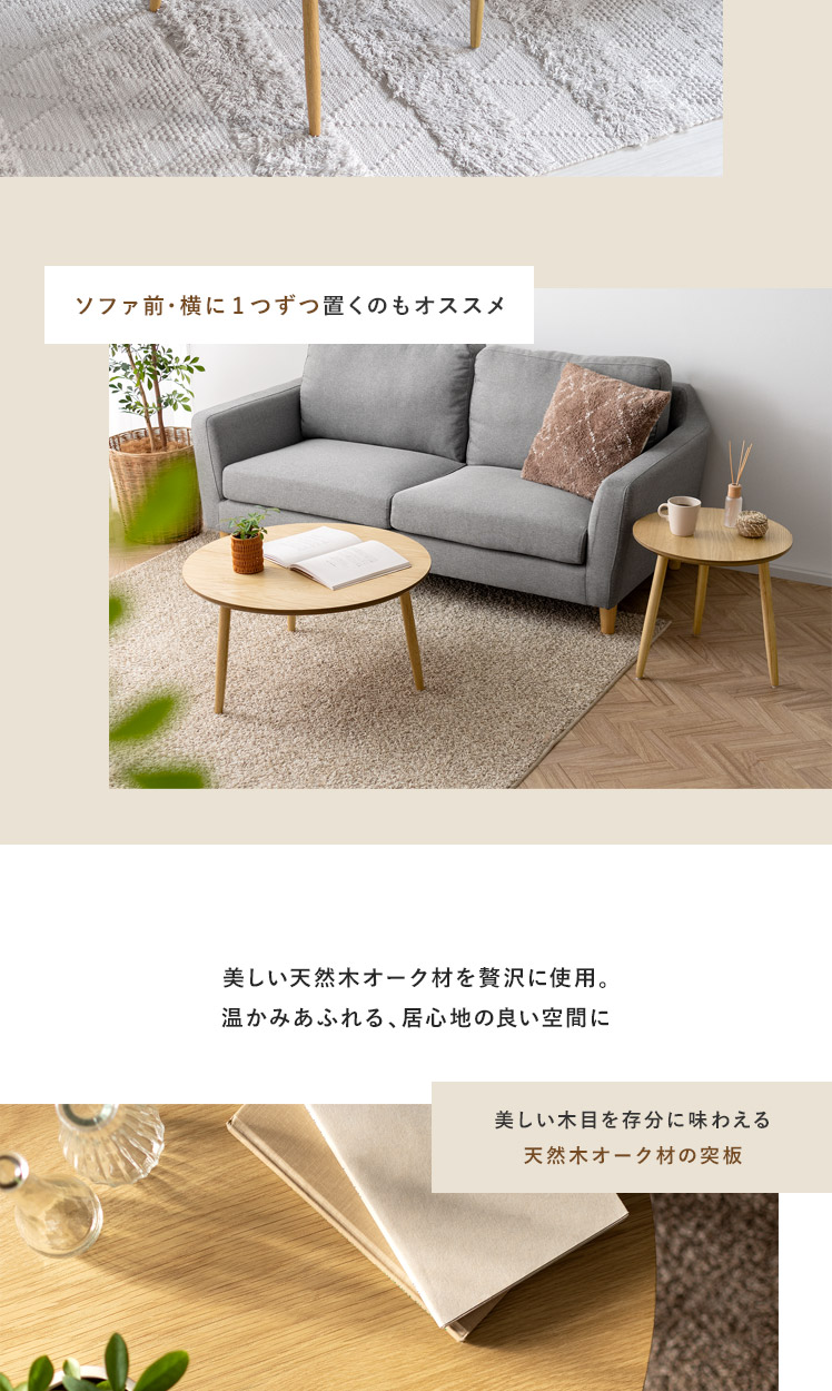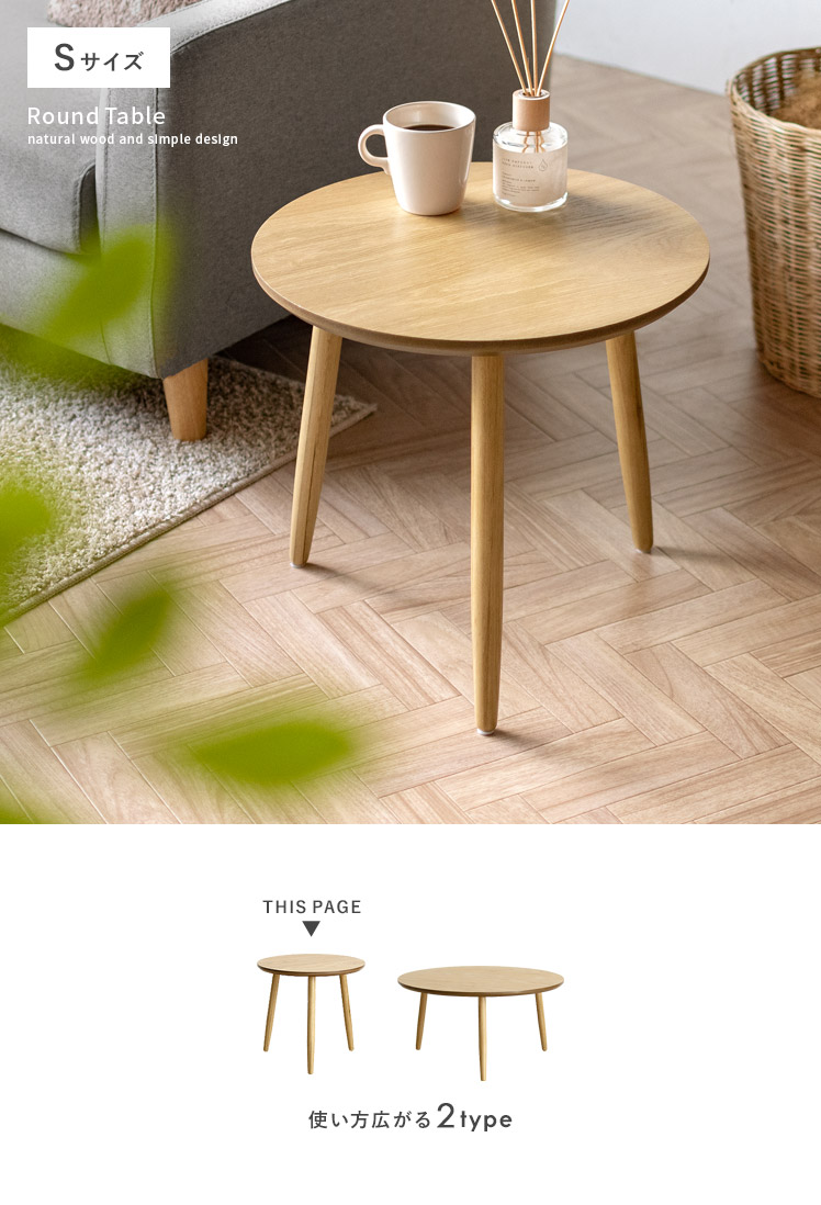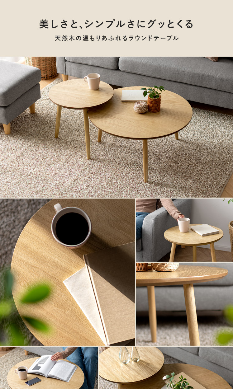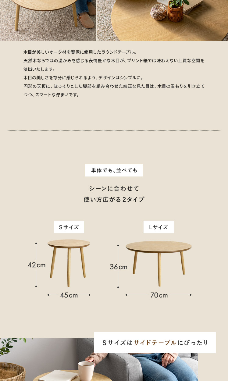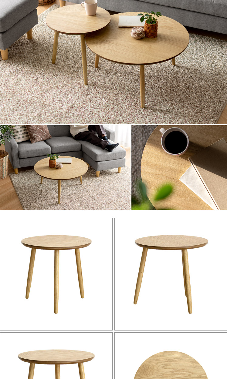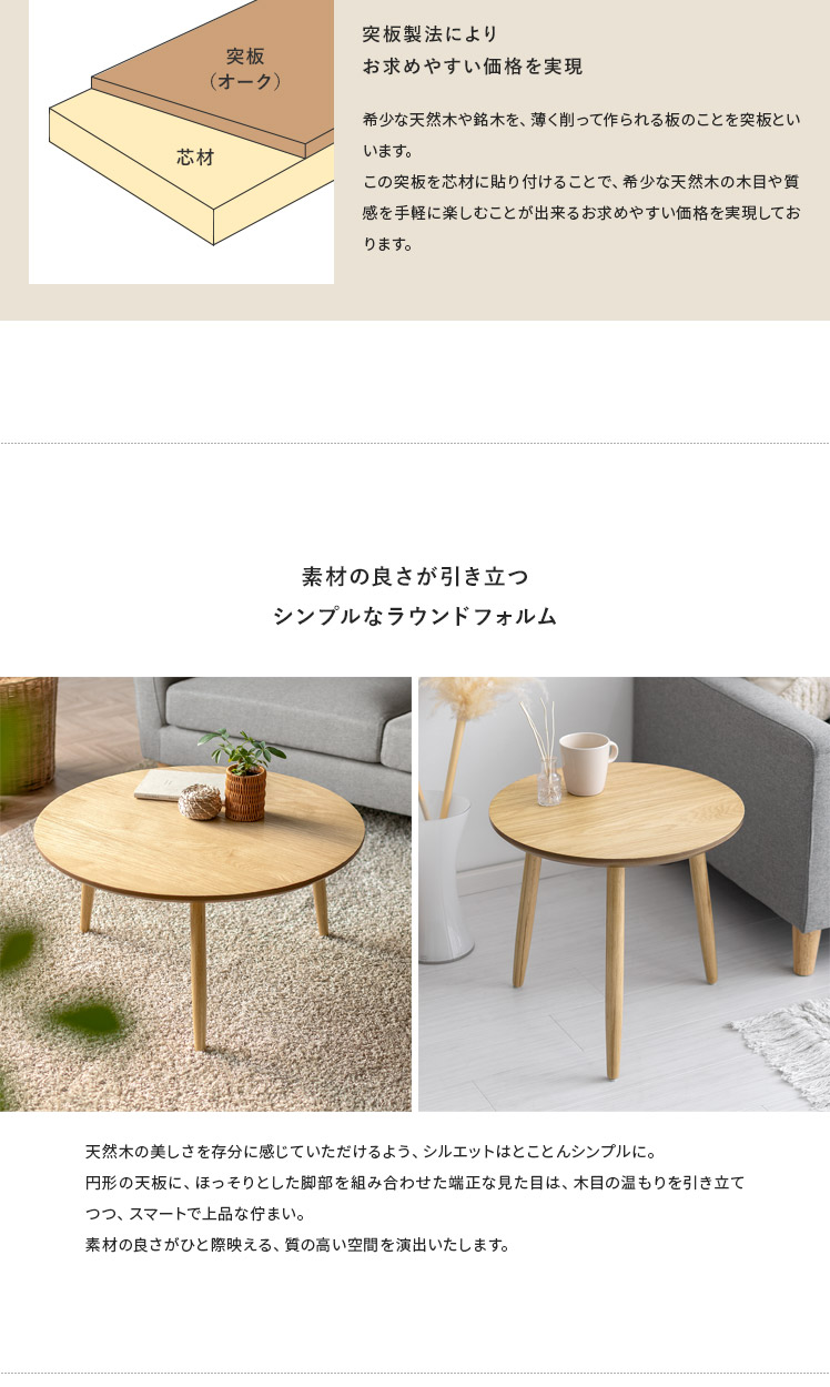 天然木ラウンドテーブル Sサイズ/木目が美しいオーク材を贅沢に使用したラウンドテーブル。天然木ならではの温かみを感じる表情豊かな木目が、プリント紙では味わえない上質な空間を演出いたします。木目の美しさを存分に感じられるよう、デザインはシンプルに。円形の天板に、ほっそりとした脚部を組み合わせた端正な見た目は、木目の温もりを引き立てつつ、スマートな佇まいです。
